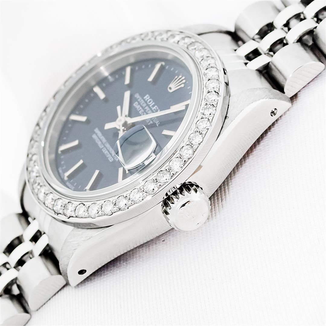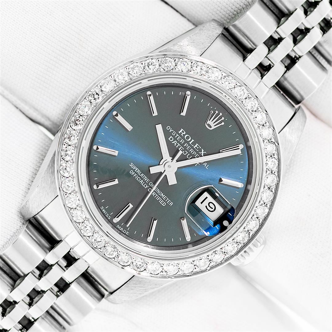 One Ladies Pre Owned Stainless Steel Rolex Datejust Polished Bright with Satin Finish Serviced & Electronically Tested, Rolex Stainless Steel Case: 26mm, Rolex Stainless Steel Crown, Custom Bezel: New Stainless Steel Beadset Diamond Bezel, Diamond Count: 40 Diamonds On Bezel Dial. Custom Crystal: New Sapphire With Date Window. Custom Hands: New Luminescent Hands. Rolex Movement: Automatic Winding Movement. Rolex Dial: Blue Index Dial With Dash Track. Date Window: 3 O'Clock Position Date Display, Model: Datejust. Condition: G-6 Extra Fine. Rolex Bracelet: Stainless Steel Jubilee Band With Rolex Crown On Buckle. Bright Polish & Satin Finish. Band Length: 6.0 Inch Length, Adjustable. Standard Clasp, With Rolex Logo. This Watch Has Been Serviced Time Tested And Is In Excellent Condition It Is Free Of All Scratches And Dents.