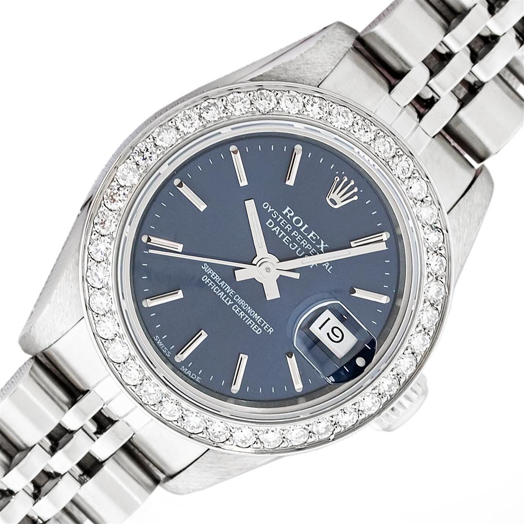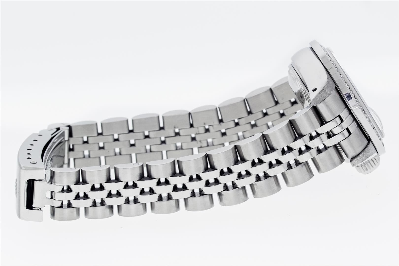 One Ladies Pre Owned Stainless Steel Rolex Datejust Polished Bright with Satin Finish Serviced & Electronically Tested, Rolex Stainless Steel Case: 26mm, Rolex Stainless Steel Crown, Custom Bezel: New Stainless Steel Beadset Diamond Bezel, Diamond Count: 40 Diamonds On Bezel Dial. Custom Crystal: New Sapphire With Date Window. Custom Hands: New Luminescent Hands. Rolex Movement: Automatic Winding Movement. Rolex Dial: Blue Index Dial With Dash Track. Date Window: 3 O'Clock Position Date Display, Model: Datejust. Condition: G-6 Extra Fine. Rolex Bracelet: Stainless Steel Jubilee Band With Rolex Crown On Buckle. Bright Polish & Satin Finish. Band Length: 6.0 Inch Length, Adjustable. Standard Clasp, With Rolex Logo. This Watch Has Been Serviced Time Tested And Is In Excellent Condition It Is Free Of All Scratches And Dents.