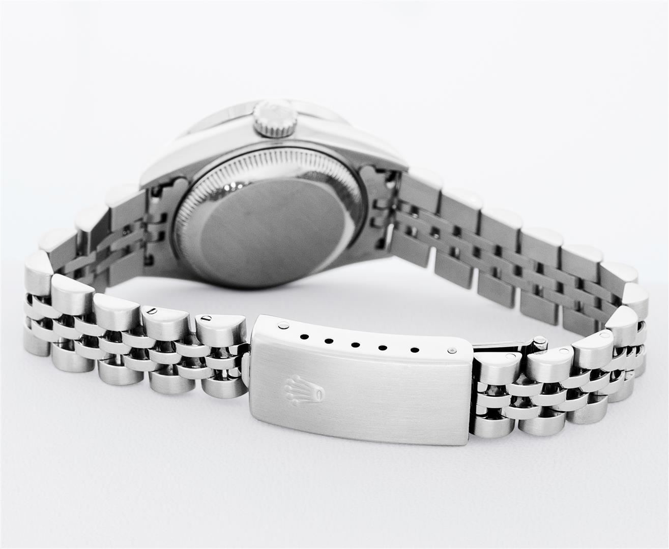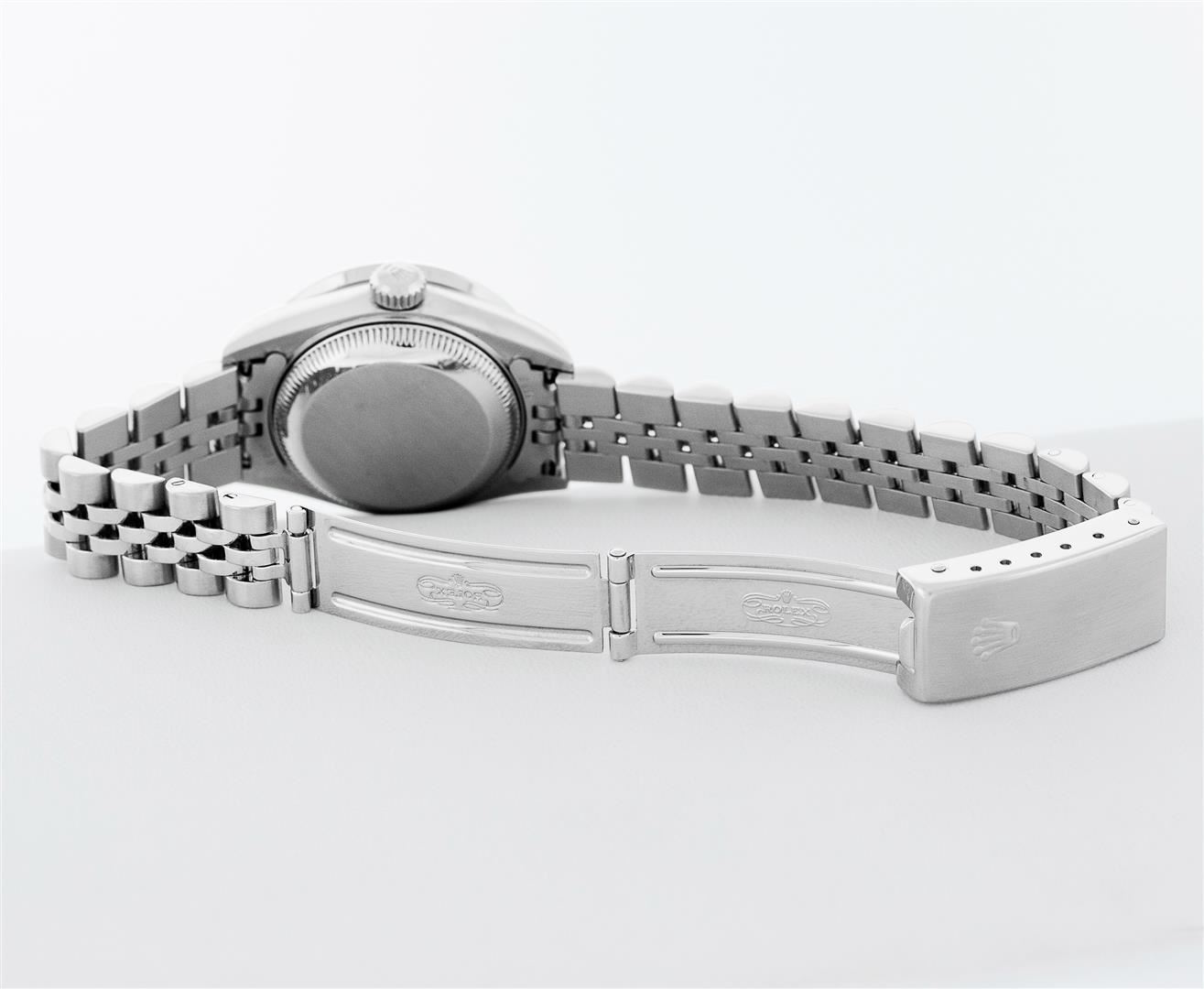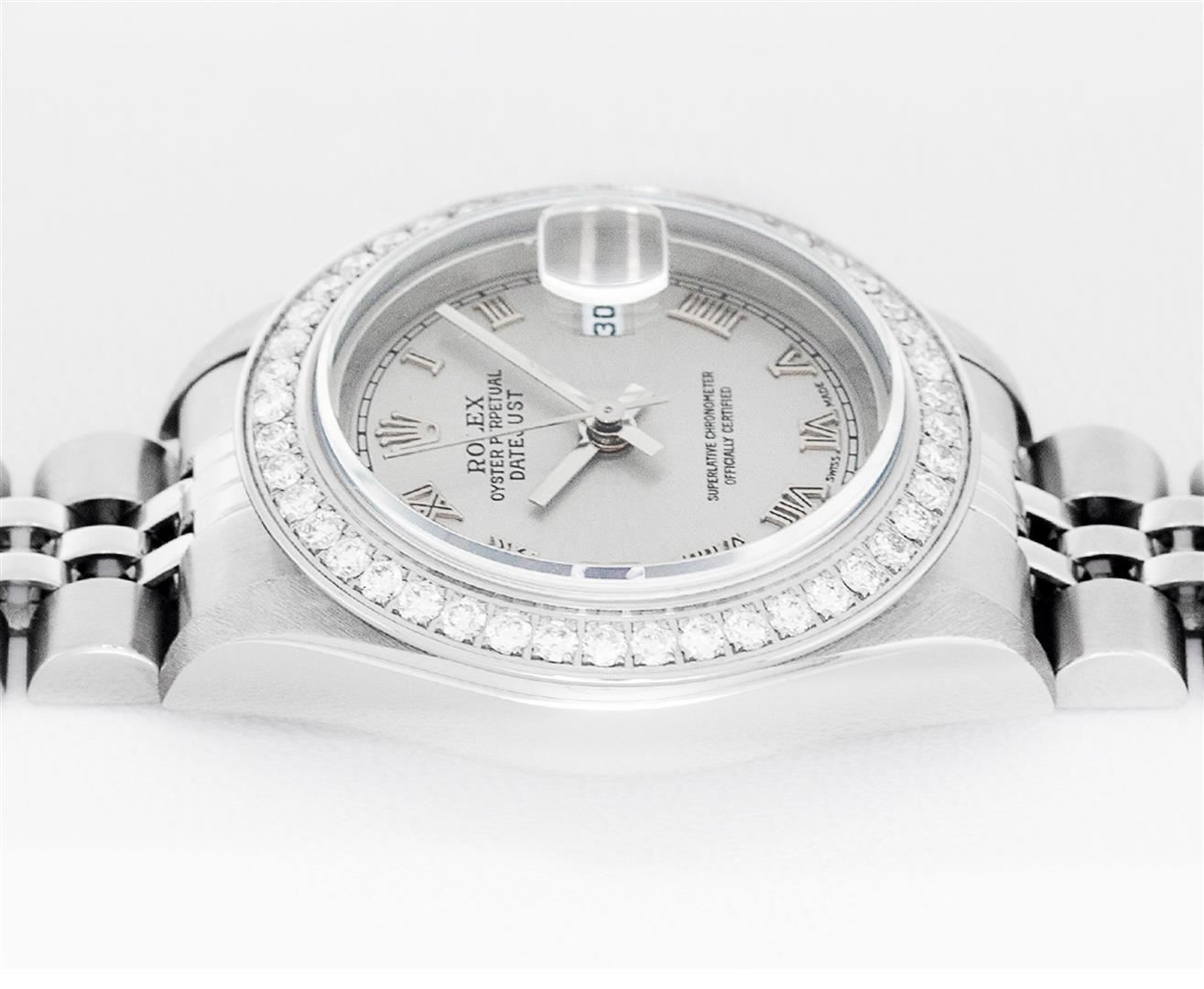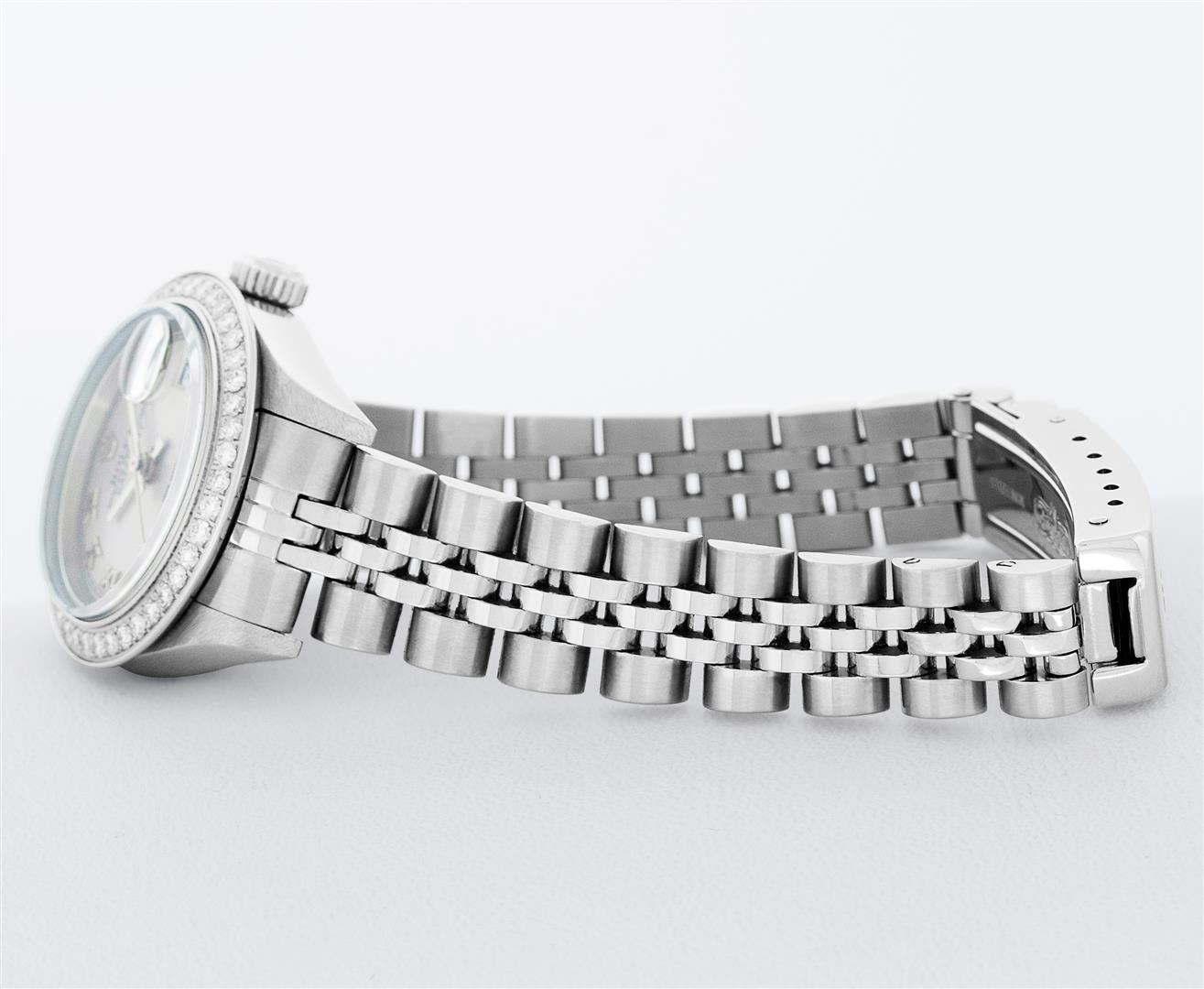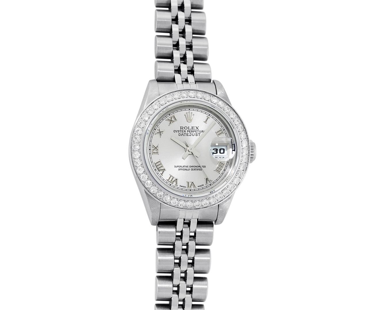 One Ladies Pre Owned Quickset Stainless Steel Rolex Datejust Polished Bright with Satin Finish, Serviced & Electronically Tested, Rolex Stainless Steel Case: 26mm. Rolex Stainless Steel Crown, Custom Bezel: New Stainless Steel Beadset Diamond Bezel, Stone Count: 32 Diamonds On Bezel, Diamond Color: G To H, Clarity: SI-VS. Custom Crystal: New Sapphire With Magnified Date Window. Custom Hands: New Hands. Rolex Movement: Quickset Automatic Winding Movement 2230. Rolex Dial: Gray Roman With Square Track. Date Window: 3 O'Clock Position Date Display, Model: Sapphire Quickset Datejust. Condition: G-6 Extra Fine. Rolex Bracelet: Stainless Steel Jubilee Band. Bright Polish & Satin Finish. 6.0 Inch Length, Adjustable. Standard Clasp, With Rolex Logo. This Watch Has Been Serviced Time Tested And Is In Excellent Condition It Is Free Of All Scratches And Dents.