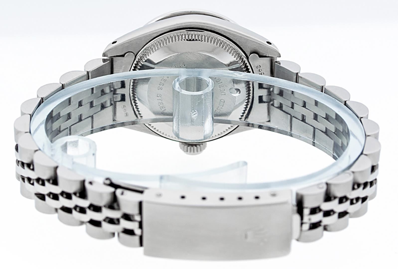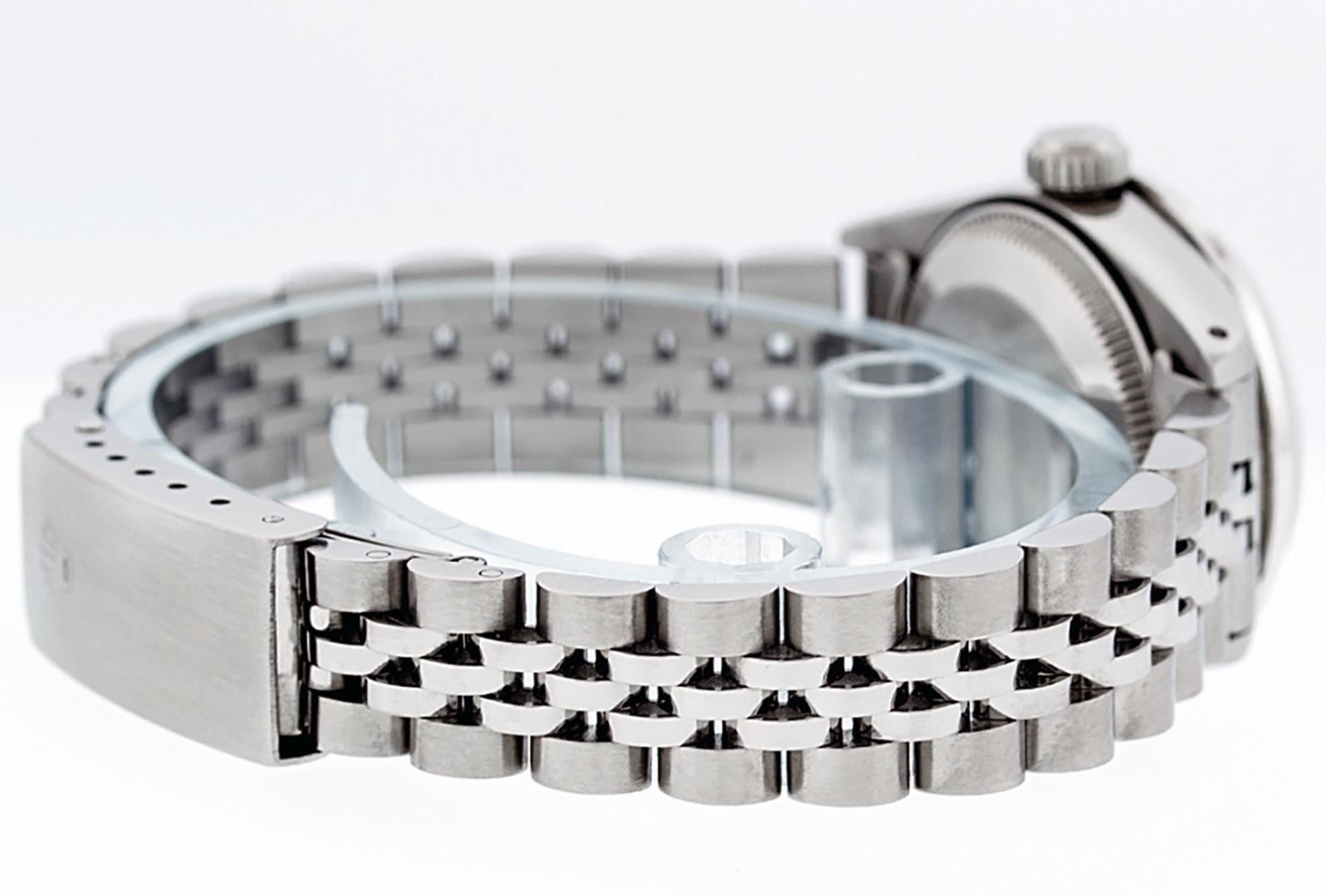 One Ladies Pre Owned Quickset Stainless Steel Rolex Datejust Polished Bright with Satin Finish, Serviced And Electronically Tested, Stainless Steel Case: 26mm, Stainless Steel Crown, Custom Bezel: New 18K White Gold Ruby Beadset Diamond Bezel, Diamond + Gem Count: 28 Diamonds + 4 Rubies. Custom Crystal: New Sapphire With Date Window. Custom Hands: New Luminescent Hands. Rolex Movement: Automatic Winding Movement 2135. Custom Dial: Custom Red Vignette Dial With Diamond Hour Markers, 10 Diamond On Dial. Date Window: 3 O'Clock Position Date Display, Model: Datejust. Condition: G-6 Extra Fine. Rolex Bracelet: Stainless Steel Jubilee Band. Bright Polish And Satin Finish. 6.0 Inch Length, Adjustable. Standard Clasp, With Rolex Logo. This Watch Has Been Serviced Time Tested And Is In Excellent Condition It Is Free Of All Scratches And Dents.