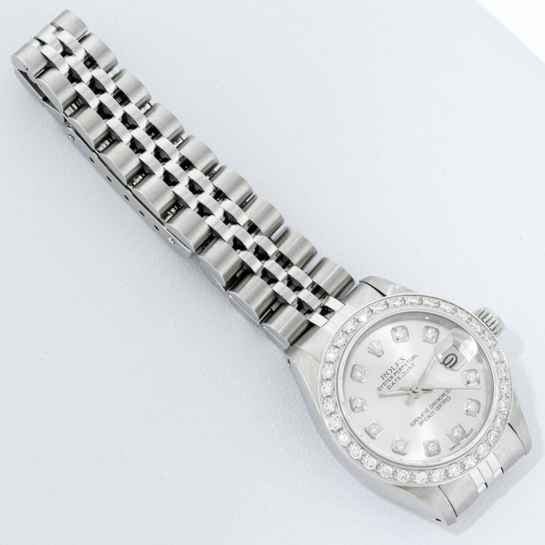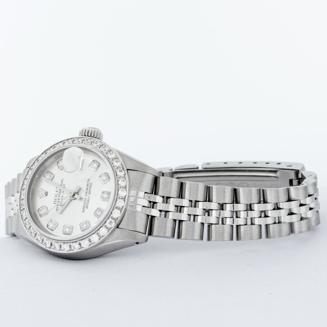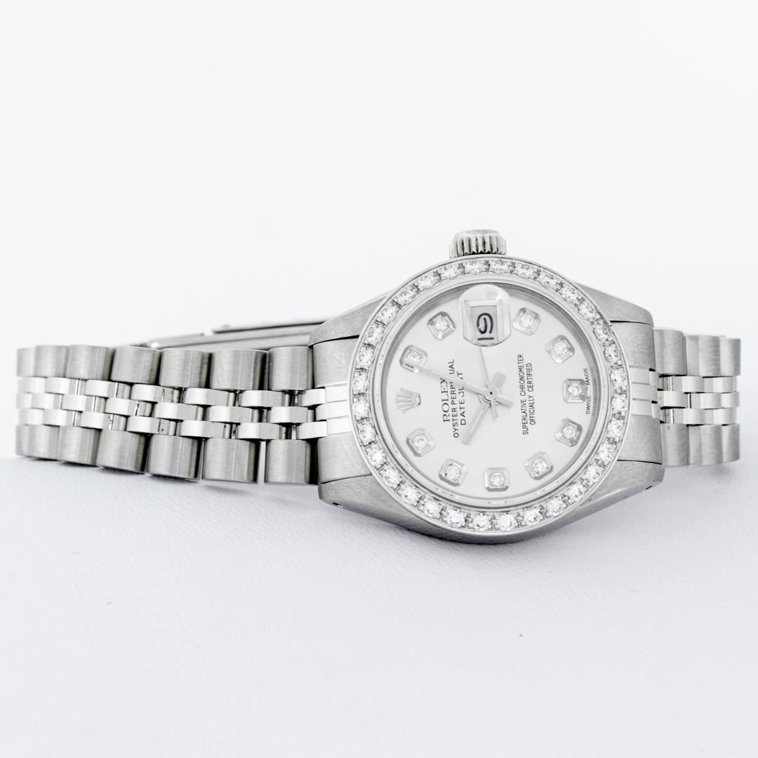 One Ladies Rolex Pre Owned Quickset Stainless Steel Rolex Datejust Wristwatch Polished Bright with Satin Finish, Serviced And Electronically Tested, Stainless Steel Case: 26mm, Stainless Steel Crown, Custom Bezel: New 18K White Gold Beadset Diamond Bezel, Diamond Count: 32 Diamonds. Custom Crystal: New Sapphire With Date Window. Custom Hands: New Luminescent Hands. Rolex Movement: Automatic Winding Movement 2135. Custom Dial: Custom Silver Dial With Added Diamond Hour Markers, Diamond Count: 10 Diamonds On Dial. Date Window: 3 O'Clock Position Date Display. Model: Quickset Datejust. Condition: G-6 Extra Fine. Rolex Bracelet: Stainless Steel Jubilee Band. Bright Polish And Satin Finish. 6.0 Inch Length, Adjustable. Standard Clasp, With Rolex Logo. This Watch Has Been Serviced Time Tested And Is In Excellent Condition It Is Free Of All Scratches And Dents.