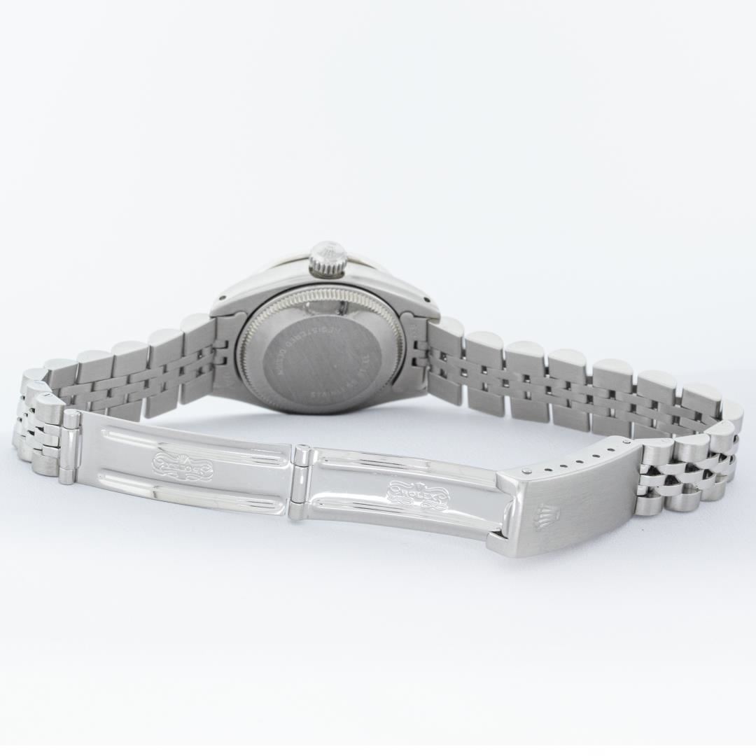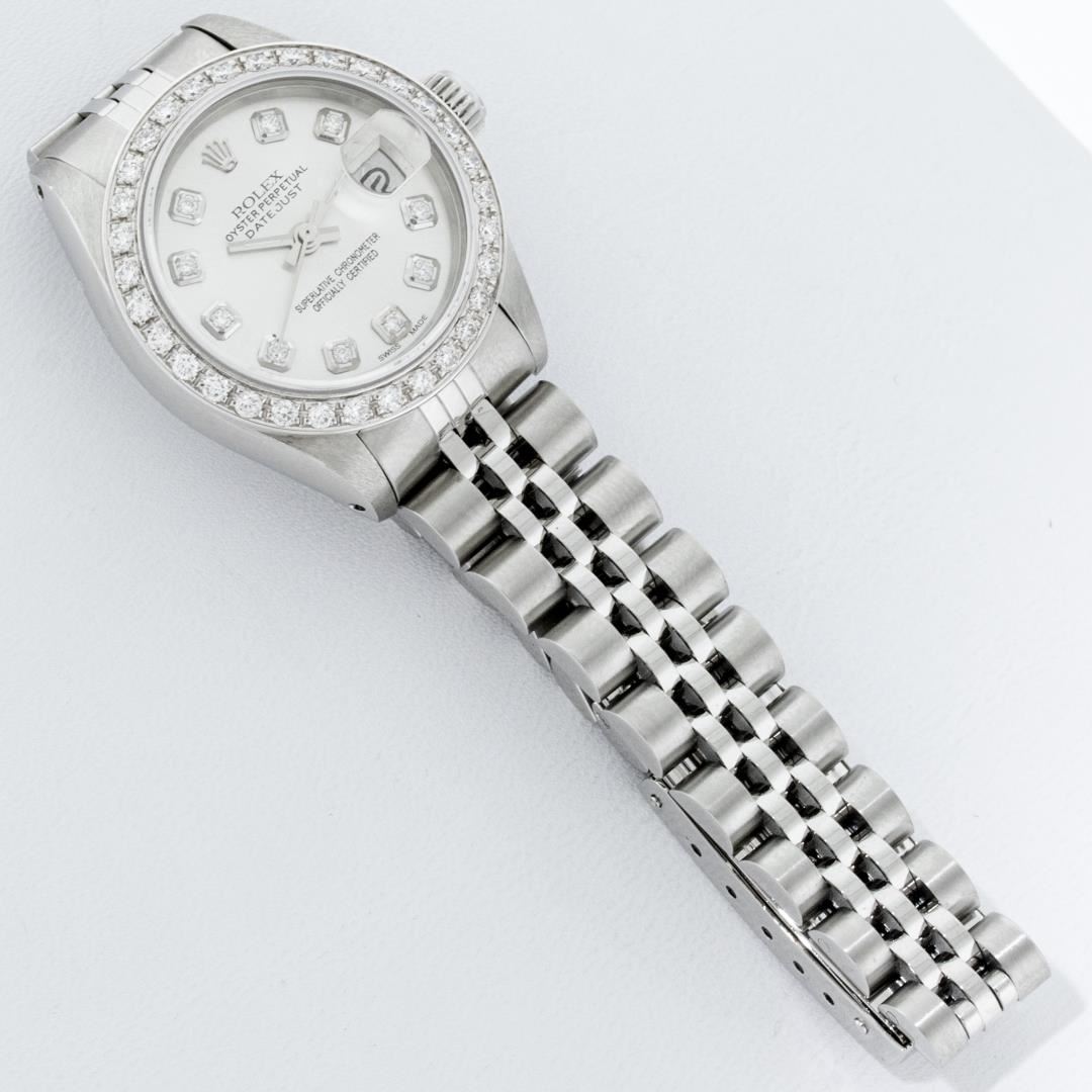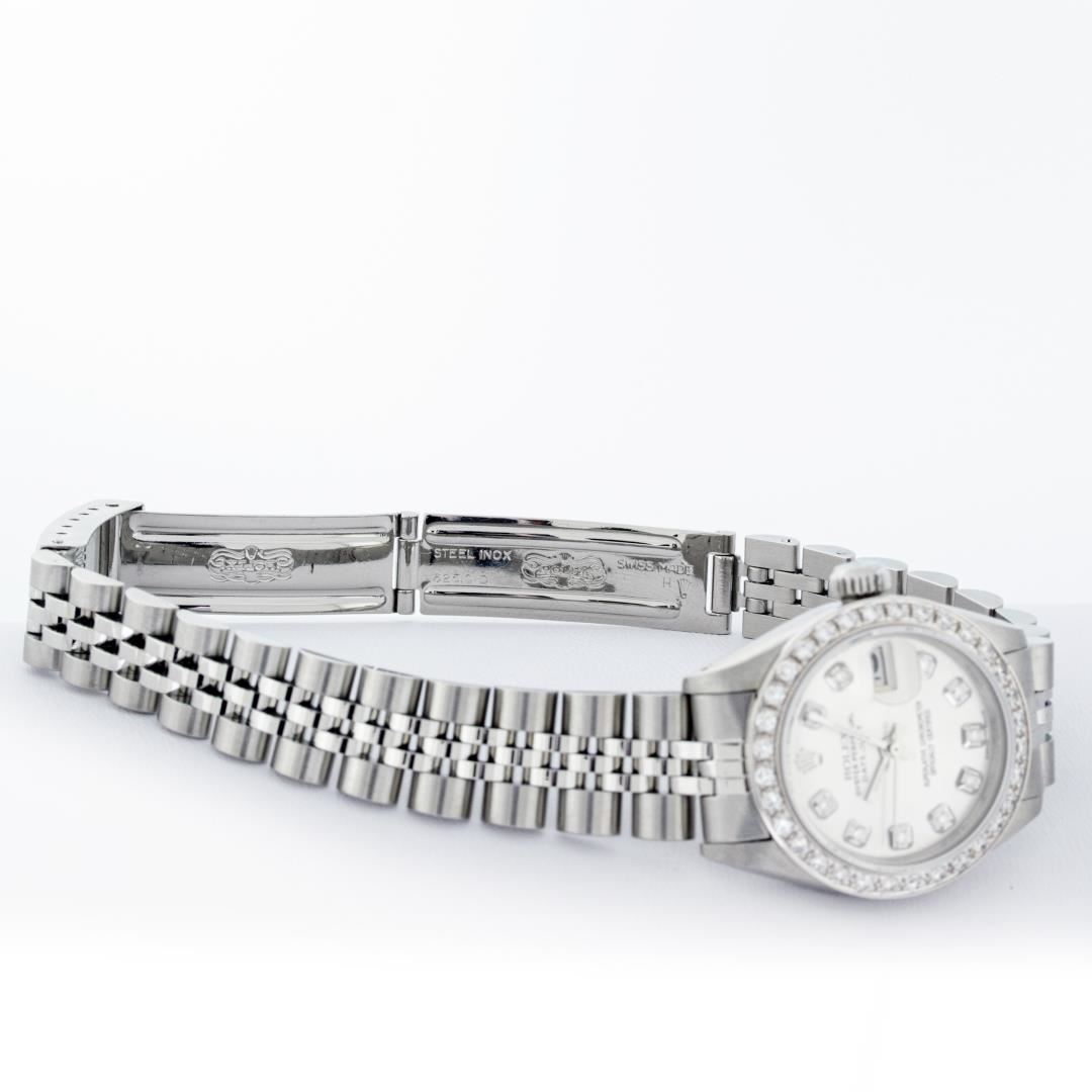 One Ladies Rolex Pre Owned Quickset Stainless Steel Rolex Datejust Wristwatch Polished Bright with Satin Finish, Serviced And Electronically Tested, Stainless Steel Case: 26mm, Stainless Steel Crown, Custom Bezel: New 18K White Gold Beadset Diamond Bezel, Diamond Count: 32 Diamonds. Custom Crystal: New Sapphire With Date Window. Custom Hands: New Luminescent Hands. Rolex Movement: Automatic Winding Movement 2135. Custom Dial: Custom Silver Dial With Added Diamond Hour Markers, Diamond Count: 10 Diamonds On Dial. Date Window: 3 O'Clock Position Date Display. Model: Quickset Datejust. Condition: G-6 Extra Fine. Rolex Bracelet: Stainless Steel Jubilee Band. Bright Polish And Satin Finish. 6.0 Inch Length, Adjustable. Standard Clasp, With Rolex Logo. This Watch Has Been Serviced Time Tested And Is In Excellent Condition It Is Free Of All Scratches And Dents.