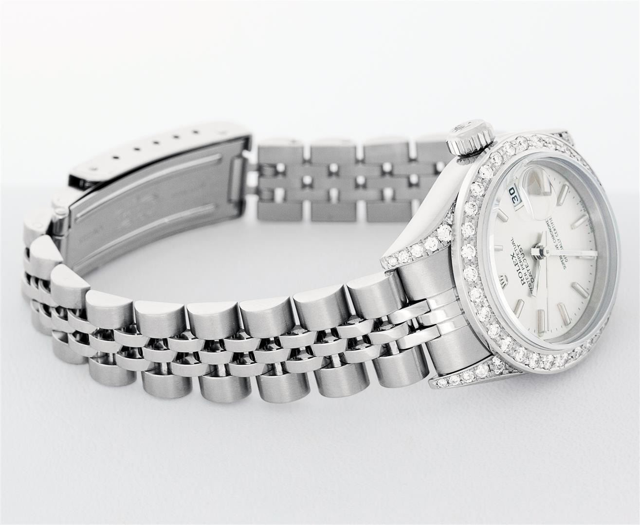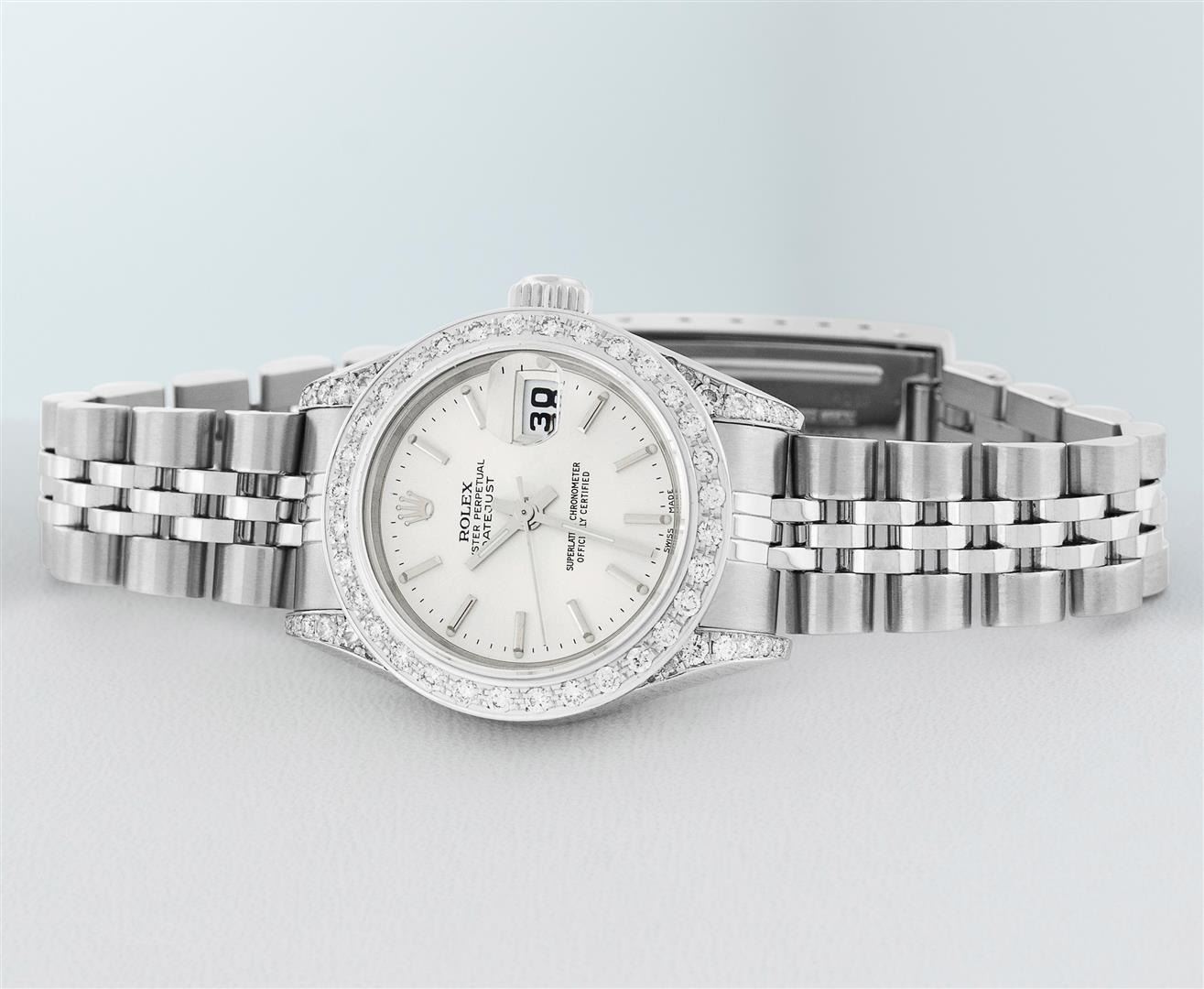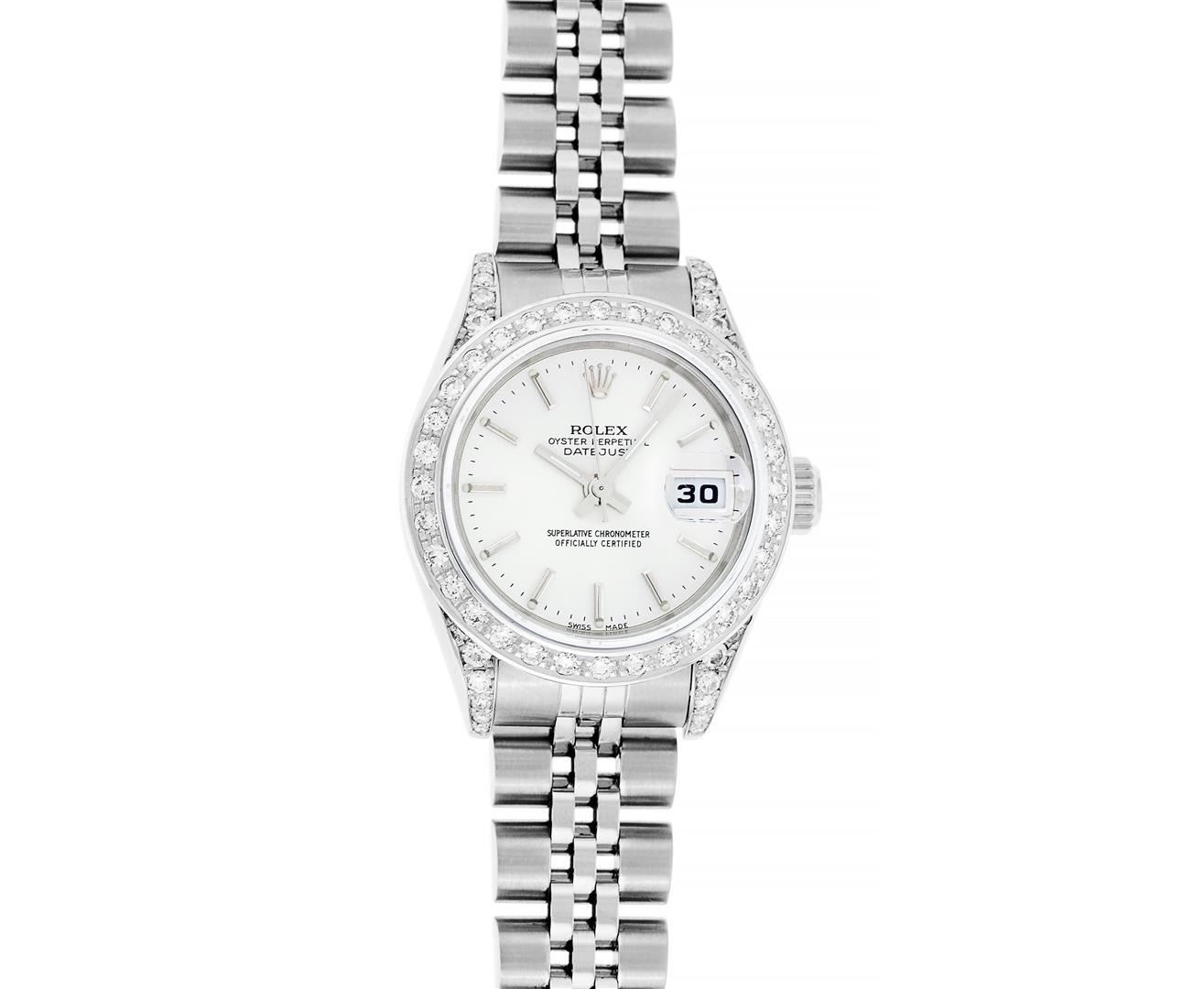 One Ladies Pre Owned Quickset Stainless Steel Rolex Datejust Polished Bright with Satin Finish, Serviced & Electronically Tested, Rolex Stainless Steel Case: 26mm, Custom Diamond Lugs: Added Diamonds On Lugs, Diamond Count: 24 Diamonds On Bezel, Color: G To H, Clartity: SI-VS. Rolex Stainless Steel Crown, Custom Bezel: New 18K White Gold Beadset Diamond Bezel, Stone Count: 32 Diamonds, Diamond Color: G To H, Clarity: SI-VS. Custom Crystal: New Sapphire With Magnified Date Window. Custom Hands: New Lumi Hands. Rolex Movement: Quickset Automatic Winding Movement 2230. Rolex Dial: Silver Index With Dash Track And Lumi Dots. Date Window: 3 O'Clock Position Date Display, Model: Sapphire Quickset Datejust. Condition: G-6 Extra Fine. Rolex Bracelet: Stainless Steel Jubilee Band. Bright Polish & Satin Finish. 6.0 Inch Length, Adjustable. Standard Clasp, With Rolex Logo. This Watch Has Been Serviced Time Tested And Is In Excellent Condition It Is Free Of All Scratches And Dents.