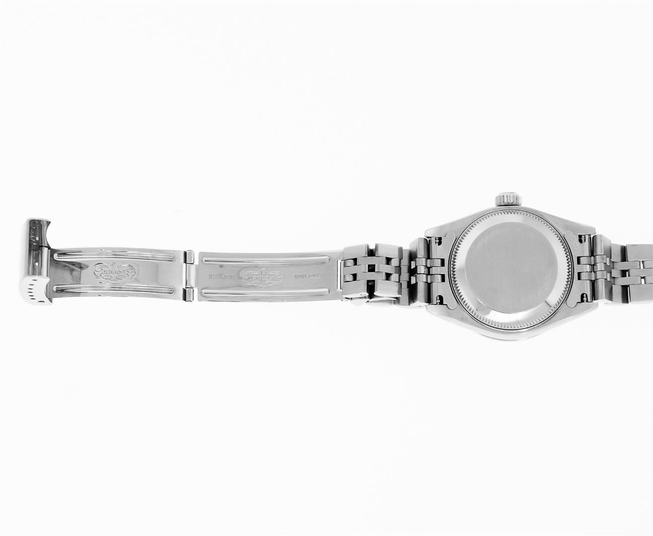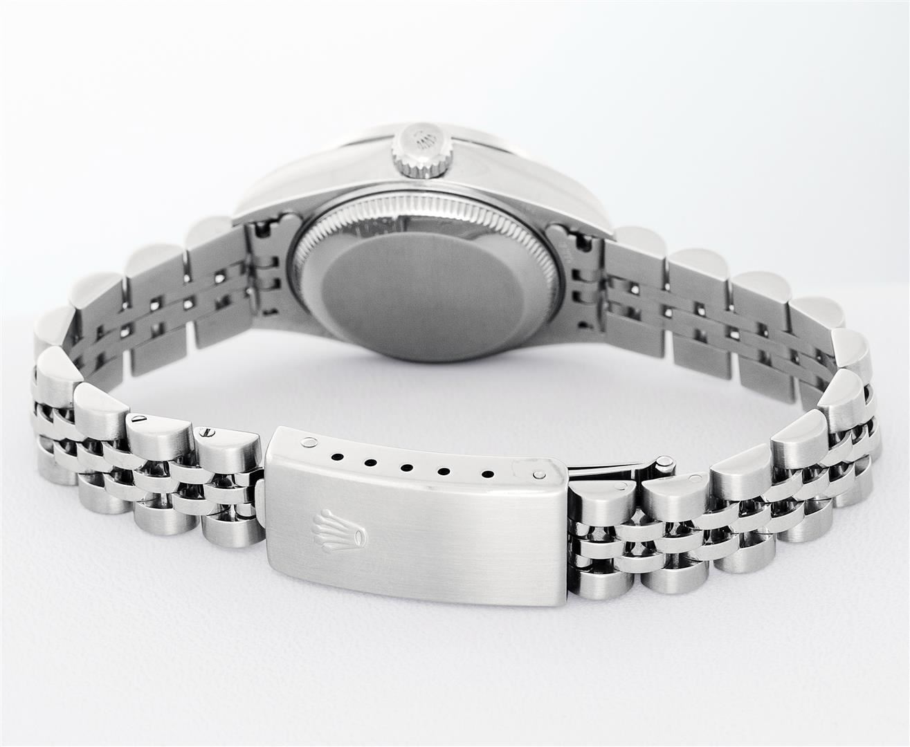One Ladies Pre Owned Quickset Stainless Steel Rolex Datejust Polished Bright with Satin Finish, Serviced & Electronically Tested, Rolex Stainless Steel Case: 26mm, Custom Diamond Lugs: Added Diamonds On Lugs, Diamond Count: 24 Diamonds On Bezel, Color: G To H, Clartity: SI-VS. Rolex Stainless Steel Crown, Custom Bezel: New 18K White Gold Beadset Diamond Bezel, Stone Count: 32 Diamonds, Diamond Color: G To H, Clarity: SI-VS. Custom Crystal: New Sapphire With Magnified Date Window. Custom Hands: New Lumi Hands. Rolex Movement: Quickset Automatic Winding Movement 2230. Rolex Dial: Silver Index With Dash Track And Lumi Dots. Date Window: 3 O'Clock Position Date Display, Model: Sapphire Quickset Datejust. Condition: G-6 Extra Fine. Rolex Bracelet: Stainless Steel Jubilee Band. Bright Polish & Satin Finish. 6.0 Inch Length, Adjustable. Standard Clasp, With Rolex Logo. This Watch Has Been Serviced Time Tested And Is In Excellent Condition It Is Free Of All Scratches And Dents.