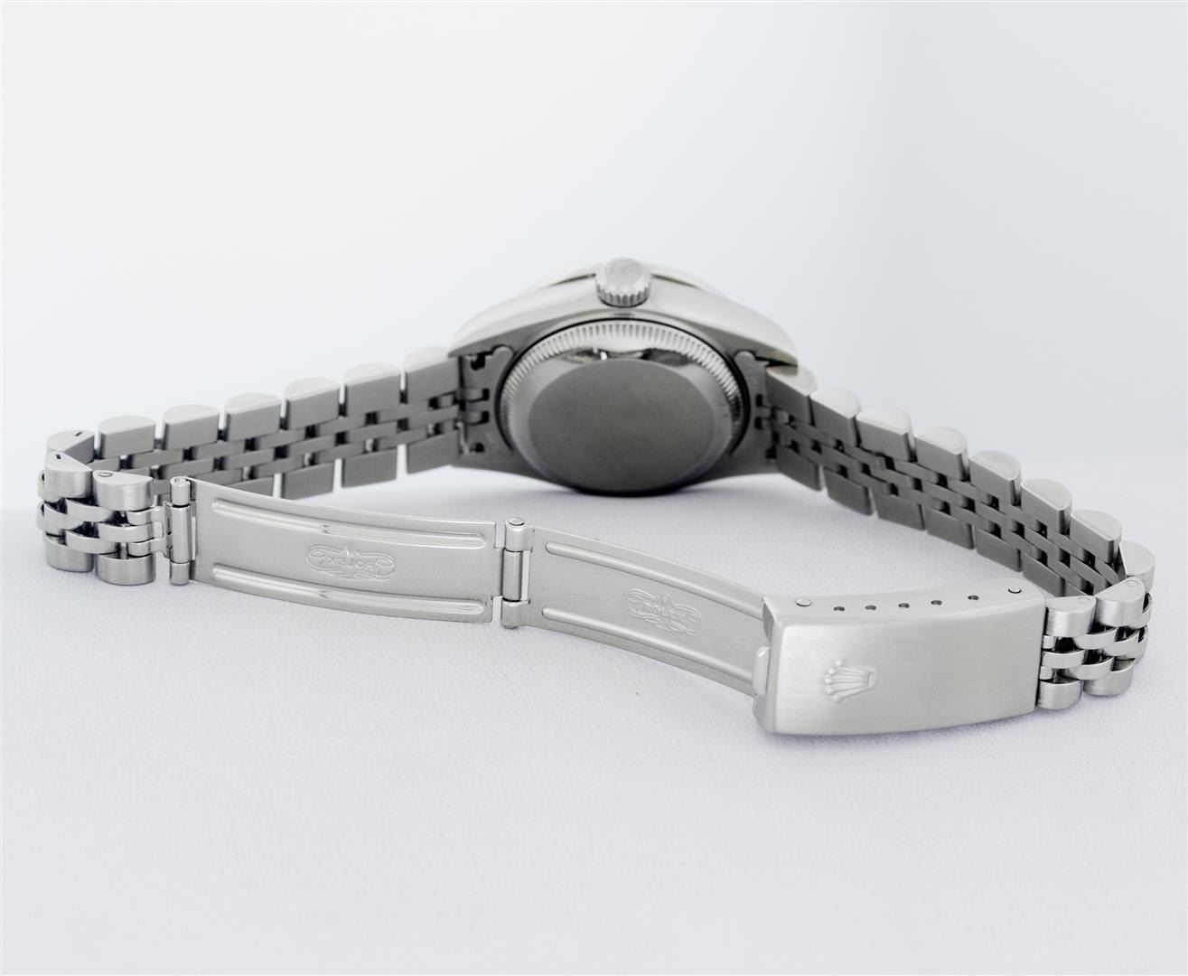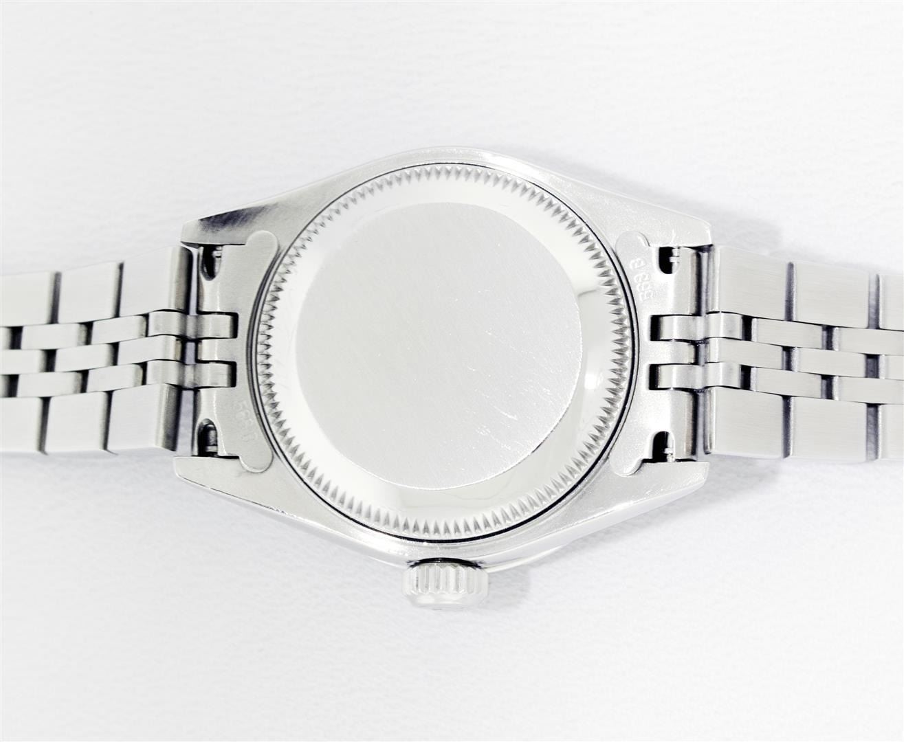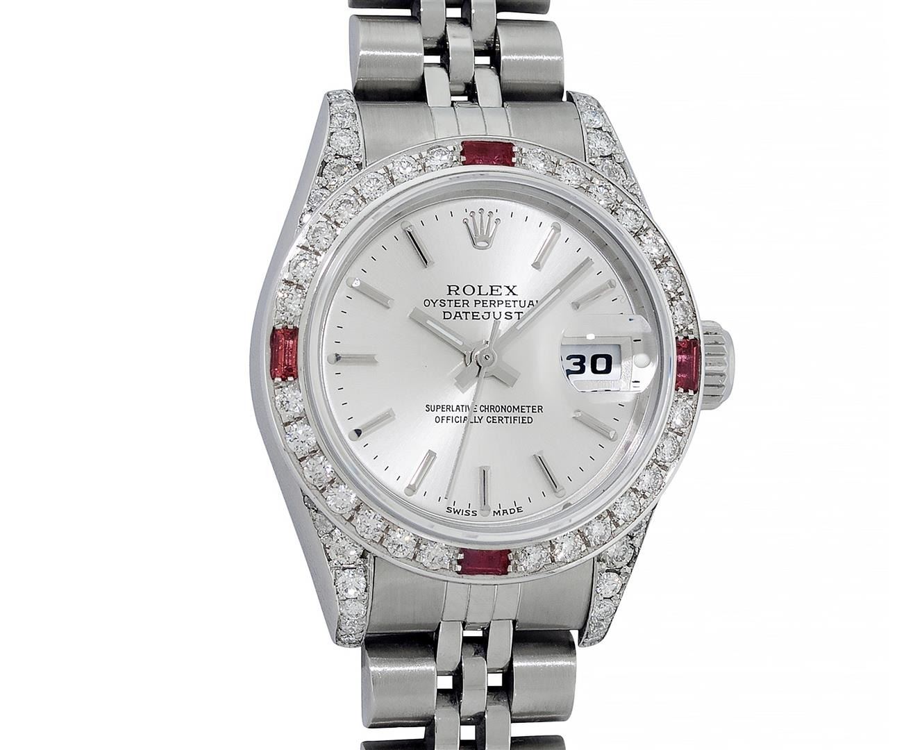 One Ladies Pre Owned Quickset Stainless Steel Rolex Datejust Polished Bright with Satin Finish, Serviced & Electronically Tested, Rolex Stainless Steel Case: 26mm, Custom Diamond Lugs: Added Diamonds On Lugs, Diamond Count: 24 Diamonds On Bezel, Color: G