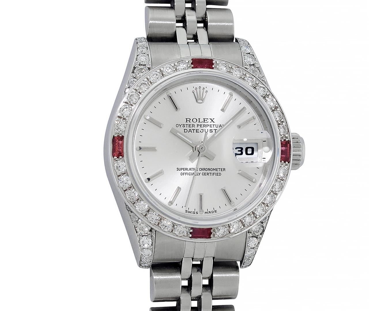 One Ladies Pre Owned Quickset Stainless Steel Rolex Datejust Polished Bright with Satin Finish, Serviced & Electronically Tested, Rolex Stainless Steel Case: 26mm, Custom Diamond Lugs: Added Diamonds On Lugs, Diamond Count: 24 Diamonds On Bezel, Color: G To H, Clartity: SI-VS. Rolex Stainless Steel Crown, Custom Bezel: New 18K White Gold Beadset And Ruby Bezel, Stone Count: 28 Diamonds + 4 Rubies, Diamond Color: G To H, Clarity: SI-VS. Custom Crystal: New Sapphire With Magnified Date Window. Custom Hands: New Lumi Hands. Rolex Movement: Quickset Automatic Winding Movement 2230. Rolex Dial: Silver Index With Dash Track And Lumi Dots. Date Window: 3 O'Clock Position Date Display, Model: Sapphire Quickset Datejust. Condition: G-6 Extra Fine. Rolex Bracelet: Stainless Steel Jubilee Band. Bright Polish & Satin Finish. 6.0 Inch Length, Adjustable. Standard Clasp, With Rolex Logo. This Watch Has Been Serviced Time Tested And Is In Excellent Condition It Is Free Of All Scratches And Dents.