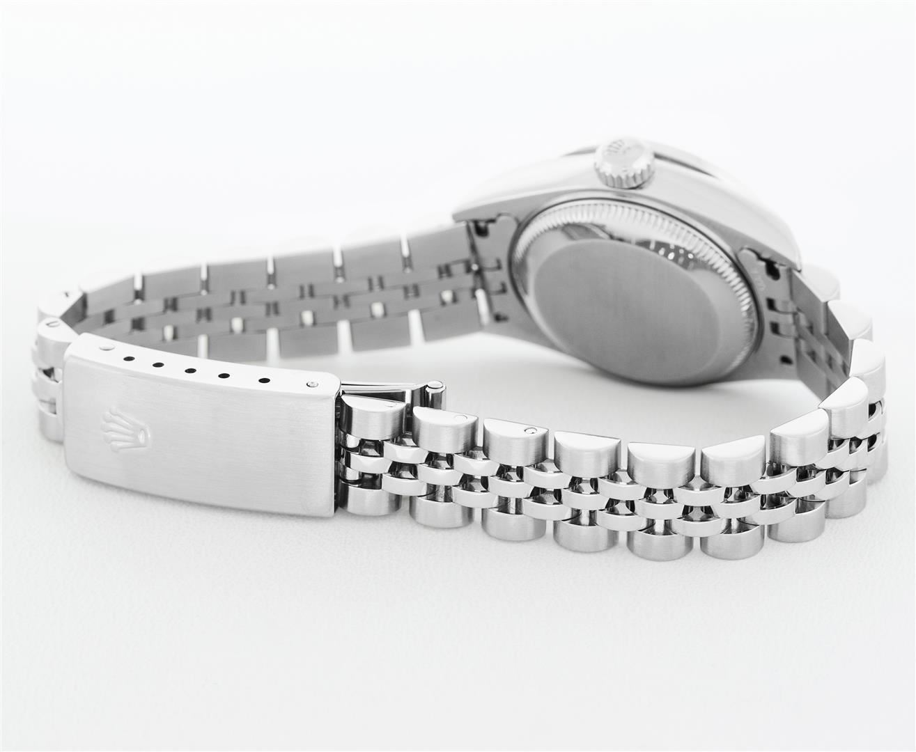 One Ladies Pre Owned Quickset Stainless Steel Rolex Datejust Polished Bright with Satin Finish, Serviced & Electronically Tested, Rolex Stainless Steel Case: 26mm, Custom Diamond Lugs: Added Diamonds On Lugs, Diamond Count: 24 Diamonds On Bezel, Color: G To H, Clartity: SI-VS. Rolex Stainless Steel Crown, Custom Bezel: New 18K White Gold Beadset And Ruby Bezel, Stone Count: 28 Diamonds + 4 Rubies, Diamond Color: G To H, Clarity: SI-VS. Custom Crystal: New Sapphire With Magnified Date Window. Custom Hands: New Lumi Hands. Rolex Movement: Quickset Automatic Winding Movement 2230. Rolex Dial: Silver Index With Dash Track And Lumi Dots. Date Window: 3 O'Clock Position Date Display, Model: Sapphire Quickset Datejust. Condition: G-6 Extra Fine. Rolex Bracelet: Stainless Steel Jubilee Band. Bright Polish & Satin Finish. 6.0 Inch Length, Adjustable. Standard Clasp, With Rolex Logo. This Watch Has Been Serviced Time Tested And Is In Excellent Condition It Is Free Of All Scratches And Dents.