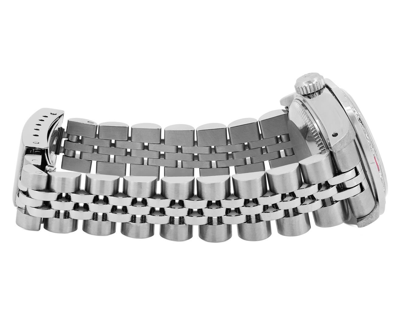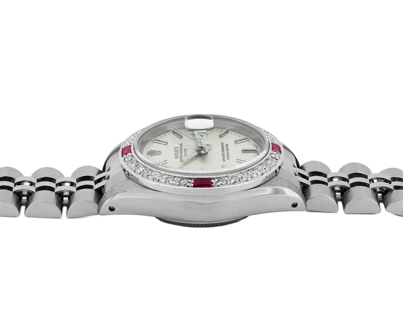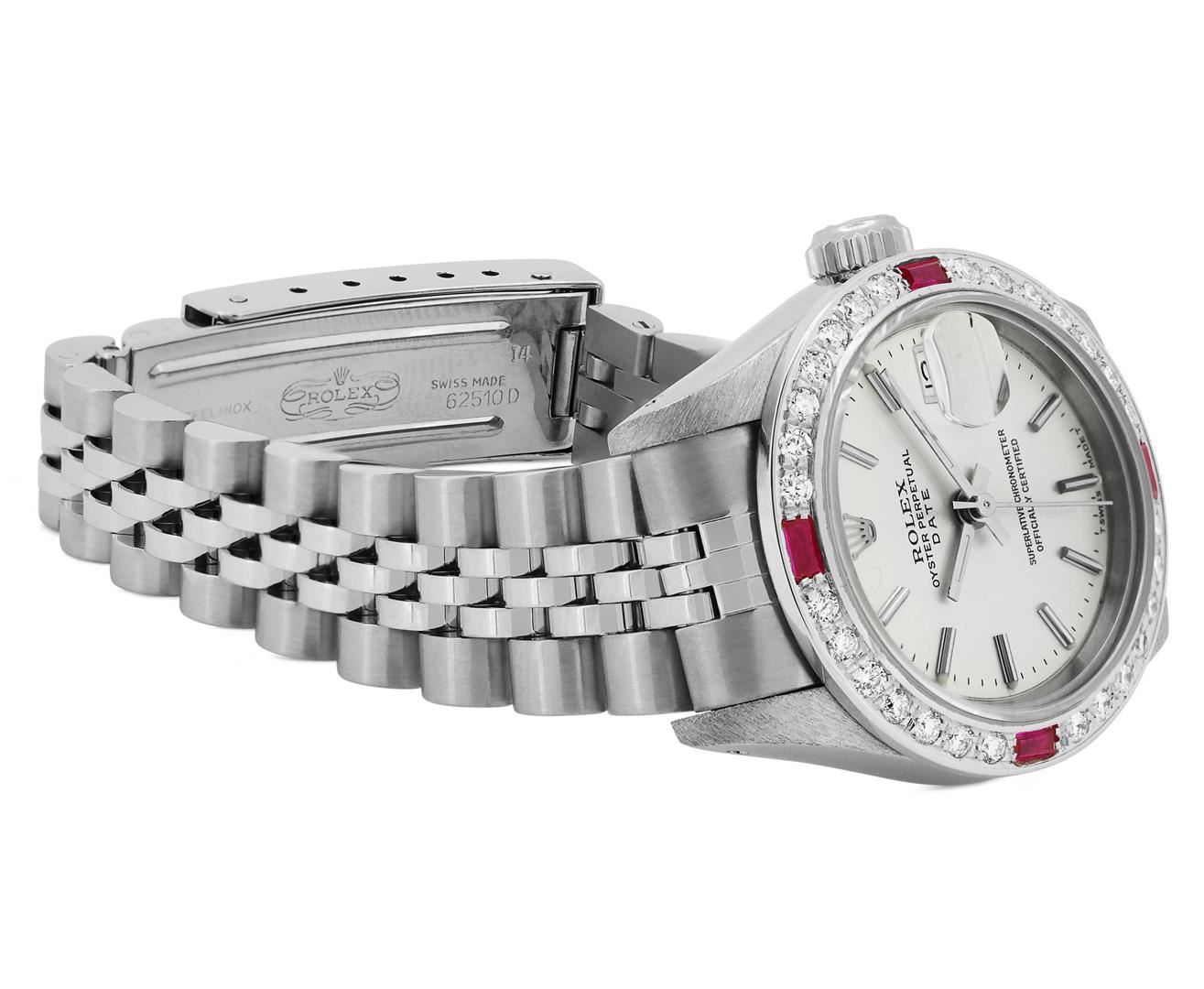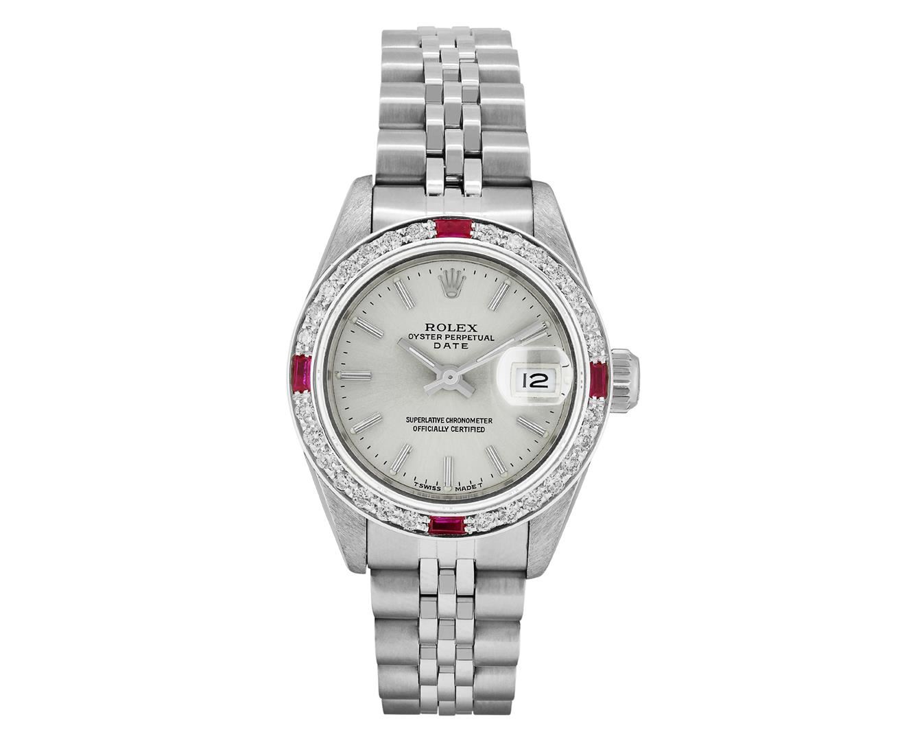 One Rolex Ladies Pre Owned Stainless Steel Date Wristwatch Polished Bright with Satin Finish, Serviced & Electronically Tested, Stainless Steel Case: 26mm, Stainless Steel Crown, Custom Bezel: New 18K White Gold Ruby Beadset Diamond Bezel, Diamond + Gem Count: 36 Diamonds + 4 Rubies, Clarity: SI-VS, Color: G to H. Custom Crystal: New Sapphire With Magnified Date Window. Custom Hands: New Luminescent Hands. Rolex Movement: 2135 Automatic Winding Movement. Rolex Dial: Factory Silver Dial With Index Hour Markers And Lumi Dots. Date Window: 3 O'Clock Position Date Display, Model: Datejust. Condition: G-6 Extra Fine. Rolex Bracelet: Stainless Steel Jubilee Band. Bright Polish & Satin Finish. 6.0 Inch Length, Adjustable. Standard Clasp, With Rolex Logo. This Watch Has Been Serviced Time Tested And Is In Excellent Condition. It Is Free Of All Scratches And Dents. This Watch Comes With A Rolex Box.