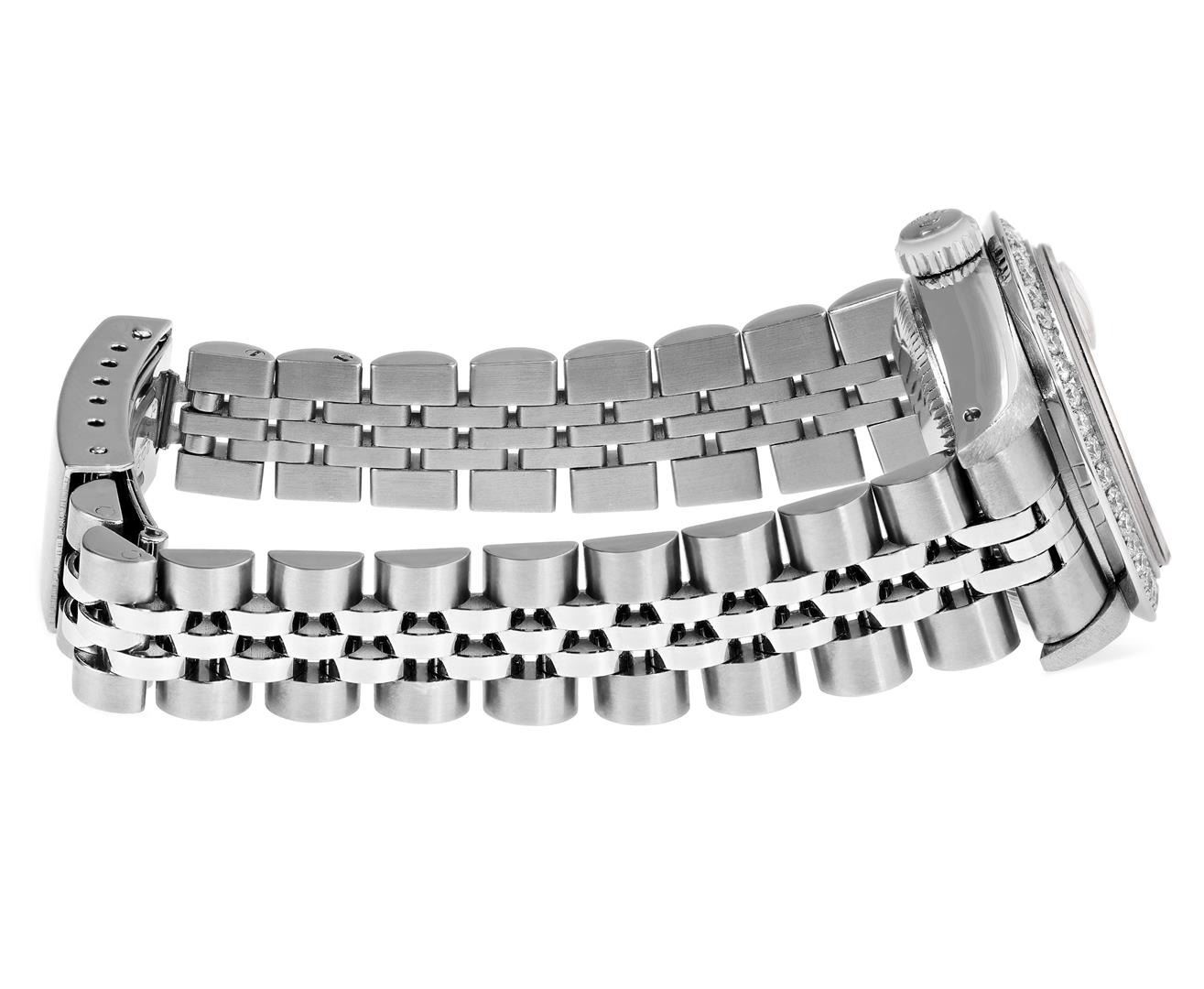One Rolex Ladies Pre Owned Stainless Steel Date Wristwatch Polished Bright with Satin Finish, Serviced & Electronically Tested, Stainless Steel Case: 26mm, Stainless Steel Crown, Custom Bezel: New Stainless Steel Beadset Diamond Bezel, Diamond Count: 40 D