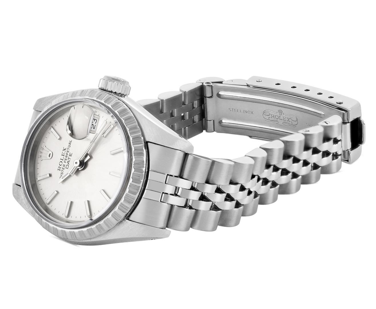 One Rolex Ladies Quickset Pre Owned Stainless Steel Date Wristwatch Polished Bright with Satin Finish, Serviced & Electronically Tested, Stainless Steel Case: 26mm, Stainless Steel Crown, Rolex Stainless Steel Engine Turn bezel. Crystal: Sapphire With Magnified Date Window. Hands: Luminescent Hands. Rolex Movement: 2135 Automatic Winding Movement. Rolex Dial: Factory Silver Dial With Index Hour Markers And Lumi Dots. Date Window: 3 O'Clock Position Date Display, Model: Datejust. Condition: G-6 Extra Fine. Rolex Bracelet: Stainless Steel Jubilee Band. Bright Polish & Satin Finish. 6.0 Inch Length, Adjustable. Standard Clasp, With Rolex Logo. This Watch Has Been Serviced And Time Tested. It Is In Excellent Condition, Free Of All Scratches And Dents. This Watch Comes With A Rolex Box.