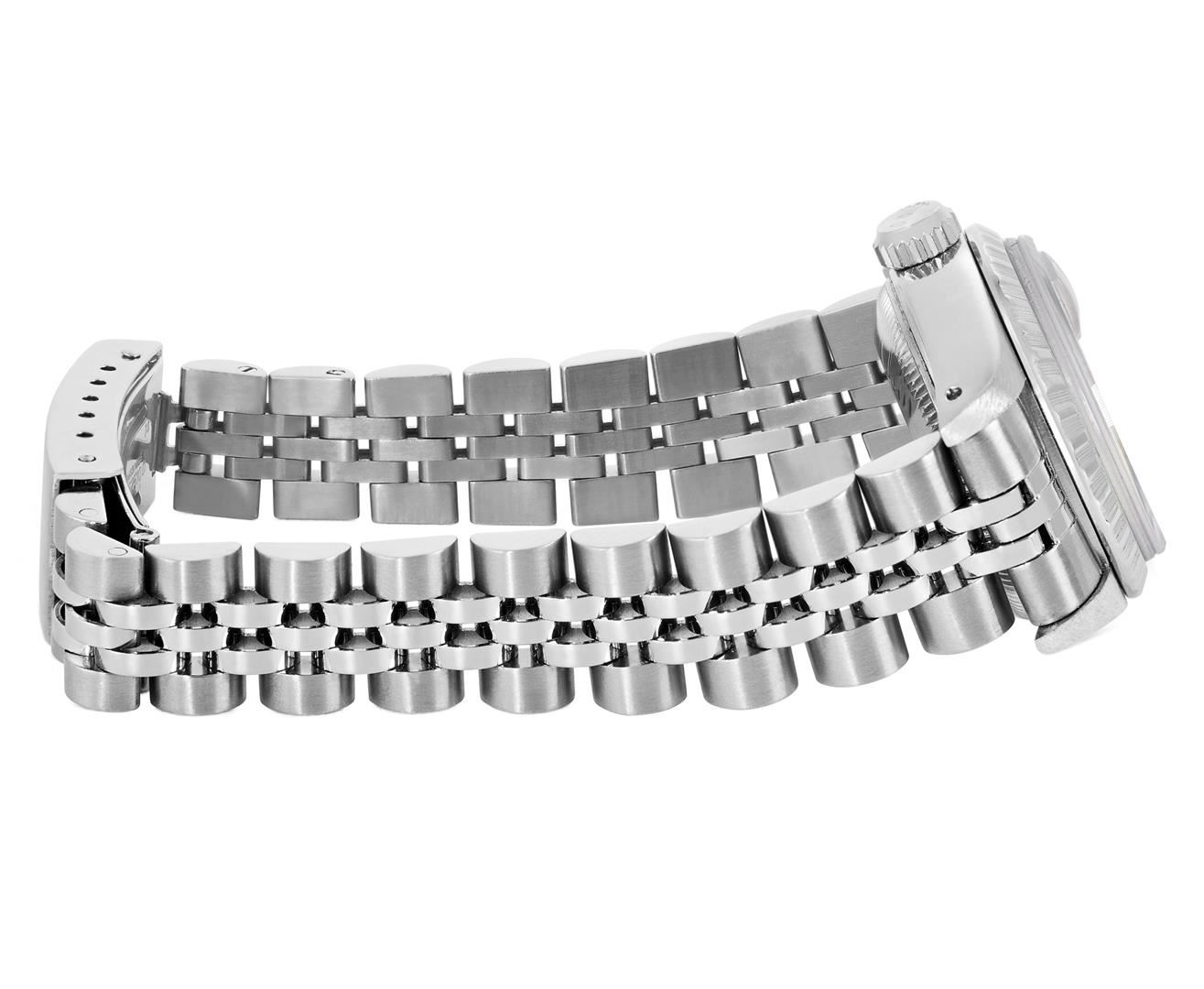 One Rolex Ladies Quickset Pre Owned Stainless Steel Date Wristwatch Polished Bright with Satin Finish, Serviced & Electronically Tested, Stainless Steel Case: 26mm, Stainless Steel Crown, Rolex Stainless Steel Engine Turn bezel. Crystal: Sapphire With Magnified Date Window. Hands: Luminescent Hands. Rolex Movement: 2135 Automatic Winding Movement. Rolex Dial: Factory Silver Dial With Index Hour Markers And Lumi Dots. Date Window: 3 O'Clock Position Date Display, Model: Datejust. Condition: G-6 Extra Fine. Rolex Bracelet: Stainless Steel Jubilee Band. Bright Polish & Satin Finish. 6.0 Inch Length, Adjustable. Standard Clasp, With Rolex Logo. This Watch Has Been Serviced And Time Tested. It Is In Excellent Condition, Free Of All Scratches And Dents. This Watch Comes With A Rolex Box.
