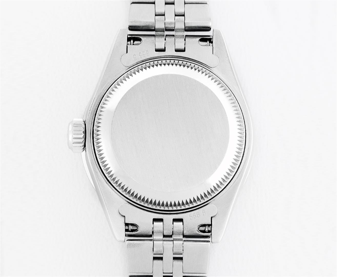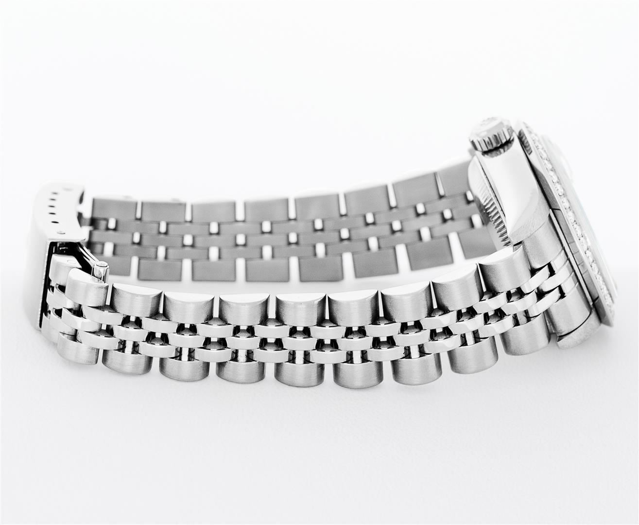 One Ladies Pre Owned Quickset Stainless Steel Rolex Datejust Polished Bright with Satin Finish, Serviced & Electronically Tested, Rolex Stainless Steel Case: 26mm. Rolex Stainless Steel Crown, Custom Bezel: New Stainless Steel Beadset Diamond Bezel, Stone Count: 32 Diamonds On Bezel, Diamond Color: G To H, Clarity: SI-VS. Custom Crystal: New Sapphire With Magnified Date Window. Custom Hands: New Hands. Rolex Movement: Quickset Automatic Winding Movement 2230. Rolex Dial: White Roman With Square Track. Date Window: 3 O'Clock Position Date Display, Model: Sapphire Quickset Datejust. Condition: G-6 Extra Fine. Rolex Bracelet: Stainless Steel Jubilee Band. Bright Polish & Satin Finish. 6.0 Inch Length, Adjustable. Standard Clasp, With Rolex Logo. This Watch Has Been Serviced Time Tested And Is In Excellent Condition It Is Free Of All Scratches And Dents.