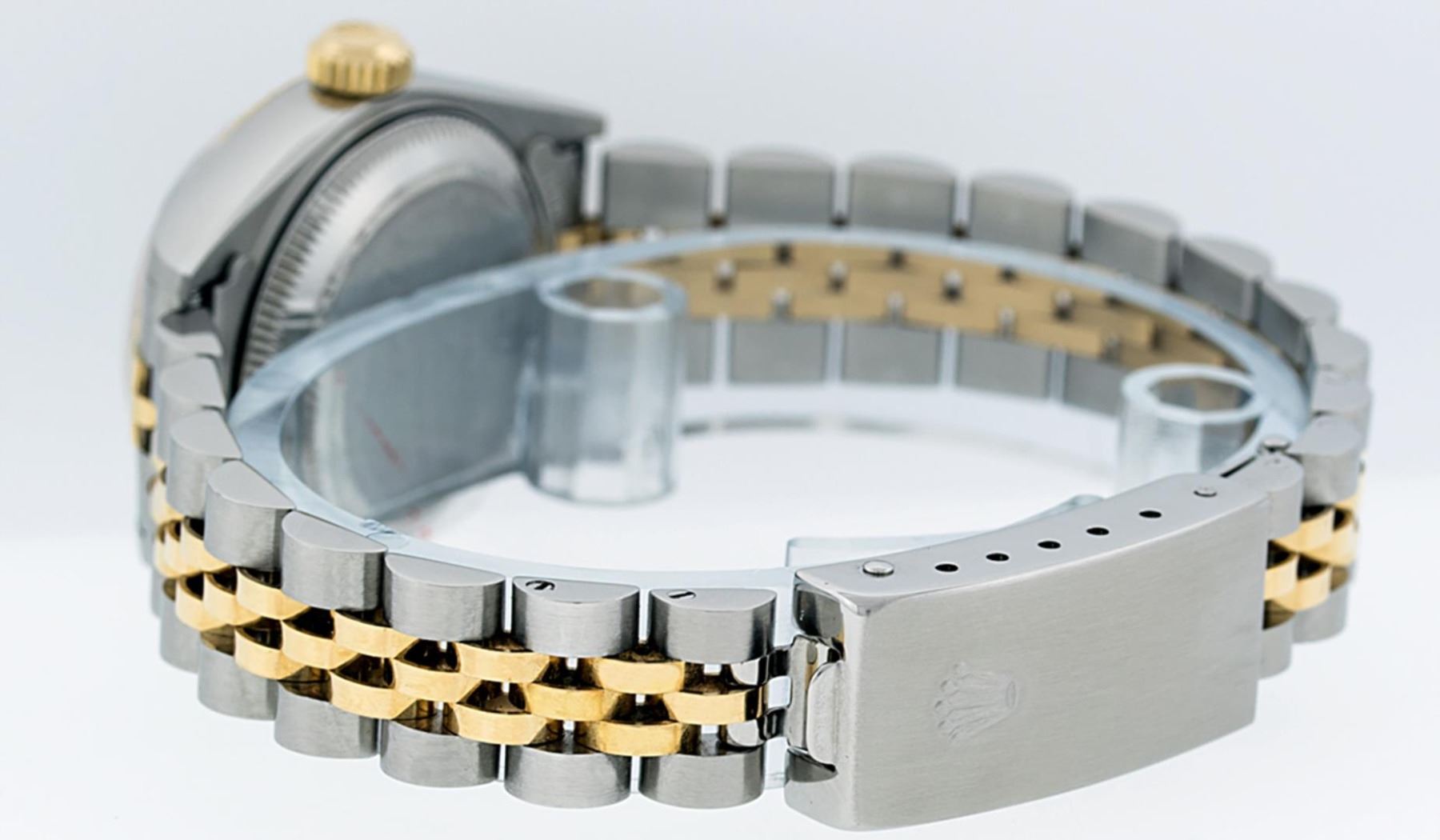 Rolex Ladies Pre Owned 18K Two Tone Yellow Gold And Stainless Steel Rolex Datejust Polished, Serviced And Electronically Tested, Rolex 18K Yellow Gold And Stainless Steel, Rolex Case Size: 26mm, 18K Yellow Gold Crown, Rolex Bezel: 18K Yellow Gold Fluted Bezel. Custom Crystal: New Sapphire With Magnified Date Window. Custom Hands: New Luminescent Hands. Rolex Movement: Automatic Winding Movement 2235. Custom Dial: Custom White Dial With Added Diamonds, Diamond Count: 10 Diamonds On Dial. Date Window: 3 O'Clock Position Date Display, Model: Datejust. Condition: G-6 Extra Fine. Rolex Bracelet: Two Tone 18K Yellow Gold And Stainless Steel Jubilee. Bright Polish. 6.0 Inch Length, Adjustable. Standard Clasp, With Rolex Logo. This Watch Has Been Serviced Time Tested And Is In Excellent Condition It Is Free Of All Scratches And Dents.
