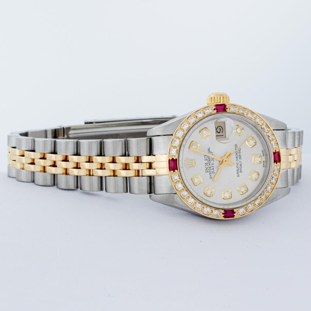 One Ladies Pre Owned Rolex Quickset Two Tone 18K Yellow Gold And Stainless Steel Datejust Polished, Serviced & Electronically Tested, Rolex Yellow Gold And Stainless Steel Case: 26mm, Rolex Yellow Gold Crown, Custom Bezel: New 18K Yellow Gold Ruby Beadset Diamond Bezel, Diamond + Gem Count: 28 Diamonds + 4 Rubies. Custom Crystal: New Sapphire With Magnified Date. Custom Hands: New Luminescent Hands. Rolex Movement: Automatic Winding Movement 2135. Custom Dial: Custom Silver Diamond With Added Diamond Hour Markers, Diamond Count: 10 Diamonds On Dial. Date Window: 3 O'Clock Position Date Display, Model: Quickset Datejust, Condition: G-6 Extra Fine. Rolex Bracelet: Two Tone Yellow Gold & Stainless Steel Jubilee. Bright Polish. 6.0 Inch Length, Adjustable. Standard Clasp, With Rolex Logo. This Watch Has Been Serviced Time Tested And Is In Excellent Condition It Is Free Of All Scratches And Dents.