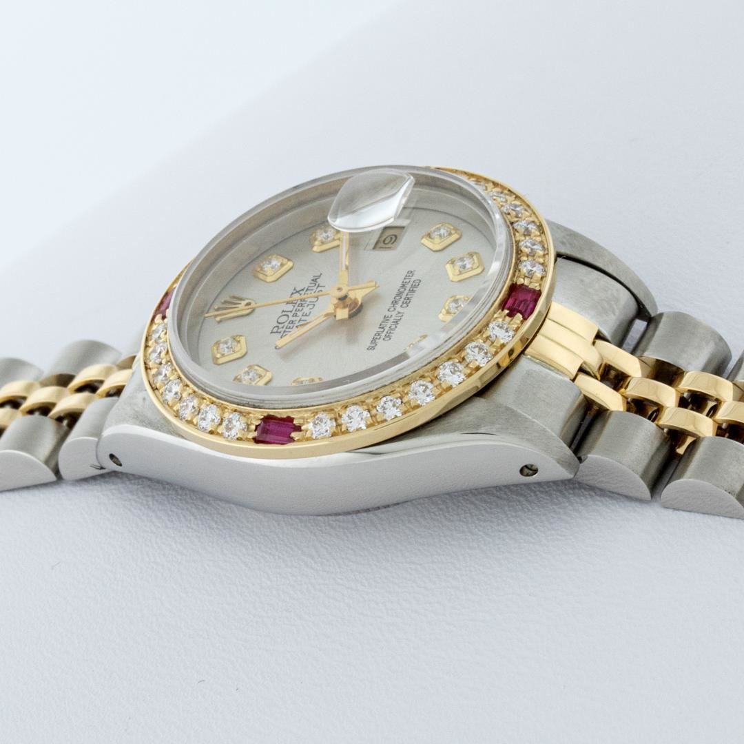 One Ladies Pre Owned Rolex Quickset Two Tone 18K Yellow Gold And Stainless Steel Datejust Polished, Serviced & Electronically Tested, Rolex Yellow Gold And Stainless Steel Case: 26mm, Rolex Yellow Gold Crown, Custom Bezel: New 18K Yellow Gold Ruby Beadset Diamond Bezel, Diamond + Gem Count: 28 Diamonds + 4 Rubies. Custom Crystal: New Sapphire With Magnified Date. Custom Hands: New Luminescent Hands. Rolex Movement: Automatic Winding Movement 2135. Custom Dial: Custom Silver Diamond With Added Diamond Hour Markers, Diamond Count: 10 Diamonds On Dial. Date Window: 3 O'Clock Position Date Display, Model: Quickset Datejust, Condition: G-6 Extra Fine. Rolex Bracelet: Two Tone Yellow Gold & Stainless Steel Jubilee. Bright Polish. 6.0 Inch Length, Adjustable. Standard Clasp, With Rolex Logo. This Watch Has Been Serviced Time Tested And Is In Excellent Condition It Is Free Of All Scratches And Dents.