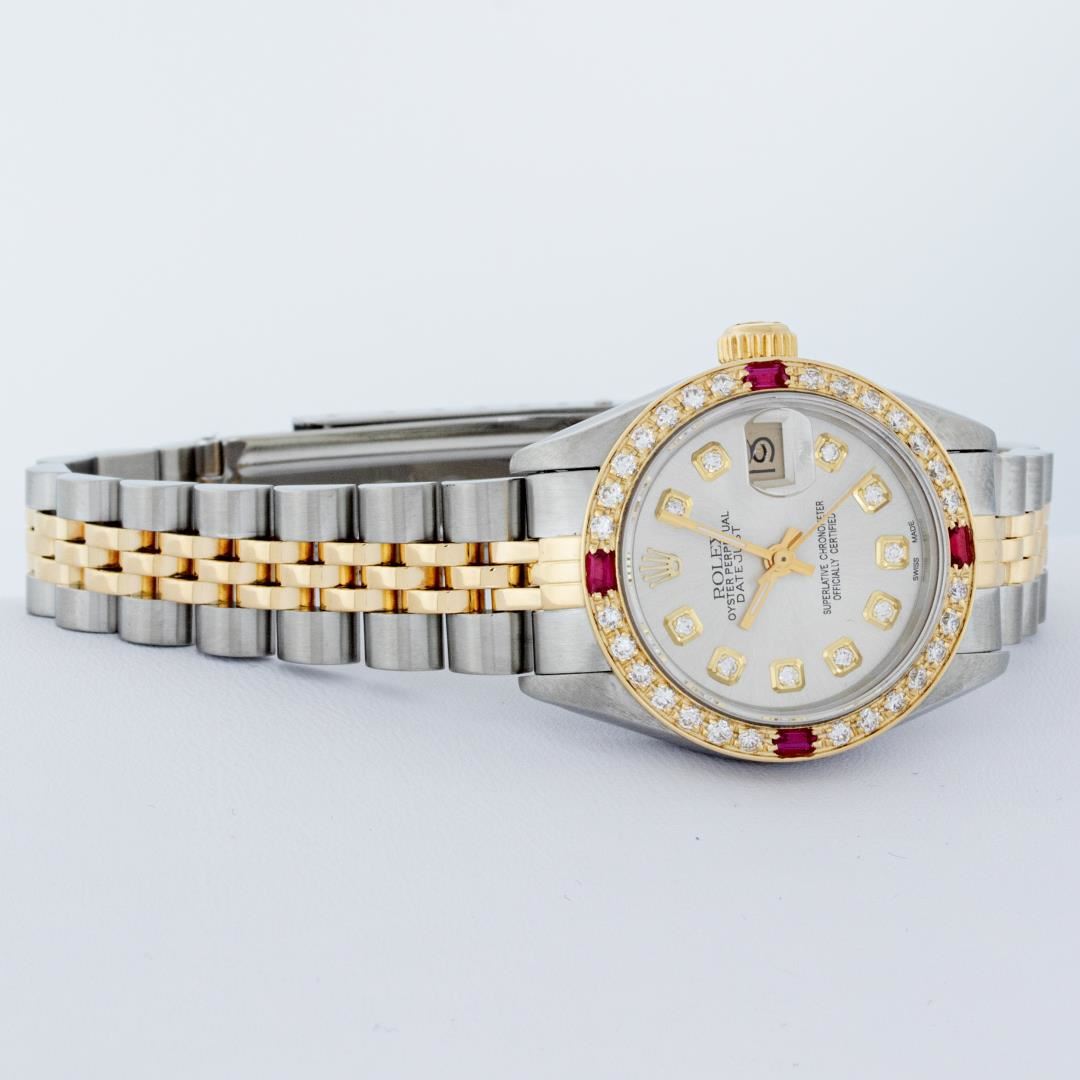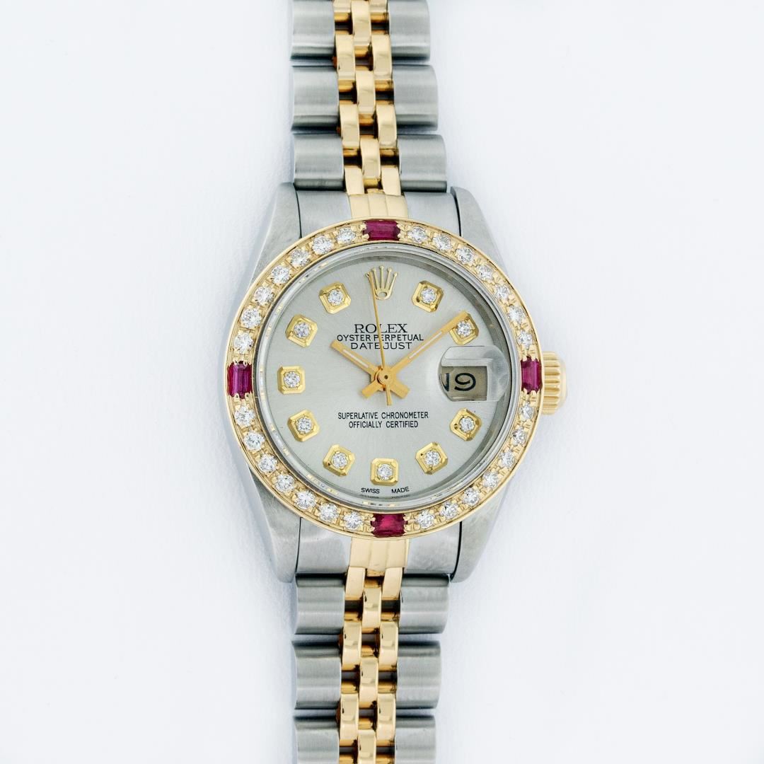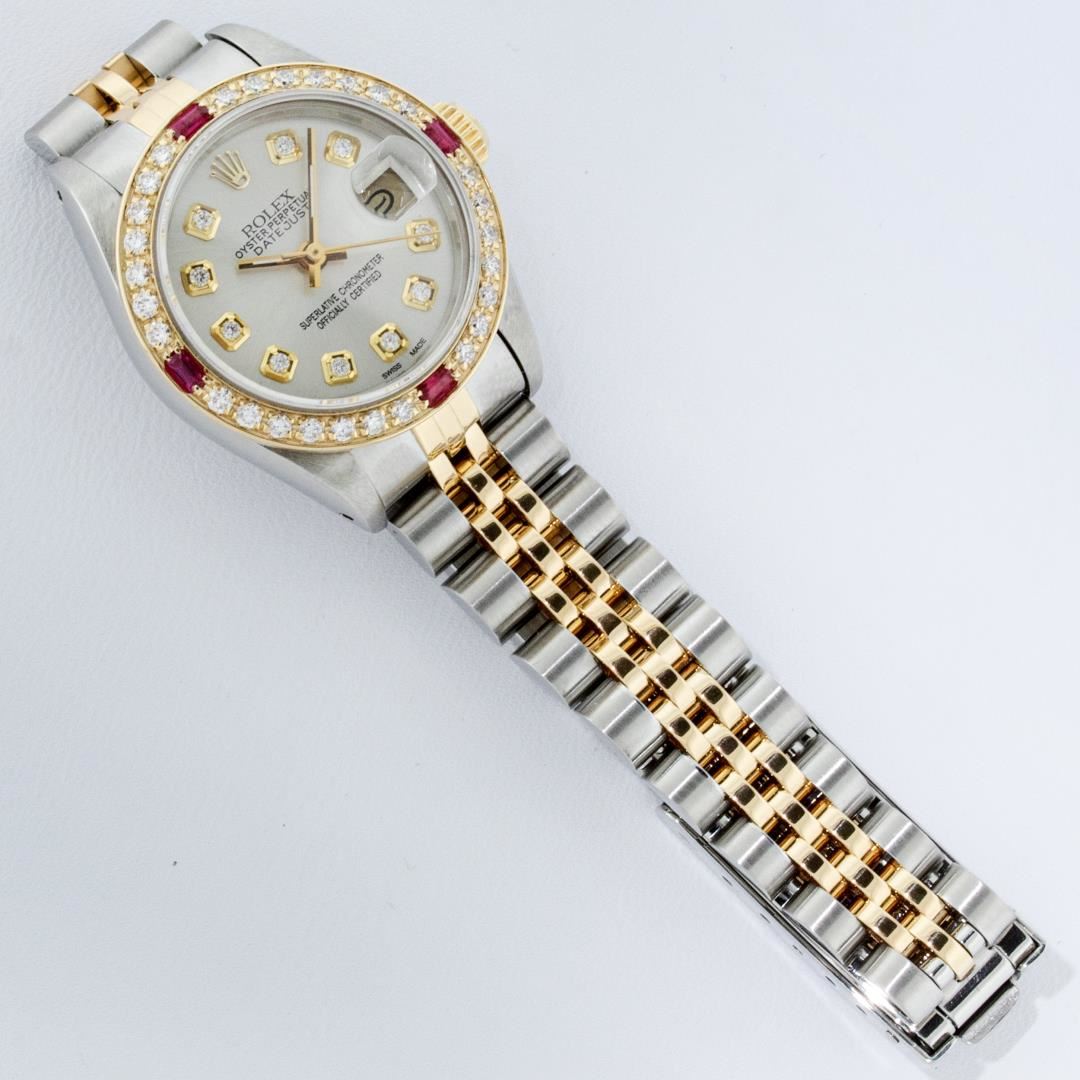 One Ladies Pre Owned Rolex Quickset Two Tone 18K Yellow Gold And Stainless Steel Datejust Polished, Serviced & Electronically Tested, Rolex Yellow Gold And Stainless Steel Case: 26mm, Rolex Yellow Gold Crown, Custom Bezel: New 18K Yellow Gold Ruby Beadset Diamond Bezel, Diamond + Gem Count: 28 Diamonds + 4 Rubies. Custom Crystal: New Sapphire With Magnified Date. Custom Hands: New Luminescent Hands. Rolex Movement: Automatic Winding Movement 2135. Custom Dial: Custom Silver Diamond With Added Diamond Hour Markers, Diamond Count: 10 Diamonds On Dial. Date Window: 3 O'Clock Position Date Display, Model: Quickset Datejust, Condition: G-6 Extra Fine. Rolex Bracelet: Two Tone Yellow Gold & Stainless Steel Jubilee. Bright Polish. 6.0 Inch Length, Adjustable. Standard Clasp, With Rolex Logo. This Watch Has Been Serviced Time Tested And Is In Excellent Condition It Is Free Of All Scratches And Dents.