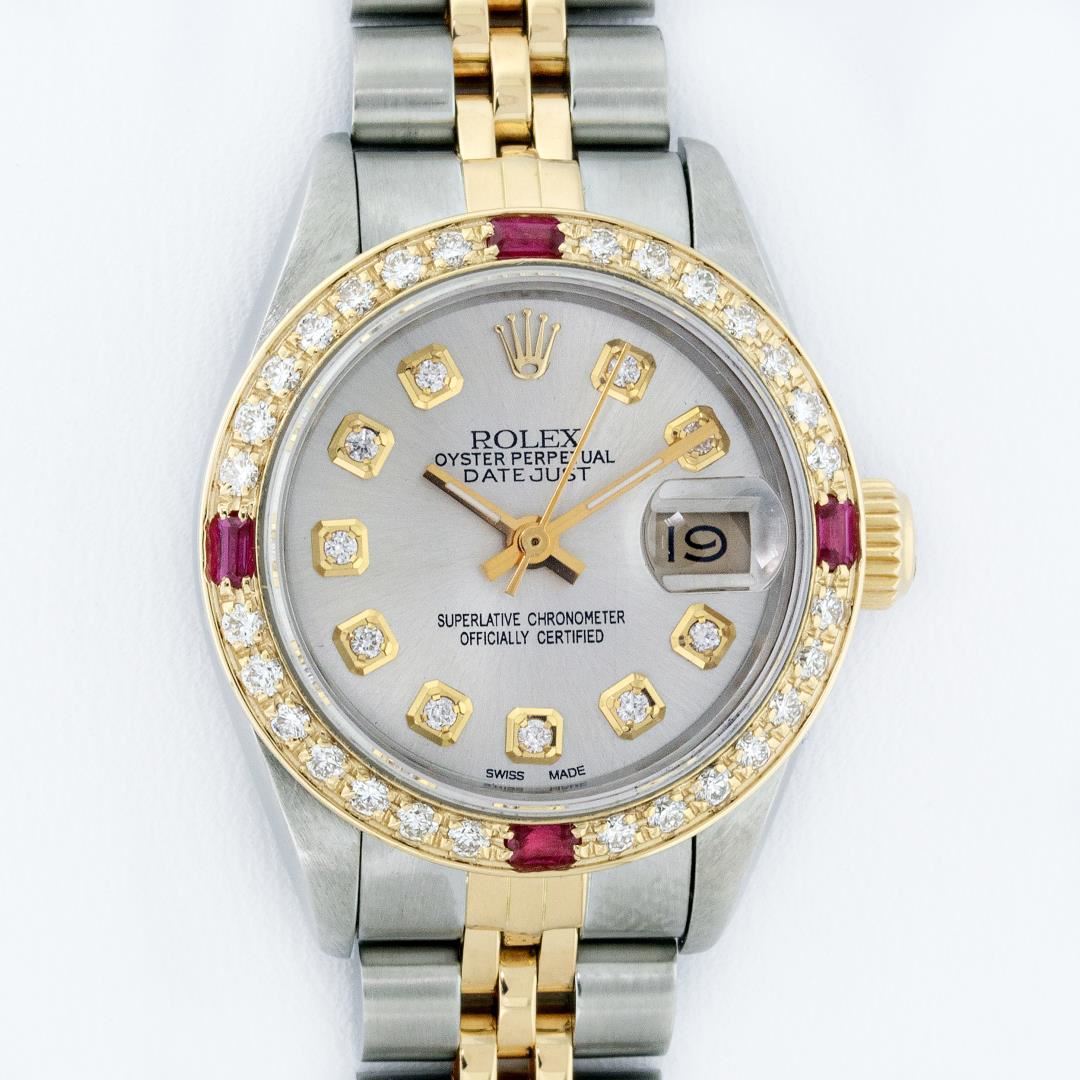 One Ladies Pre Owned Rolex Quickset Two Tone 18K Yellow Gold And Stainless Steel Datejust Polished, Serviced & Electronically Tested, Rolex Yellow Gold And Stainless Steel Case: 26mm, Rolex Yellow Gold Crown, Custom Bezel: New 18K Yellow Gold Ruby Beadset Diamond Bezel, Diamond + Gem Count: 28 Diamonds + 4 Rubies. Custom Crystal: New Sapphire With Magnified Date. Custom Hands: New Luminescent Hands. Rolex Movement: Automatic Winding Movement 2135. Custom Dial: Custom Silver Diamond With Added Diamond Hour Markers, Diamond Count: 10 Diamonds On Dial. Date Window: 3 O'Clock Position Date Display, Model: Quickset Datejust, Condition: G-6 Extra Fine. Rolex Bracelet: Two Tone Yellow Gold & Stainless Steel Jubilee. Bright Polish. 6.0 Inch Length, Adjustable. Standard Clasp, With Rolex Logo. This Watch Has Been Serviced Time Tested And Is In Excellent Condition It Is Free Of All Scratches And Dents.