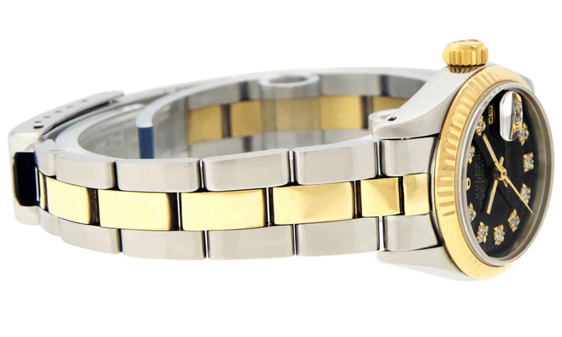 One Ladies Pre Owned Quickset Two Tone Yellow Gold And Stainless Steel Rolex Datejust Polished, Serviced And Electronically Tested, Rolex Yellow Gold And Stainless Steel Case: 26mm, Rolex Yellow Gold Crown, Rolex Bezel: Yellow Gold Fluted Bezel. Custom Crystal: New Sapphire With Magnified Date Window. Custom Hands: New Luminescent Hands. Rolex Movement: Automatic Winding Movement 2135. Custom Dial: Custom Black Dial With Added Diamonds, Diamond Count: 10 Single Cut Diamonds. Date Window: 3 O'Clock Position Date Display, Model: Datejust. Condition: G-6 Extra Fine. Rolex Bracelet: Two Tone Yellow Gold And Stainless Steel Oyster Band. Bright Polish. 6.0 Inch Length, Adjustable. Standard Clasp, With Rolex Logo. This Watch Has Been Serviced Time Tested And Is In Excellent Condition It Is Free Of All Scratches And Dents.
