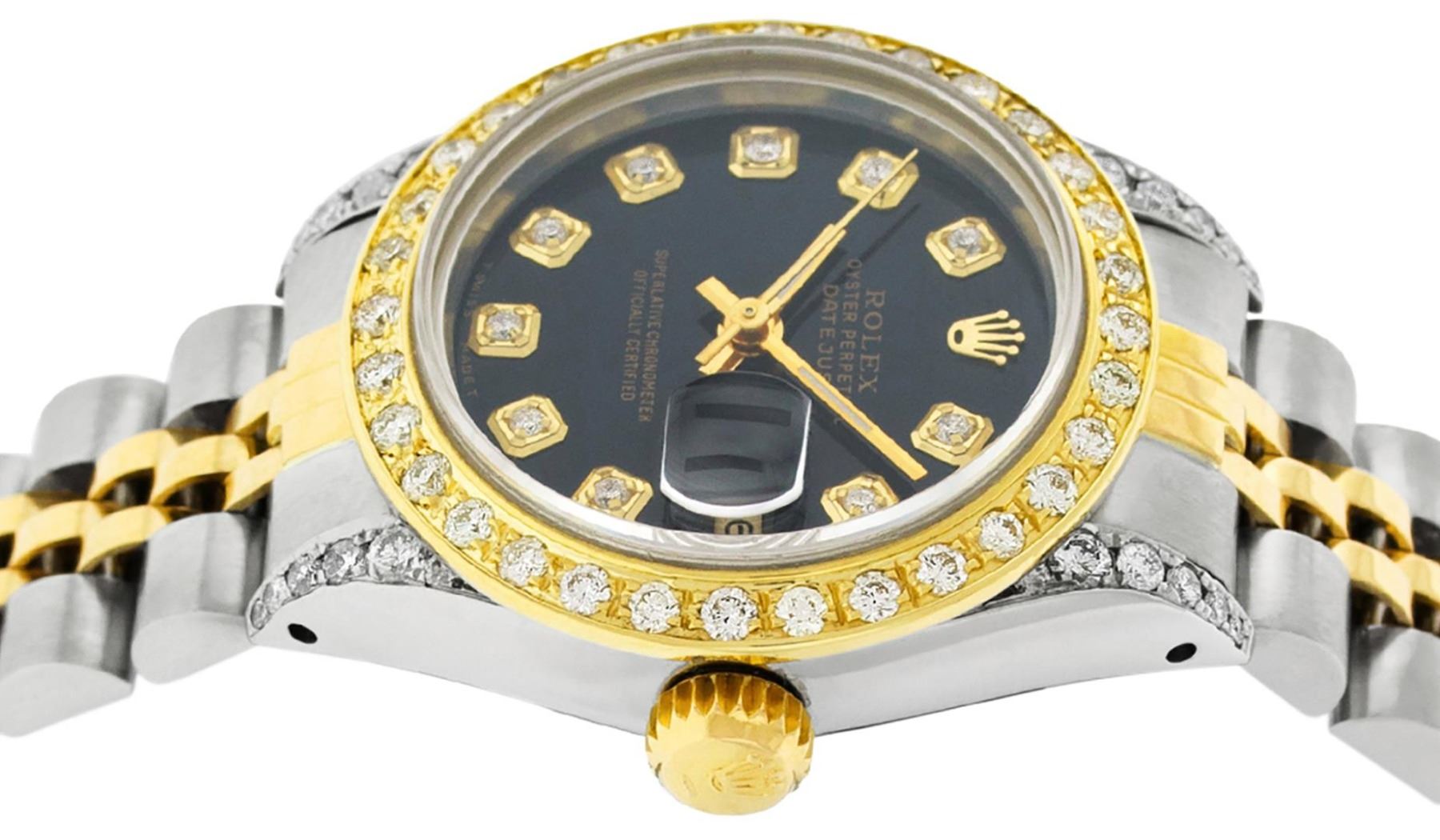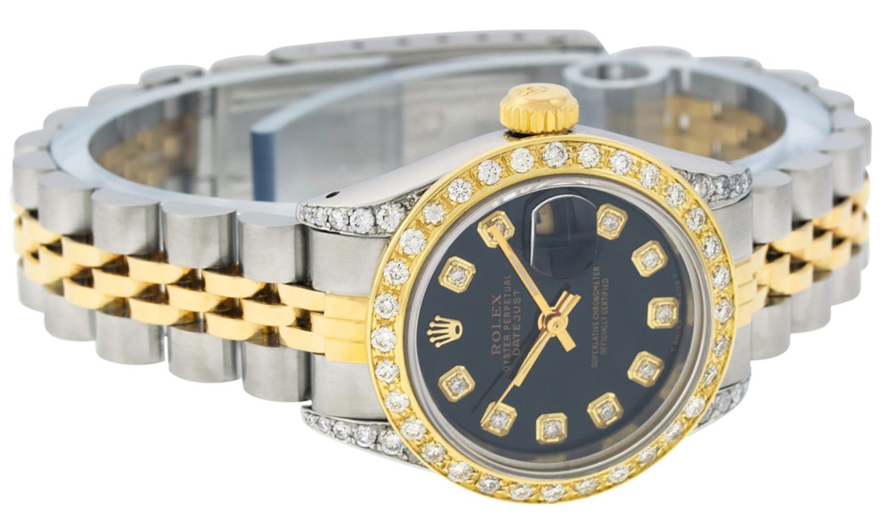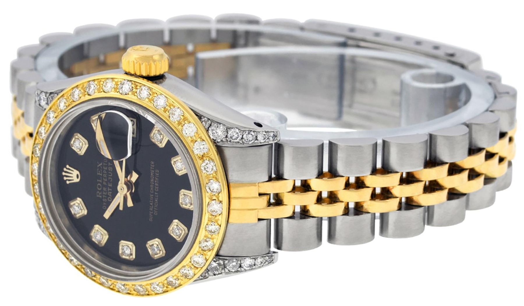 One Ladies Pre Owned Quickset Two Tone Yellow Gold And Stainless Steel Rolex Datejust Polished, Serviced And Electronically Tested, Yellow Gold And Stainless Steel Case: 26mm, Yellow Gold Crown, Custom Diamond Lugs: 24 Added Diamonds On Lugs. Custom Bezel: New 18K Yellow Gold Beadset Diamond Bezel, Diamond Count: 32 Diamonds. Custom Crystal: New Sapphire With Magnified Date Window. Custom Hands: New Luminescent Hands. Rolex Movement: Automatic Winding Movement 2135. Custom Dial: Custom Black Dial With Added Diamond Hour Markers, Diamond Count: 10 Diamonds. Date Window: 3 O'Clock Position Date Display, Model: Datejust. Condition: G-6 Extra Fine. Rolex Bracelet: Two Tone Yellow Gold And Stainless Steel Jubilee Band. Bright Polish. 6.0 Inch Length, Adjustable. Standard Clasp, With Rolex Logo. This Watch Has Been Serviced Time Tested And Is In Excellent Condition It Is Free Of All Scratches And Dents.