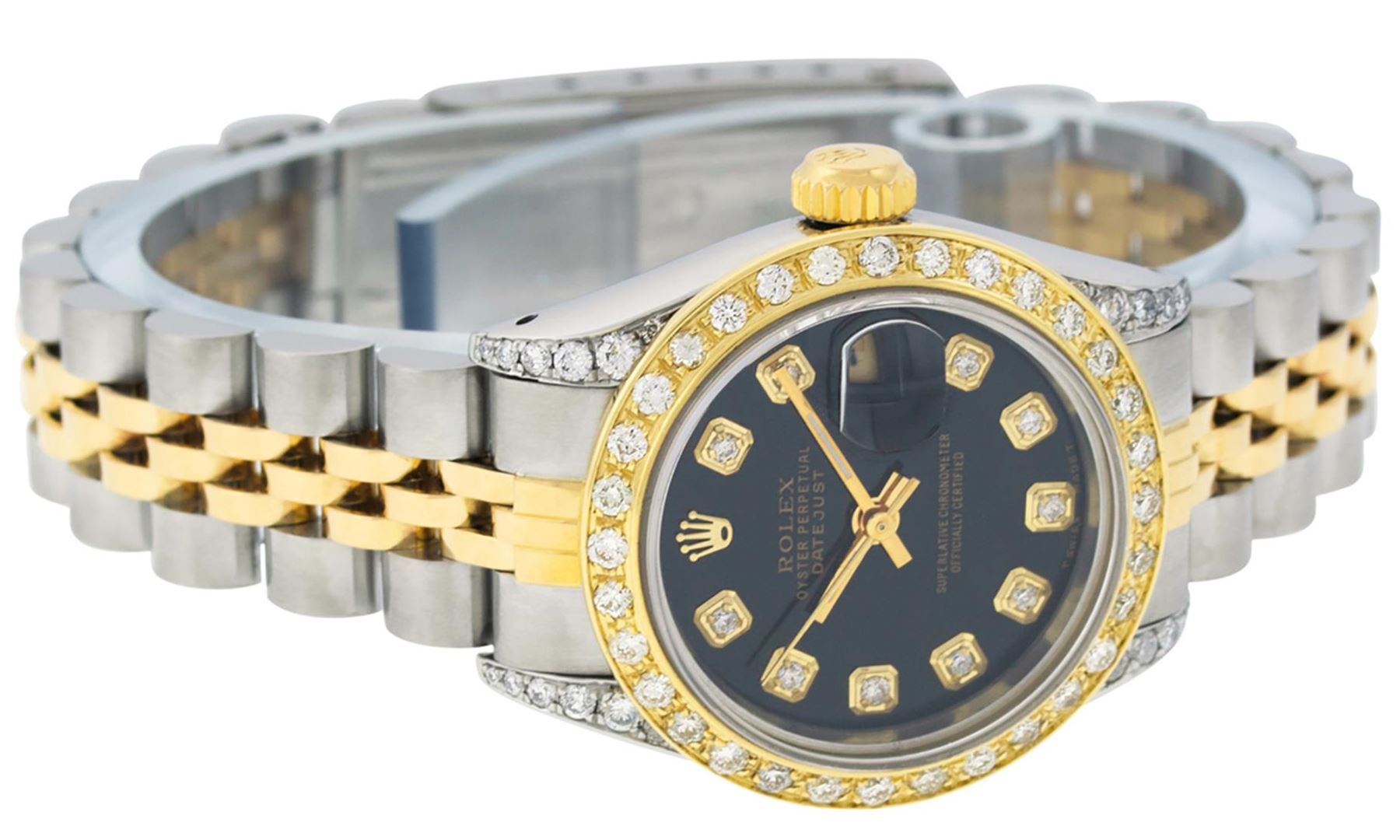 One Ladies Pre Owned Quickset Two Tone Yellow Gold And Stainless Steel Rolex Datejust Polished, Serviced And Electronically Tested, Yellow Gold And Stainless Steel Case: 26mm, Yellow Gold Crown, Custom Diamond Lugs: 24 Added Diamonds On Lugs. Custom Bezel: New 18K Yellow Gold Beadset Diamond Bezel, Diamond Count: 32 Diamonds. Custom Crystal: New Sapphire With Magnified Date Window. Custom Hands: New Luminescent Hands. Rolex Movement: Automatic Winding Movement 2135. Custom Dial: Custom Black Dial With Added Diamond Hour Markers, Diamond Count: 10 Diamonds. Date Window: 3 O'Clock Position Date Display, Model: Datejust. Condition: G-6 Extra Fine. Rolex Bracelet: Two Tone Yellow Gold And Stainless Steel Jubilee Band. Bright Polish. 6.0 Inch Length, Adjustable. Standard Clasp, With Rolex Logo. This Watch Has Been Serviced Time Tested And Is In Excellent Condition It Is Free Of All Scratches And Dents.