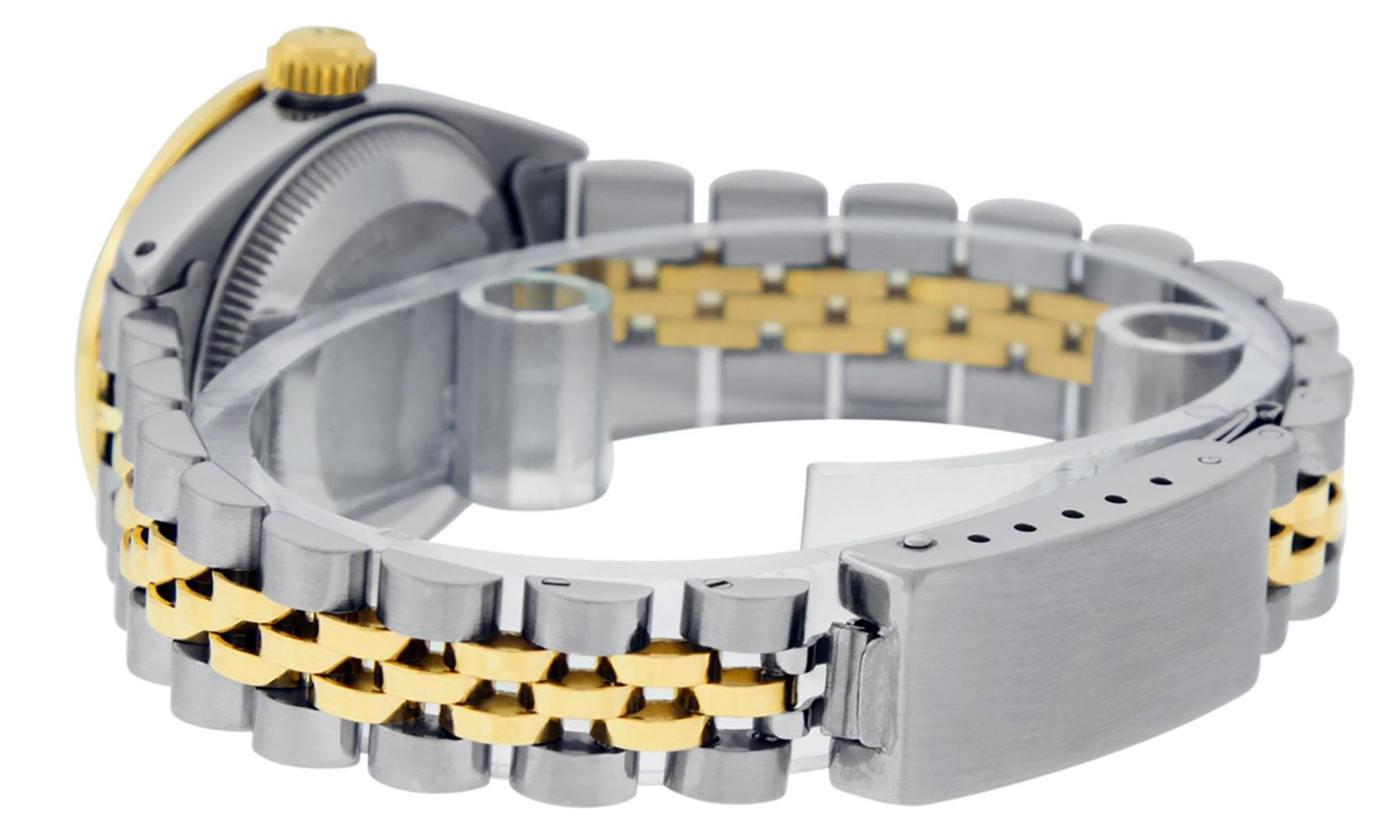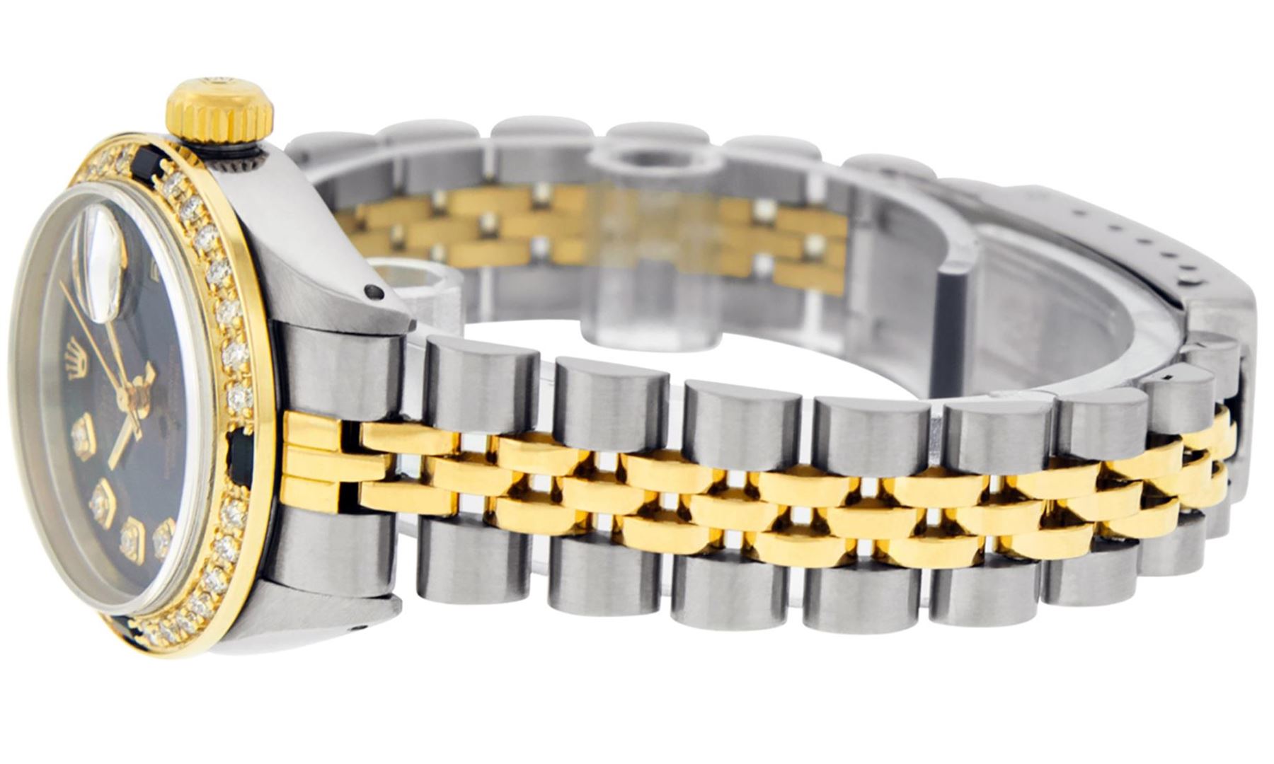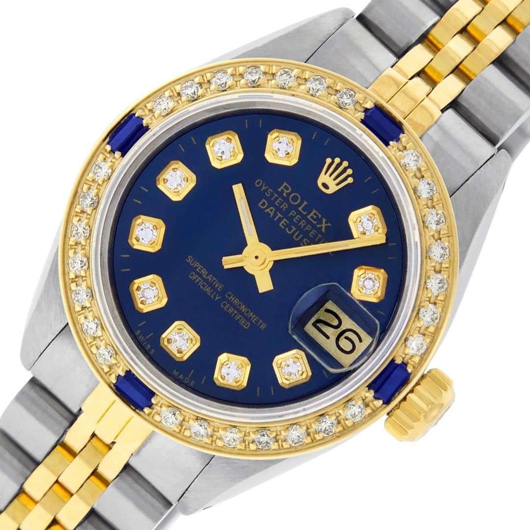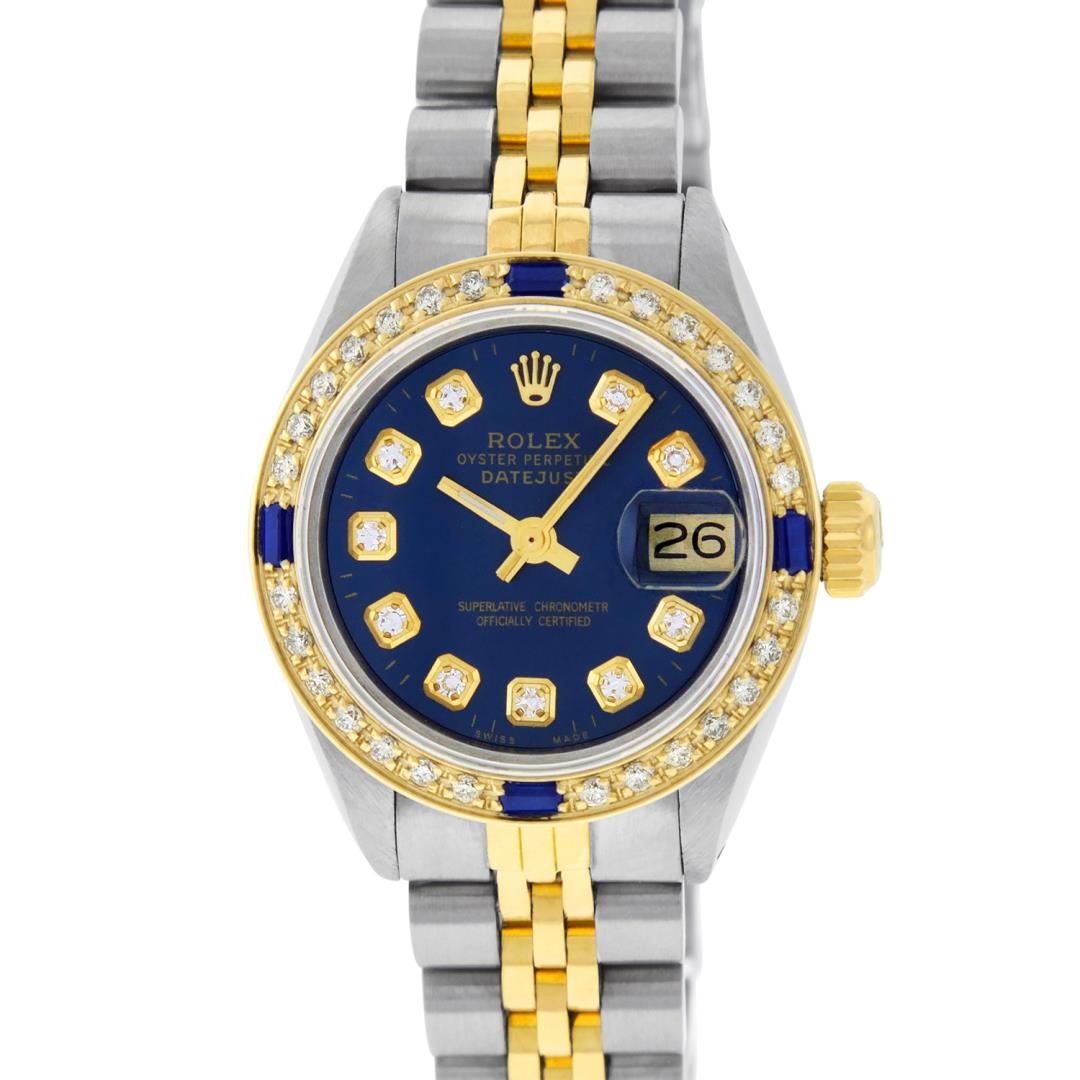 One Ladies Pre Owned Quickset Two Tone Yellow Gold And Stainless Steel Rolex Datejust Polished, Serviced And Electronically Tested, Yellow Gold And Stainless Steel Case: 26mm, Yellow Gold Crown, Custom Bezel: New 18K Yellow Gold Sapphire Beadset Diamond Bezel, Diamond + Gem Count: 28 Diamonds + 4 Sapphires. Custom Crystal: New Sapphire With Date Window. Custom Hands: New Luminescent Hands. Rolex Movement: Automatic Winding Movement 2135. Custom Dial: Custom Blue Dial With Added Diamonds, Diamond Count: 10 Diamond On Dial. Date Window: 3 O'Clock Position Date Display, Model: Datejust, Condition: G-6 Extra Fine. Rolex Bracelet: Two Tone Yellow Gold And Stainless Steel Jubilee Band. Bright Polish. 6.0 Inch Length, Adjustable. Standard Clasp, With Rolex Logo. This Watch Has Been Serviced Time Tested And Is In Excellent Condition It Is Free Of All Scratches And Dents.