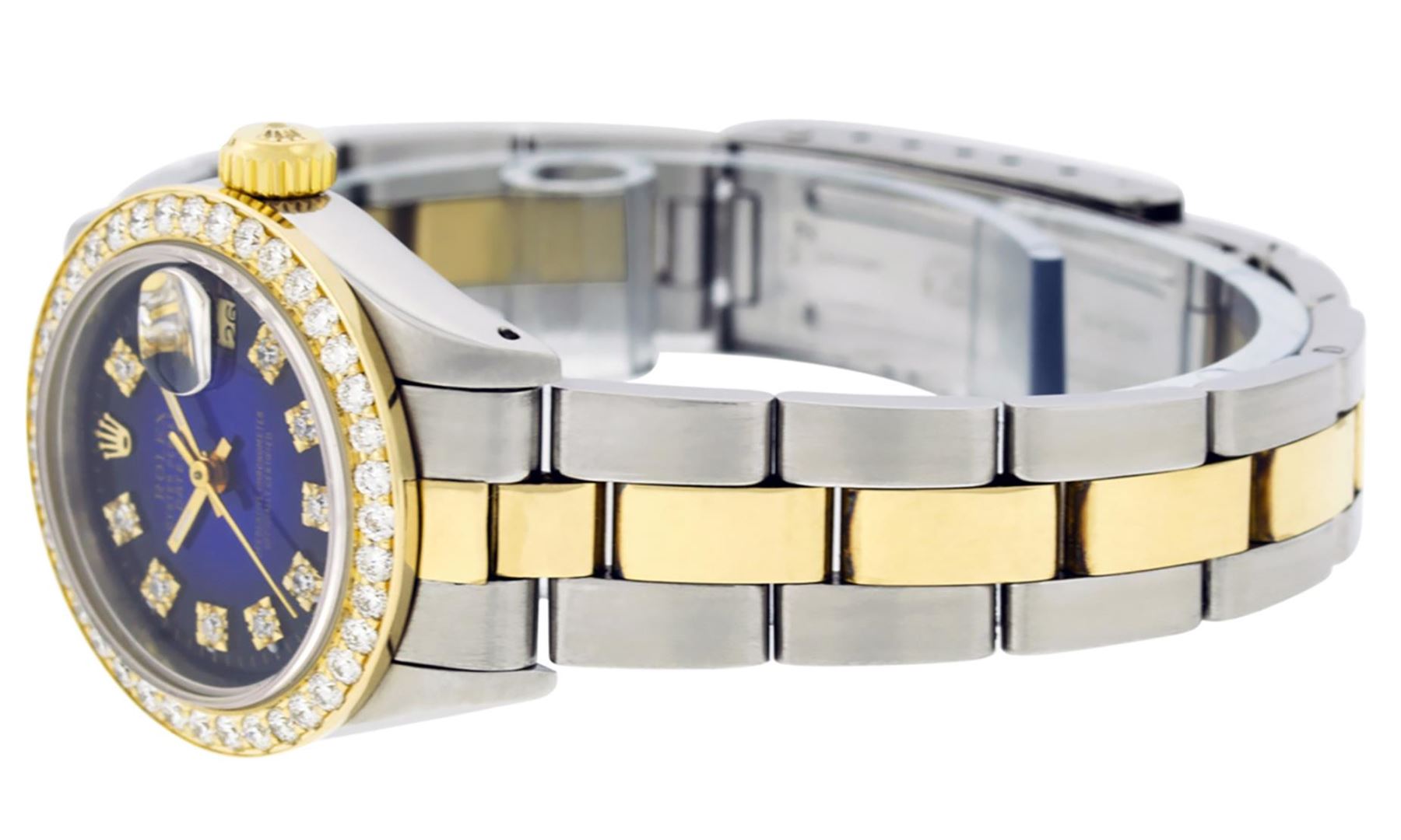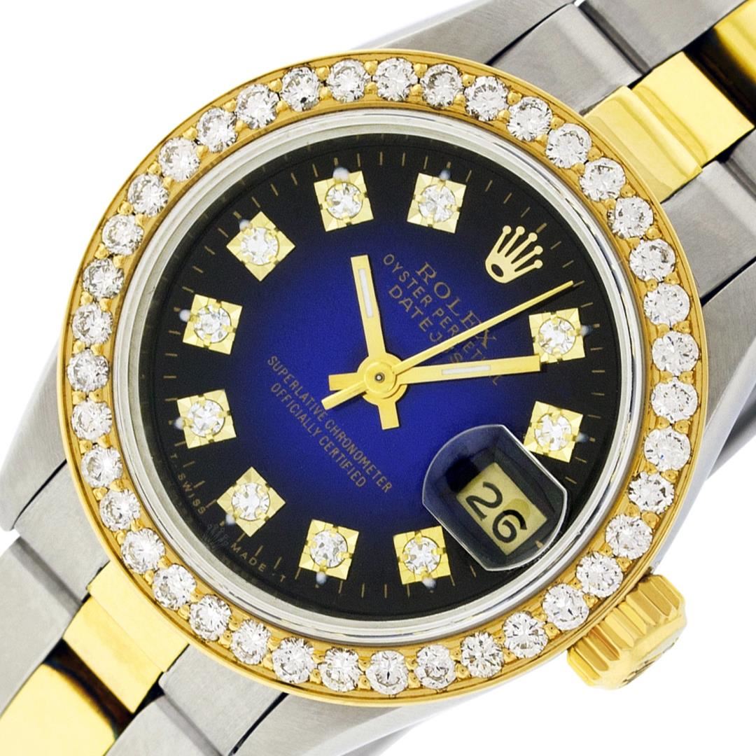 One Ladies Pre Owned Quickset Two Tone Yellow Gold And Stainless Steel Rolex Datejust Polished, Serviced And Electronically Tested, Yellow Gold And Stainless Steel Case: 26mm, Yellow Gold Crown, Custom Bezel: New 18K 1ctw Yellow Gold Beadset Diamond Bezel, Diamond Count: 42 Diamonds On Dial, Total Weight 1.00 Carat. Custom Crystal: New Sapphire With Magnified Date Window. Custom Hands: New Luminescent Hands. Rolex Movement: Automatic Winding Movement 2135. Custom Dial: Blue Vignette Dial With Added Diamonds , Diamond Count: 10 Single Cut Diamonds On Dial. Date Window: 3 O'Clock Position Date Display, Model: Datejust, Condition: G-6 Extra Fine. Rolex Bracelet: Two Tone Yellow Gold And Stainless Steel Oyster Band. Bright Polish. 6.0 Inch Length, Adjustable. Standard Clasp, With Rolex Logo. This Watch Has Been Serviced Time Tested And Is In Excellent Condition It Is Free Of All Scratches And Dents.