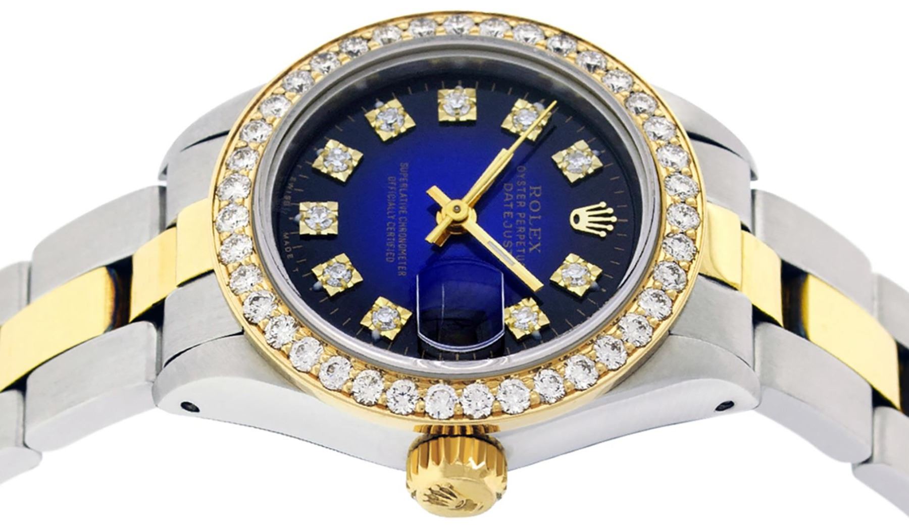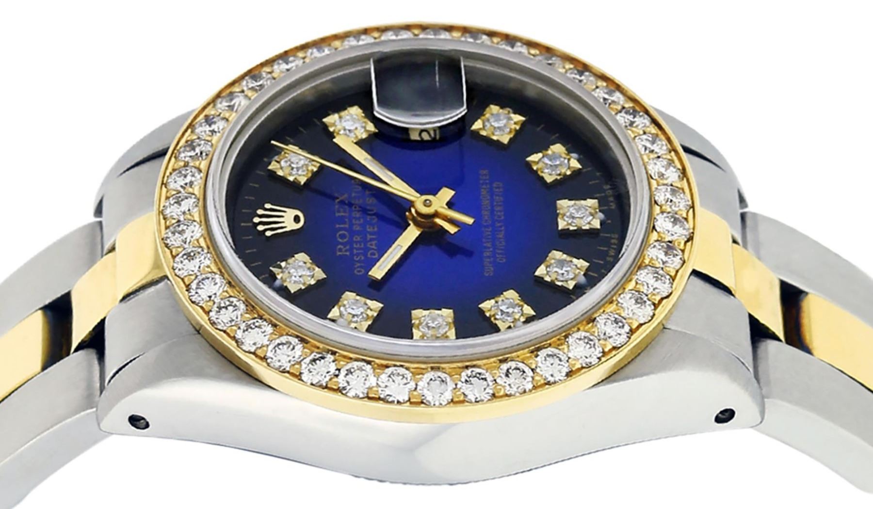 One Ladies Pre Owned Quickset Two Tone Yellow Gold And Stainless Steel Rolex Datejust Polished, Serviced And Electronically Tested, Yellow Gold And Stainless Steel Case: 26mm, Yellow Gold Crown, Custom Bezel: New 18K 1ctw Yellow Gold Beadset Diamond Bezel, Diamond Count: 42 Diamonds On Dial, Total Weight 1.00 Carat. Custom Crystal: New Sapphire With Magnified Date Window. Custom Hands: New Luminescent Hands. Rolex Movement: Automatic Winding Movement 2135. Custom Dial: Blue Vignette Dial With Added Diamonds , Diamond Count: 10 Single Cut Diamonds On Dial. Date Window: 3 O'Clock Position Date Display, Model: Datejust, Condition: G-6 Extra Fine. Rolex Bracelet: Two Tone Yellow Gold And Stainless Steel Oyster Band. Bright Polish. 6.0 Inch Length, Adjustable. Standard Clasp, With Rolex Logo. This Watch Has Been Serviced Time Tested And Is In Excellent Condition It Is Free Of All Scratches And Dents.