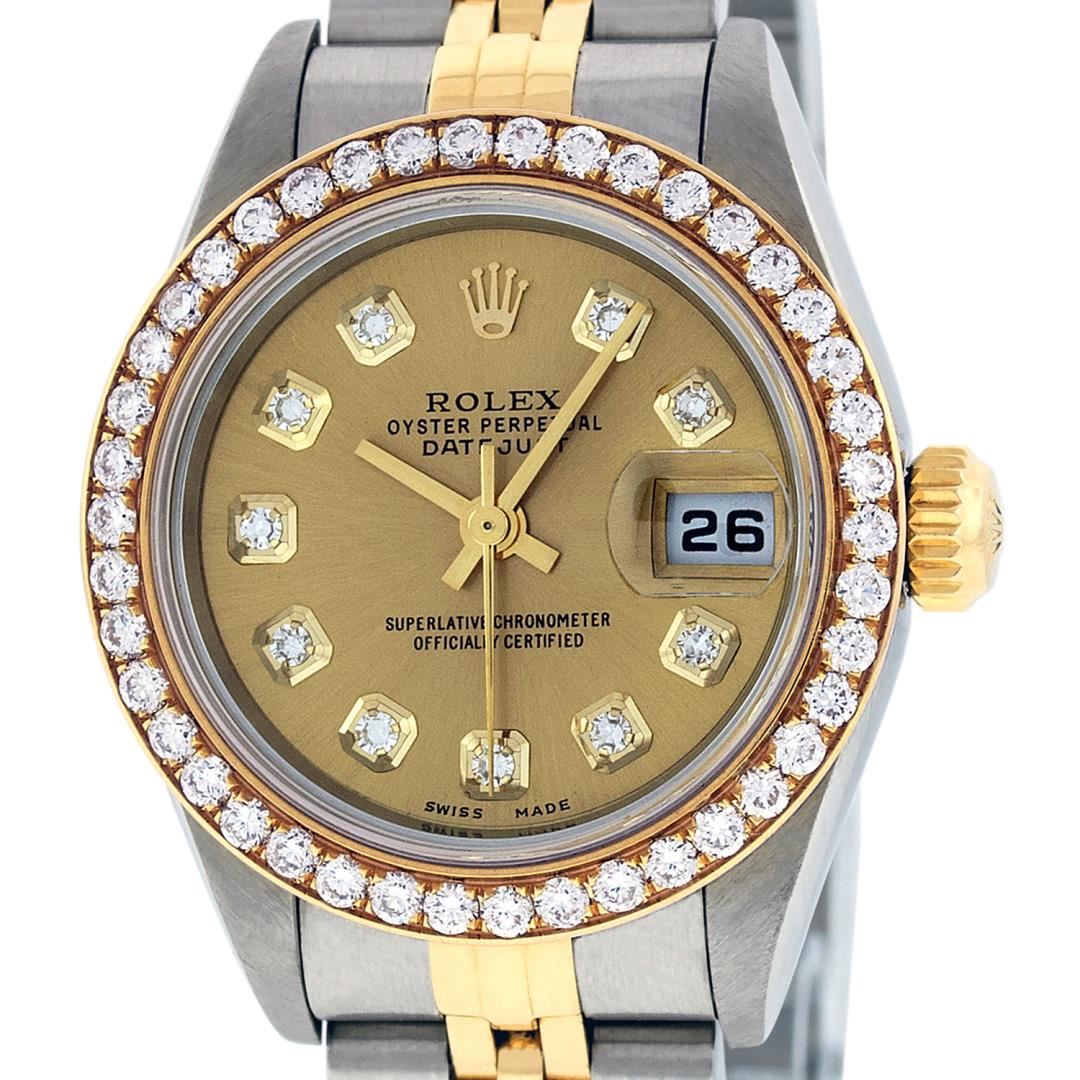 One Ladies Pre Owned Quickset 18K Yellow Gold And Stainless Steel Rolex Datejust Polished, Serviced And Electronically Tested, 18K Yellow Gold And Stainless Steel Case: 26mm, 18K Yellow Gold Crown, Custom Bezel: New 18K Yellow Gold Beadset Diamond Bezel, Diamond Count: 42 Diamonds On dial, Total Weight 1.00 Carat. Custom Crystal: New Sapphire With Date Window. Custom Hands: New Solid Hands. Rolex Movement: Automatic Winding Movement 2235. Custom Dial: Custom Champagne Dial With Added Diamonds, Stone Count: 10 Diamonds. Date Window: 3 O'Clock Position Date Display, Model: Quickset Datejust. Condition: G-6 Extra Fine. Rolex Bracelet: Two Tone 18K Yellow Gold And Stainless Steel Jubilee Band. Bright Polish. 6.0 Inch Length, Adjustable. Standard Clasp, With Rolex Logo. This Watch Has Been Serviced Time Tested And Is In Excellent Condition It Is Free Of All Scratches And Dents.