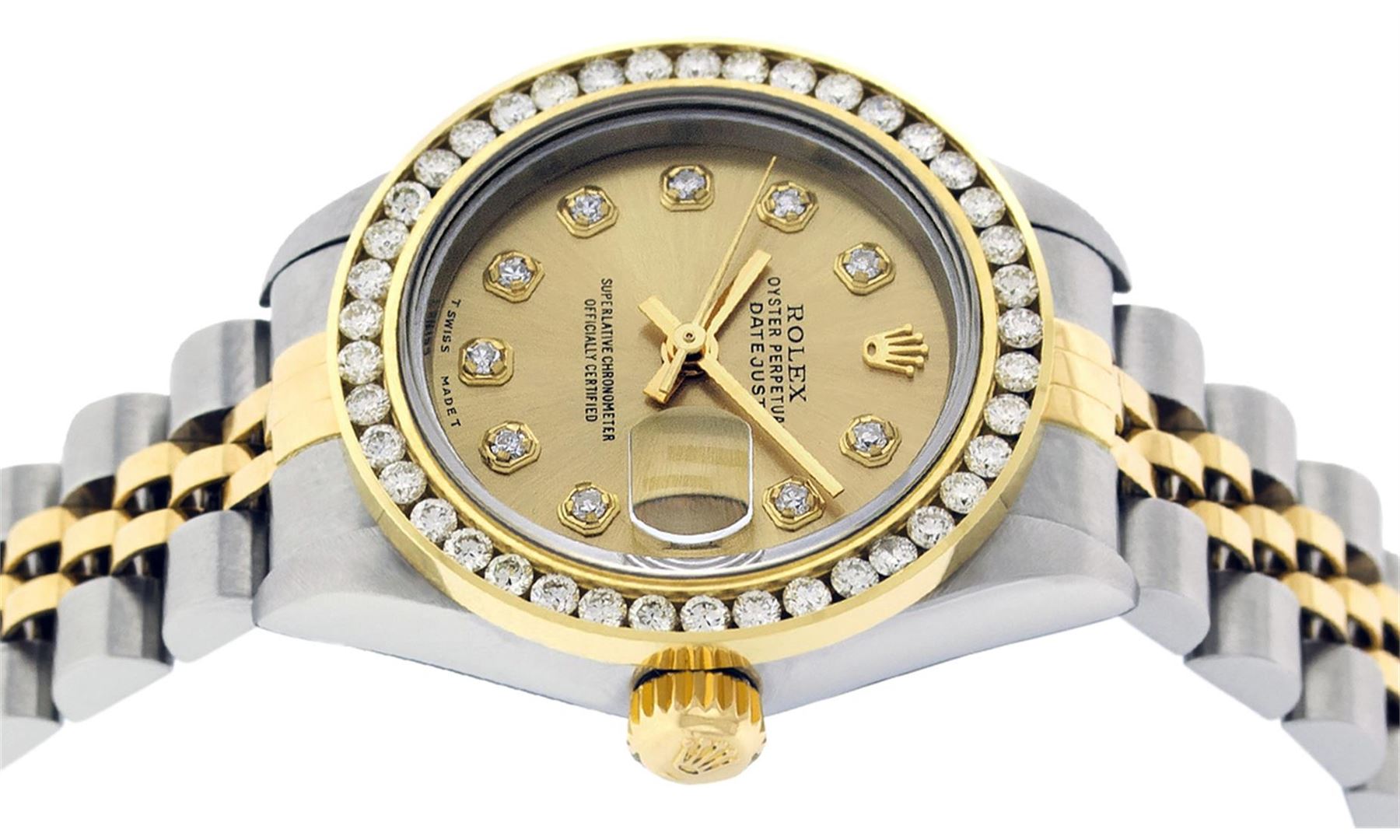 One Ladies 18K Two Tone Rolex Datejust Polished, Serviced & Electronically Tested, 18K Yellow Gold & Stainless Steel Case: 26mm, 18K Yellow Gold Crown, Custom Bezel: New 18K Yellow Gold Channel Set Diamond Bezel, Diamond Count: 44 Diamonds in dial, Total Weight 1.00 Carat, Clarity: SI-VS, Color: G to H. Custom Crystal: New Synthetic Sapphire Cyclops Lens. Custom Hands: New Luminescent Hands. Movement: Automatic Winding Movement Caliber 2235. Custom Dial: Champagne Single Cut Diamond Dial, Stone Count: 10 Diamonds, Clarity: VS2, Color: G to H. Date Window: 3 O'Clock Position Date Display, Model: Datejust. Condition: G-6 Extra Fine. Bracelet: Two Tone 18K Yellow Gold & Stainless Steel Jubilee Band. Bright Polish.�6.0 Inch Length, Adjustable. Standard Clasp, With Rolex Logo. This Watch Has Been Serviced Time Tested And Is In Excellent Condition It Is Free Of All Scratches And Dents.