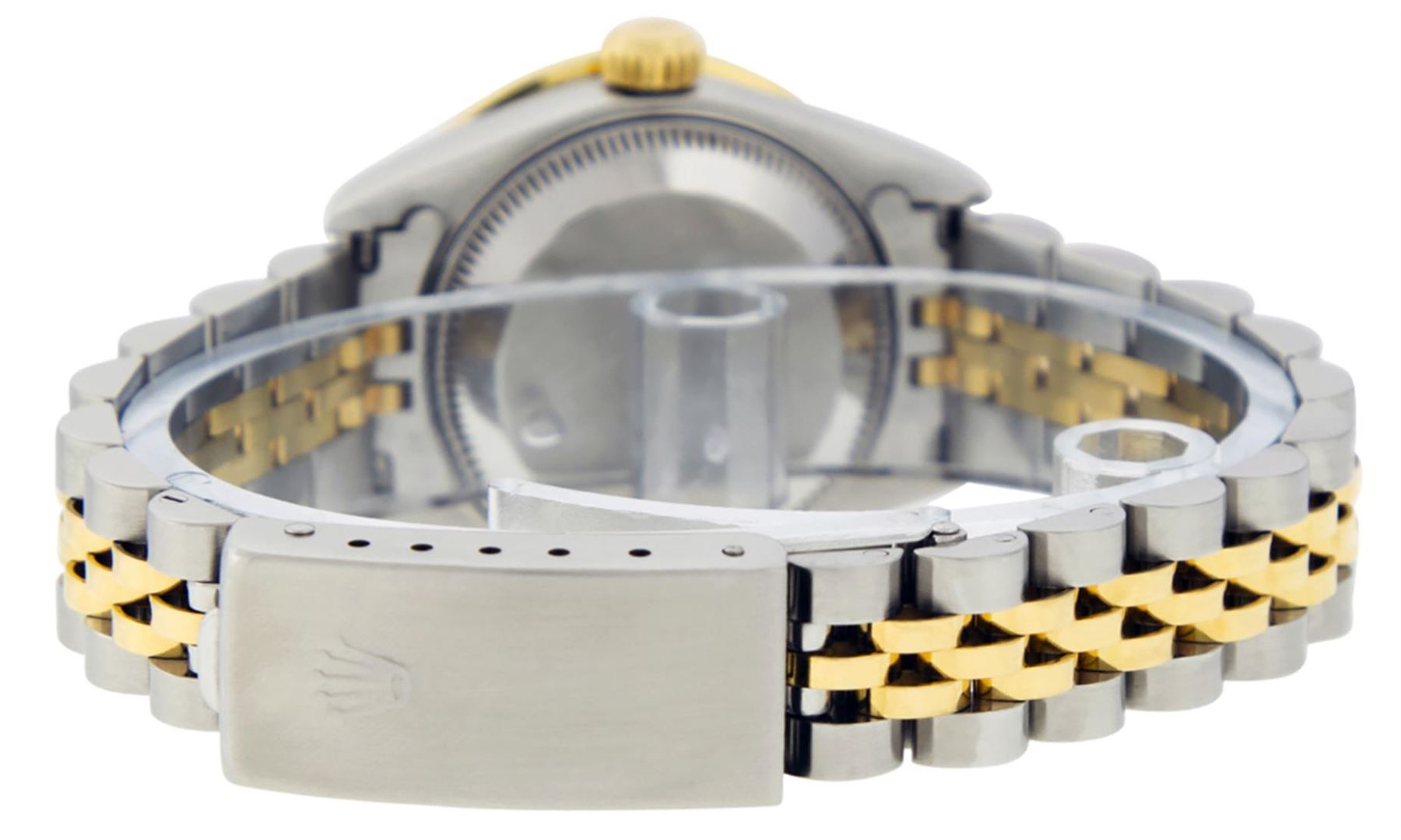 One Ladies Pre Owned 18K Yellow Gold And Stainless Steel Rolex Datejust Polished, Serviced And Electronically Tested, 18K Yellow Gold And Stainless Steel Case: 26mm, 18K Yellow Gold Crown, Custom Bezel: New 18K Yellow Gold Channel Set Diamond Bezel, Diamond Count: 44 Diamonds On Bezel, Total Weight 1.00 Carat. Custom Crystal: New Sapphire With Date Window. Custom Hands: New Solid Hands. Rolex Movement: Automatic Winding Movement 2235. Custom Dial: Custom Champagne Dial With Custom Added Diamonds, Stone Count: 10 Diamonds. Date Window: 3 O'Clock Position Date Display, Model: Datejust. Condition: G-6 Extra Fine. Rolex Bracelet: Two Tone 18K Yellow Gold And Stainless Steel Jubilee Band. Bright Polish. 6.0 Inch Length, Adjustable. Standard Clasp, With Rolex Logo. This Watch Has Been Serviced Time Tested And Is In Excellent Condition It Is Free Of All Scratches And Dents.