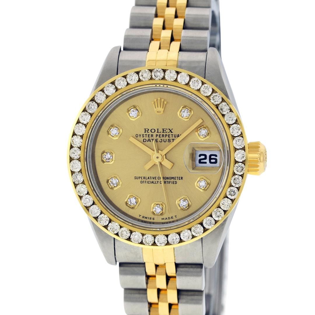 One Ladies Pre Owned 18K Yellow Gold And Stainless Steel Rolex Datejust Polished, Serviced And Electronically Tested, 18K Yellow Gold And Stainless Steel Case: 26mm, 18K Yellow Gold Crown, Custom Bezel: New 18K Yellow Gold Channel Set Diamond Bezel, Diamond Count: 44 Diamonds On Bezel, Total Weight 1.00 Carat. Custom Crystal: New Sapphire With Date Window. Custom Hands: New Solid Hands. Rolex Movement: Automatic Winding Movement 2235. Custom Dial: Custom Champagne Dial With Custom Added Diamonds, Stone Count: 10 Diamonds. Date Window: 3 O'Clock Position Date Display, Model: Datejust. Condition: G-6 Extra Fine. Rolex Bracelet: Two Tone 18K Yellow Gold And Stainless Steel Jubilee Band. Bright Polish. 6.0 Inch Length, Adjustable. Standard Clasp, With Rolex Logo. This Watch Has Been Serviced Time Tested And Is In Excellent Condition It Is Free Of All Scratches And Dents.