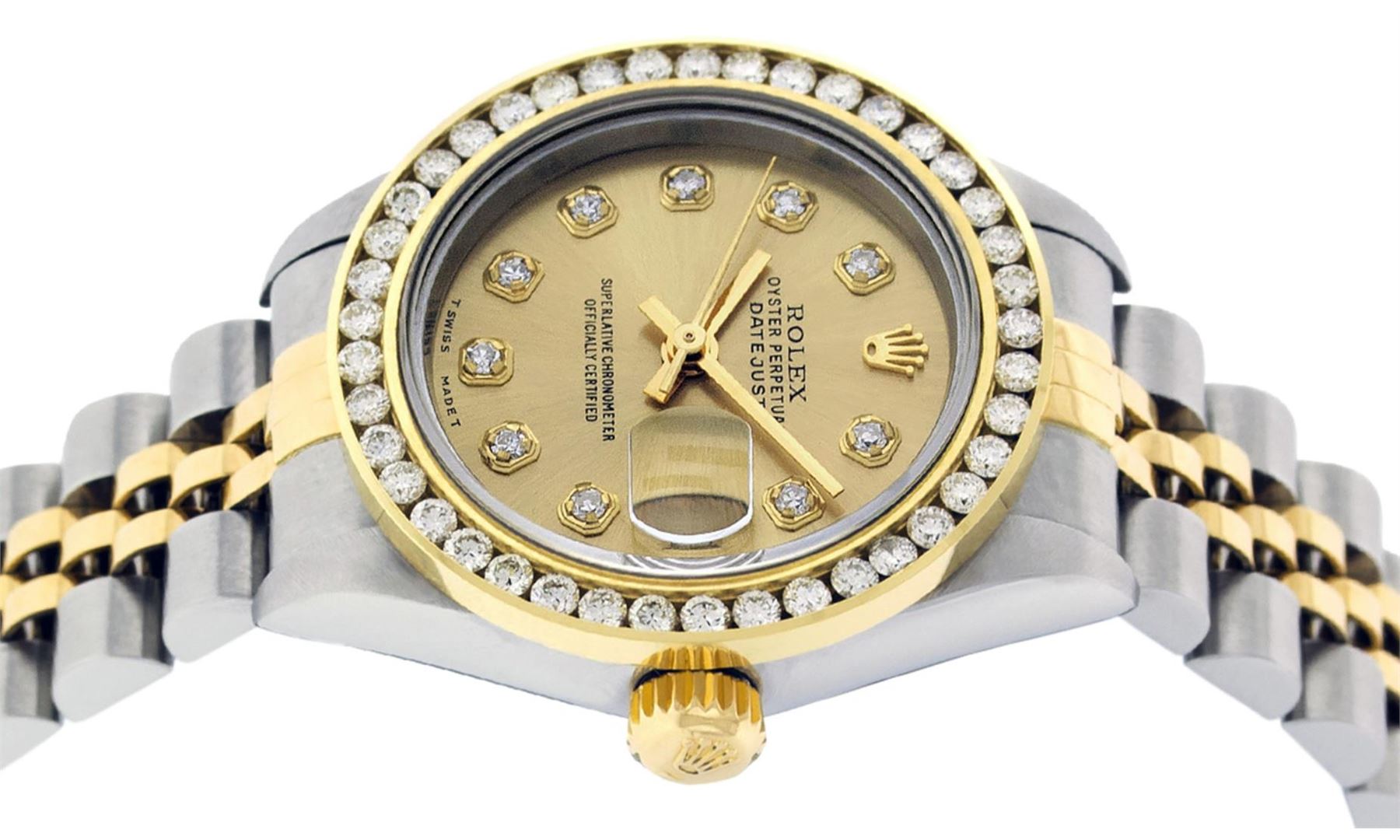 One Ladies Pre Owned 18K Yellow Gold And Stainless Steel Rolex Datejust Polished, Serviced And Electronically Tested, 18K Yellow Gold And Stainless Steel Case: 26mm, 18K Yellow Gold Crown, Custom Bezel: New 18K Yellow Gold Channel Set Diamond Bezel, Diamond Count: 44 Diamonds On Bezel, Total Weight 1.00 Carat. Custom Crystal: New Sapphire With Date Window. Custom Hands: New Solid Hands. Rolex Movement: Automatic Winding Movement 2235. Custom Dial: Custom Champagne Dial With Custom Added Diamonds, Stone Count: 10 Diamonds. Date Window: 3 O'Clock Position Date Display, Model: Datejust. Condition: G-6 Extra Fine. Rolex Bracelet: Two Tone 18K Yellow Gold And Stainless Steel Jubilee Band. Bright Polish. 6.0 Inch Length, Adjustable. Standard Clasp, With Rolex Logo. This Watch Has Been Serviced Time Tested And Is In Excellent Condition It Is Free Of All Scratches And Dents.