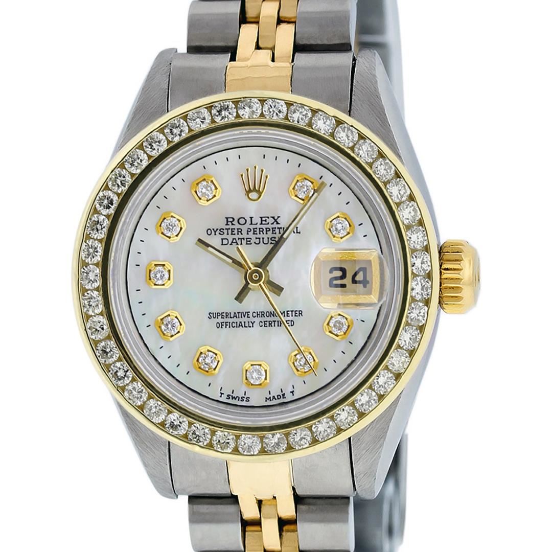 One Ladies Pre Owned 18K Yellow Gold And Stainless Steel Rolex Datejust Polished, Serviced And Electronically Tested, 18K Yellow Gold And Stainless Steel Case: 26mm, 18K Yellow Gold Crown, Custom Bezel: New 18K Yellow Gold Channel Set Diamond Bezel, Diamond Count: 44 Diamonds On Bezel, Total Weight 1.00 Carat. Custom Crystal: New Sapphire With Date Window. Custom Hands: New Luminescent Hands. Rolex Movement: Automatic Winding Movement 2235. Custom Dial: Custom White Diamond Dial, Diamond Count: 10 Diamonds. Date Window: 3 O'Clock Position Date Display, Model: Datejust. Condition: G-6 Extra Fine. Rolex Bracelet: Two Tone 18K Yellow Gold And Stainless Steel Jubilee Band. Bright Polish. 6.0 Inch Length, Adjustable. Standard Clasp, With Rolex Logo. This Watch Has Been Serviced Time Tested And Is In Excellent Condition It Is Free Of All Scratches And Dents.