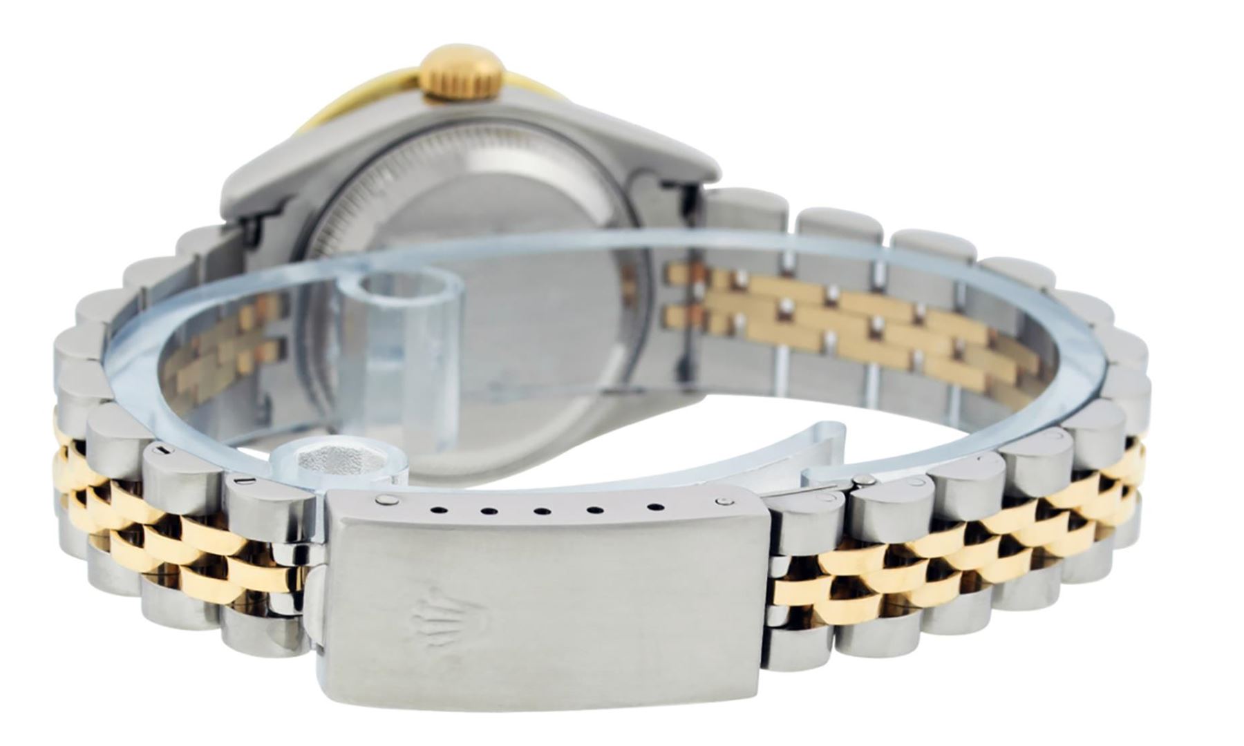 One Ladies Pre Owned 18K Yellow Gold And Stainless Steel Rolex Datejust Polished, Serviced And Electronically Tested, 18K Yellow Gold And Stainless Steel Case: 26mm, 18K Yellow Gold Crown, Custom Bezel: New 18K Yellow Gold Channel Set Diamond Bezel, Diamond Count: 44 Diamonds On Bezel, Total Weight 1.00 Carat. Custom Crystal: New Sapphire With Date Window. Custom Hands: New Luminescent Hands. Rolex Movement: Automatic Winding Movement 2235. Custom Dial: Custom White Diamond Dial, Diamond Count: 10 Diamonds. Date Window: 3 O'Clock Position Date Display, Model: Datejust. Condition: G-6 Extra Fine. Rolex Bracelet: Two Tone 18K Yellow Gold And Stainless Steel Jubilee Band. Bright Polish. 6.0 Inch Length, Adjustable. Standard Clasp, With Rolex Logo. This Watch Has Been Serviced Time Tested And Is In Excellent Condition It Is Free Of All Scratches And Dents.