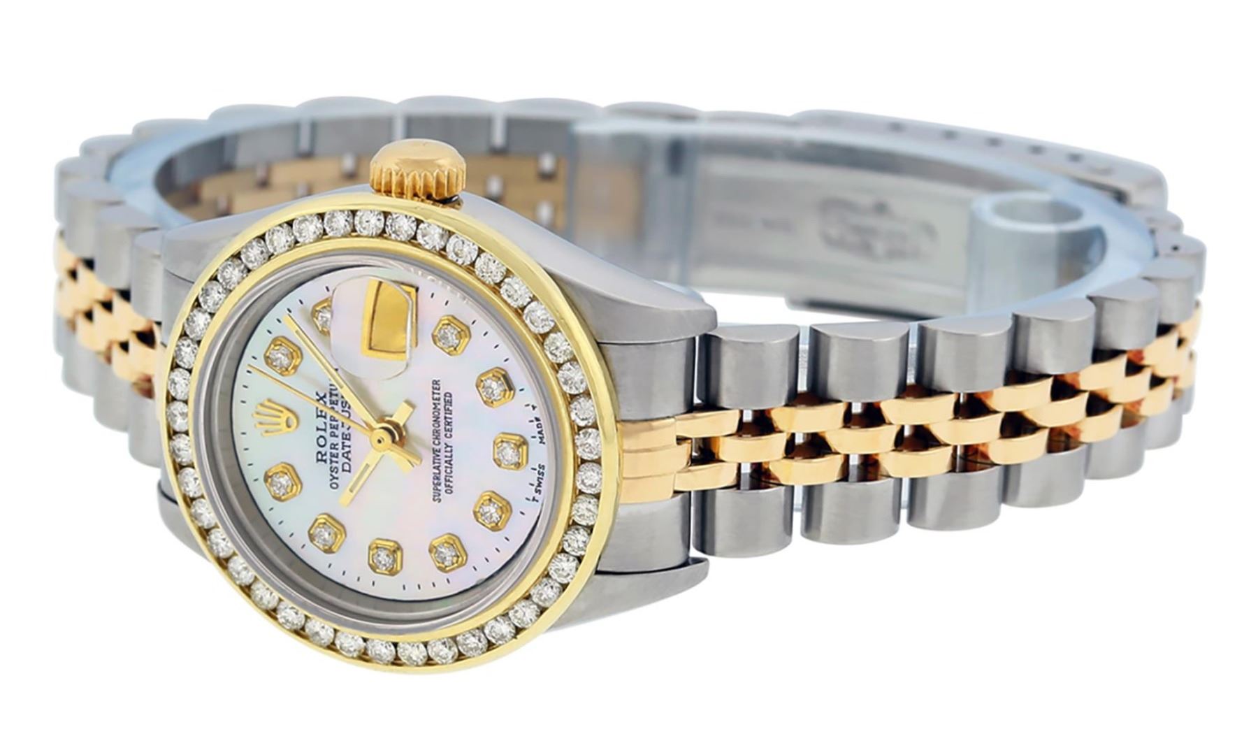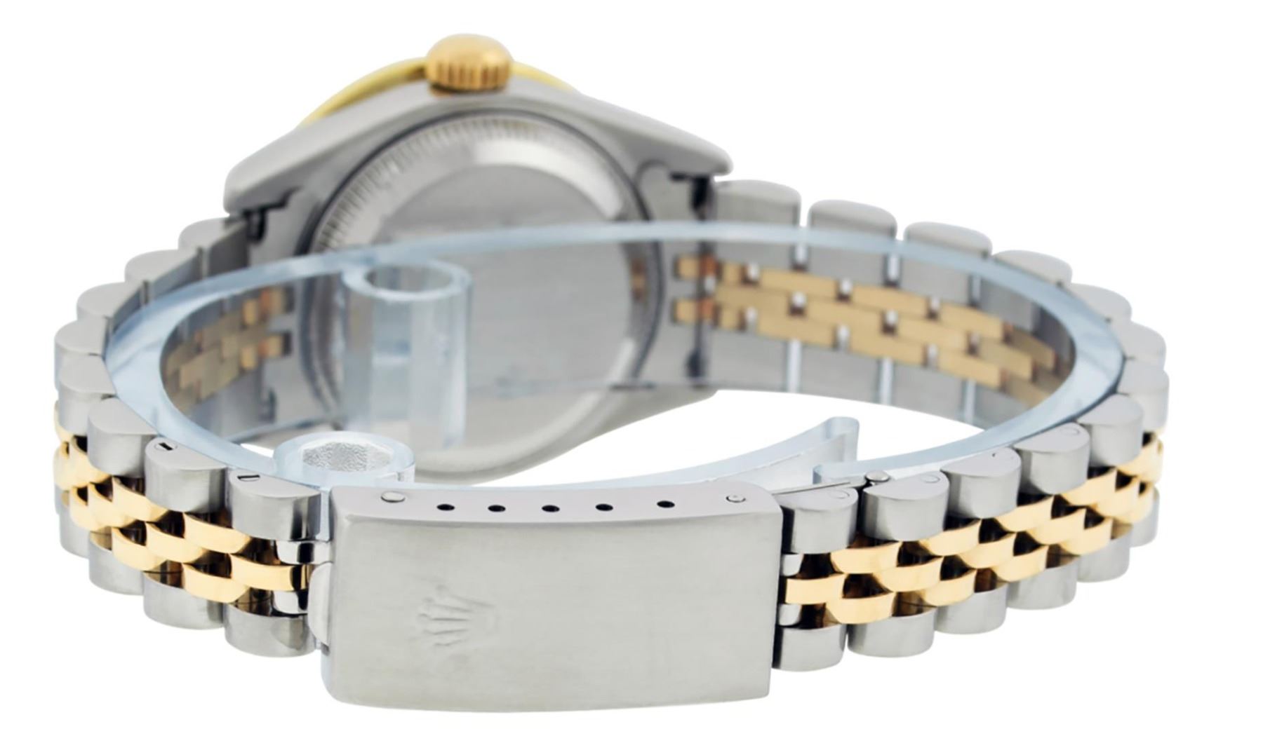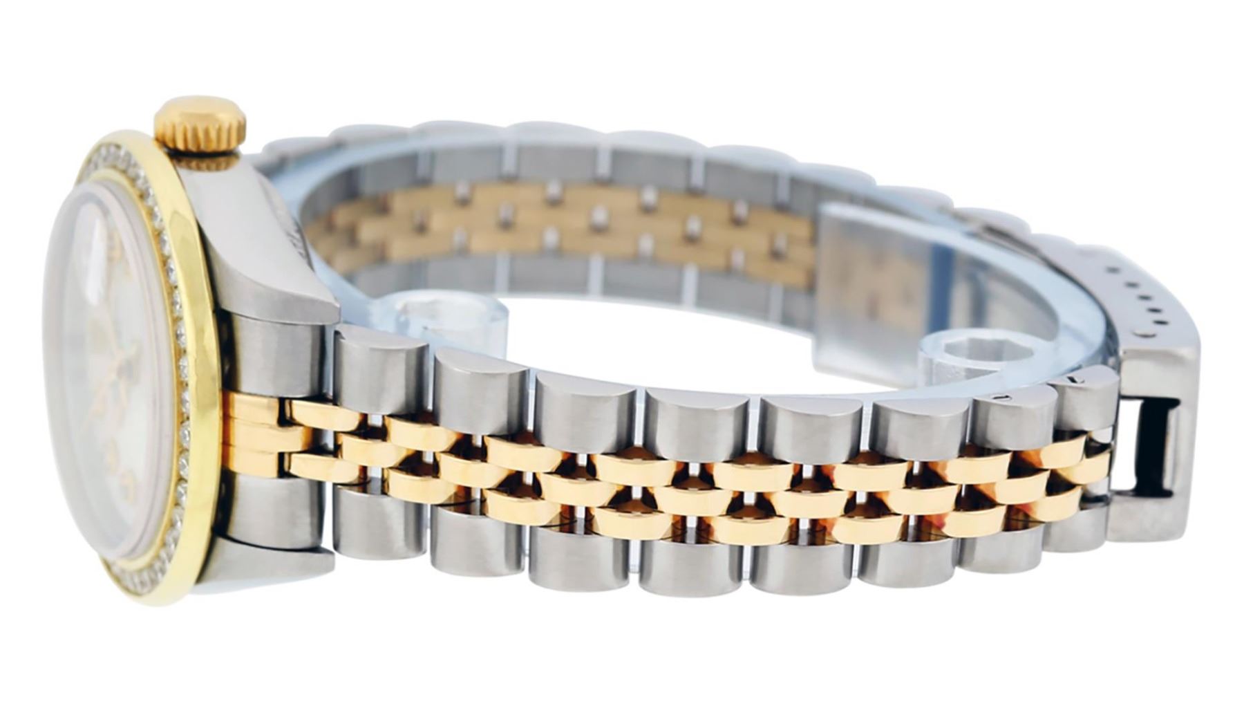 One Ladies Pre Owned 18K Yellow Gold And Stainless Steel Rolex Datejust Polished, Serviced And Electronically Tested, 18K Yellow Gold And Stainless Steel Case: 26mm, 18K Yellow Gold Crown, Custom Bezel: New 18K Yellow Gold Channel Set Diamond Bezel, Diamond Count: 44 Diamonds On Bezel, Total Weight 1.00 Carat. Custom Crystal: New Sapphire With Date Window. Custom Hands: New Luminescent Hands. Rolex Movement: Automatic Winding Movement 2235. Custom Dial: Custom White Diamond Dial, Diamond Count: 10 Diamonds. Date Window: 3 O'Clock Position Date Display, Model: Datejust. Condition: G-6 Extra Fine. Rolex Bracelet: Two Tone 18K Yellow Gold And Stainless Steel Jubilee Band. Bright Polish. 6.0 Inch Length, Adjustable. Standard Clasp, With Rolex Logo. This Watch Has Been Serviced Time Tested And Is In Excellent Condition It Is Free Of All Scratches And Dents.