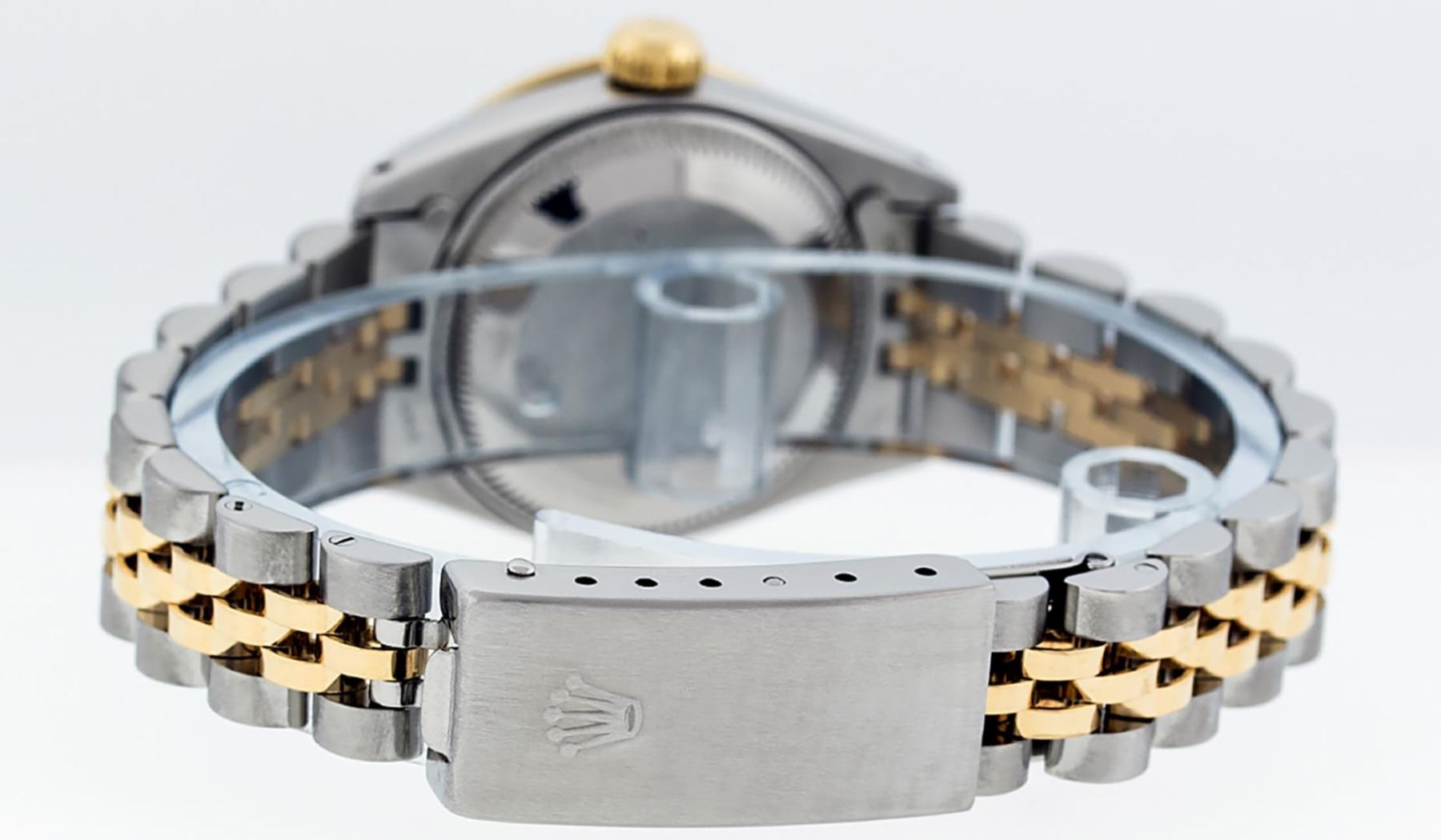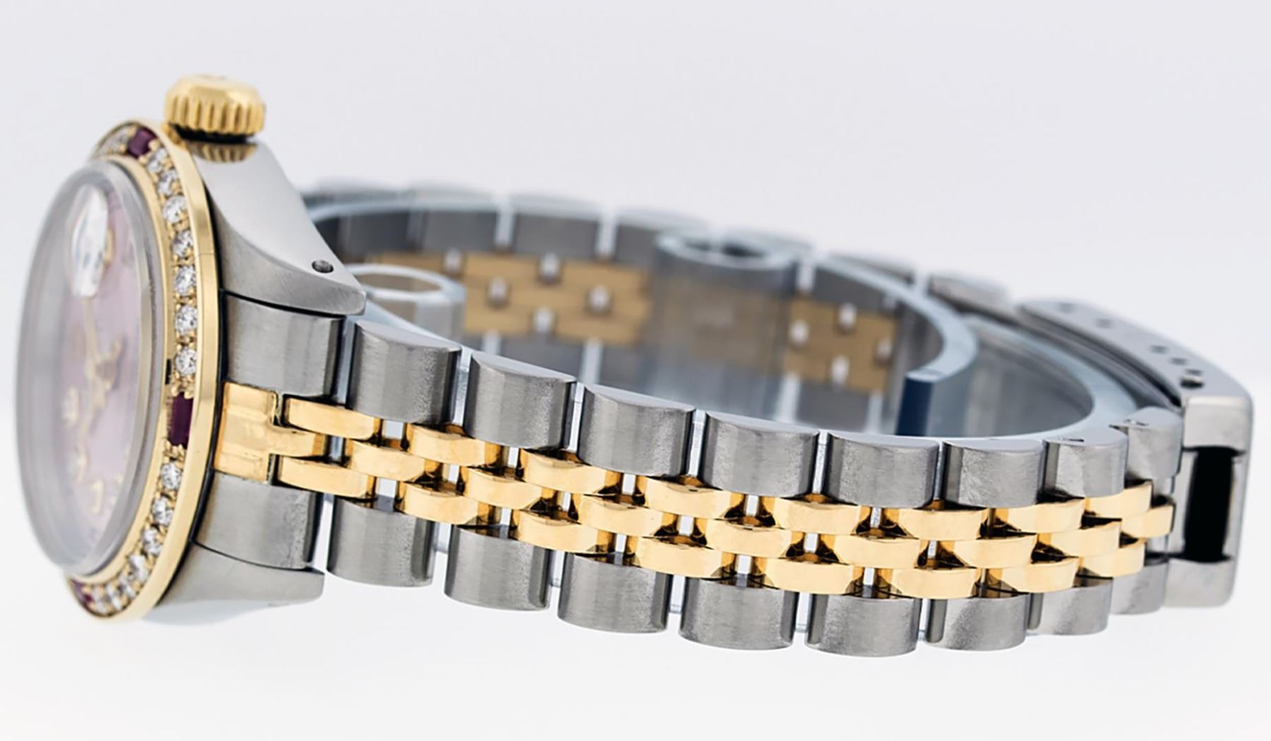 One Ladies Pre Owned Quickset Two Tone Yellow Gold And Stainless Steel Rolex Datejust Polished, Serviced And Electronically Tested, Rolex Yellow Gold And Stainless Steel Case: 26mm, Rolex Yellow Gold Crown, Custom Bezel: New 18K Yellow Gold Ruby Beadset Diamond Bezel, Diamond + Gem Count: 28 Diamonds + 4 Rubies. Custom Crystal: New Sapphire With Magnified Date Window. Custom Hands: New Luminescent Hands. Rolex Movement: Automatic Winding Movement 2135. Custom Dial: Custom Pink Dial With Added Diamond Hour Markers, Diamond Count: 10 Diamond On Dial. Date Window: 3 O'Clock Position Date Display, Model: Datejust, Condition: G-6 Extra Fine. Rolex Bracelet: Two Tone Yellow Gold And Stainless Steel Jubilee Band. Bright Polish. 6.0 Inch Length, Adjustable. Standard Clasp, With Rolex Logo. This Watch Has Been Serviced Time Tested And Is In Excellent Condition It Is Free Of All Scratches And Dents.