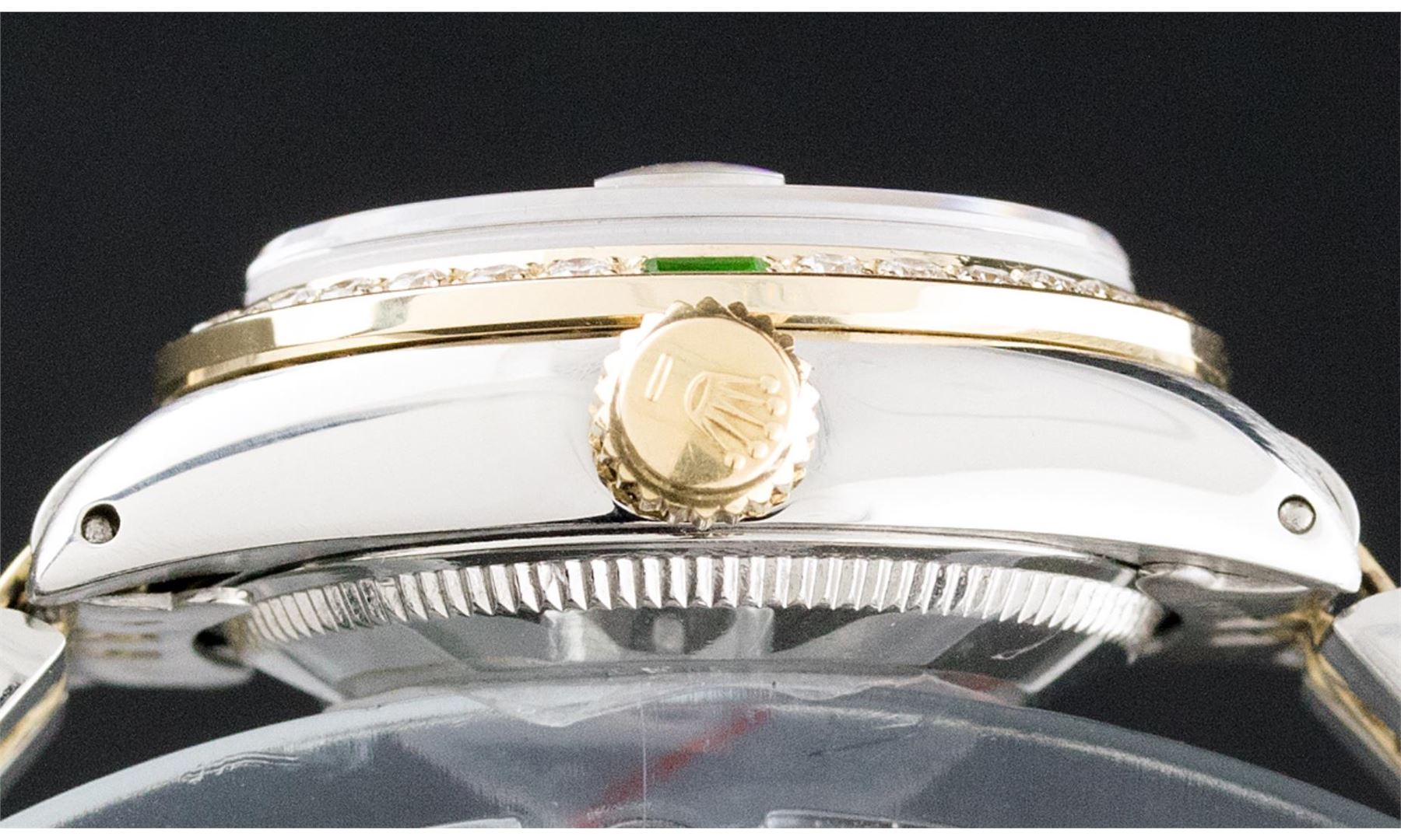 One Ladies Pre Owned Quickset Two Tone Yellow Gold And Stainless Steel Rolex Datejust Polished, Serviced And Electronically Tested, Yellow Gold And Stainless Steel Case: 26mm, Yellow Gold Crown, Custom Bezel: New 18K Yellow Gold Emerald Beadset Diamond Bezel, Diamond + Gem Count: 28 Diamonds + 4 Emeralds. Custom Crystal: New Sapphire With Date Window. Custom Hands: New Luminescent Hands. Rolex Movement: Automatic Winding Movement 2135. Custom Dial: Custom White Dial With Added Diamond Hour Markers, Diamond Count: 10 Diamond On Dial. Date Window: 3 O'Clock Position Date Display, Model: Datejust, Condition: G-6 Extra Fine. Rolex Bracelet: Two Tone Yellow Gold And Stainless Steel Jubilee Band. Bright Polish. 6.0 Inch Length, Adjustable. Standard Clasp, With Rolex Logo. This Watch Has Been Serviced Time Tested And Is In Excellent Condition It Is Free Of All Scratches And Dents.