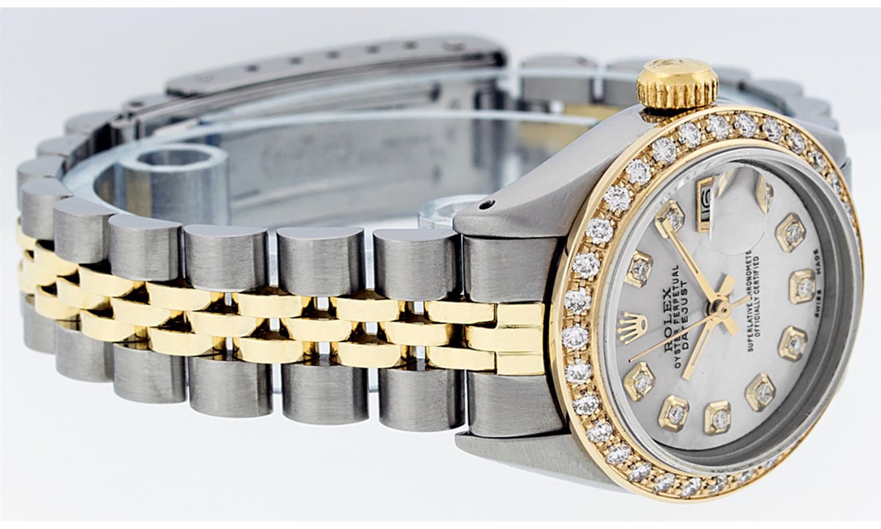 One Ladies Pre Owned Two Tone Yellow Gold And Stainless Steel Rolex Datejust Polished, Serviced And Electronically Tested, Yellow Gold And Stainless Steel Case: 26mm, Yellow Gold Crown, Custom Bezel: 18K Yellow Gold Beadset Diamond Bezel, Diamond Count: 32 Diamonds. Custom Crystal: New Sapphire With Magnified Date Window. Custom Hands: New Luminescent Hands. Rolex Movement: Automatic Winding Movement Caliber 2135. Custom Dial: Custom White Dial With Added Diamond Hour Markers, 10 Diamond On Dial. Date Window: 3 O'Clock Position Date Display, Model: Datejust. Condition: G-6 Extra Fine. Rolex Bracelet: Two Tone Yellow Gold And Stainless Steel Jubilee Band. Bright Polish. 6.0 Inch Length, Adjustable. Standard Clasp, With Rolex Logo. This Watch Has Been Serviced Time Tested And Is In Excellent Condition It Is Free Of All Scratches And Dents.