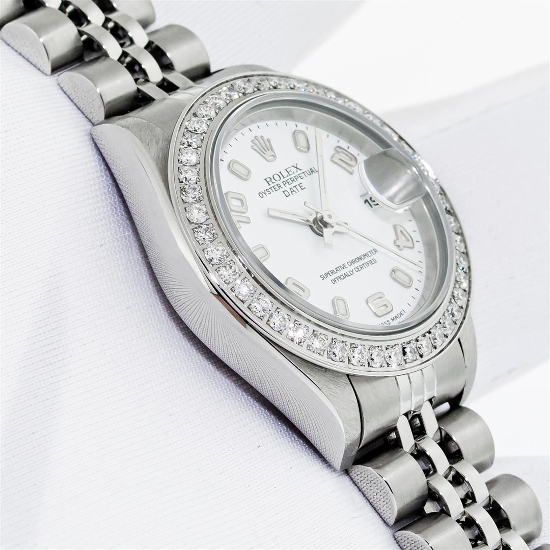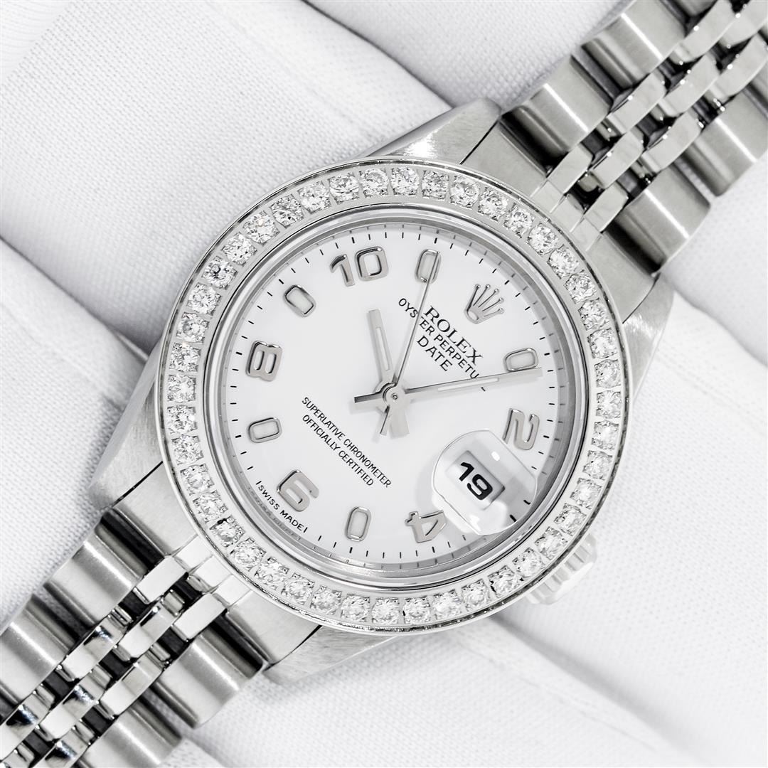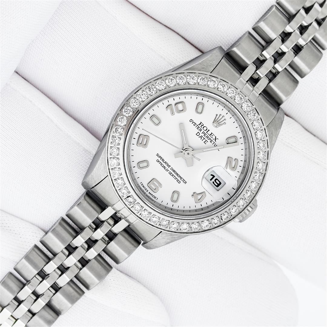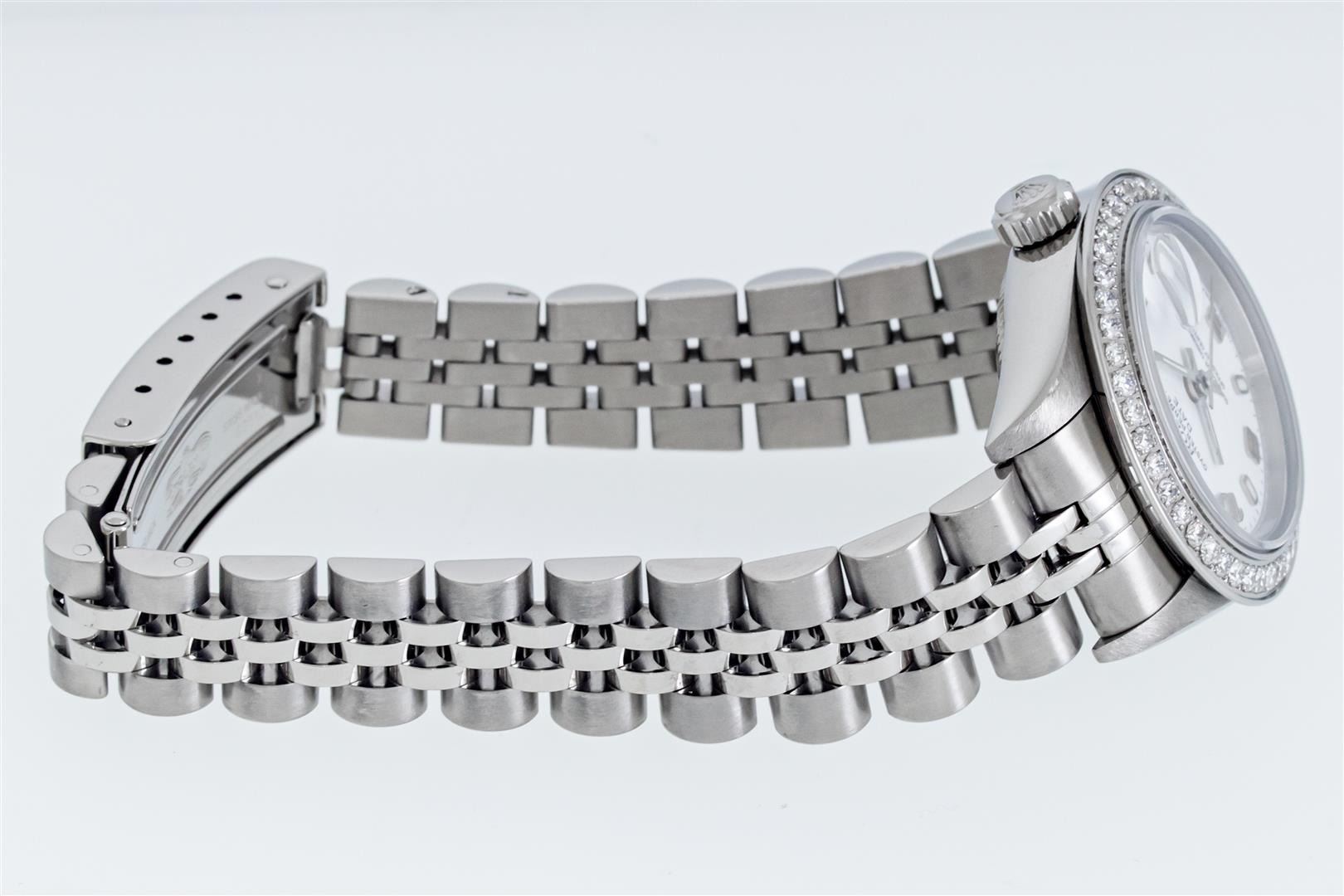 One Ladies Pre Owned Quickset Stainless Steel Rolex Datejust Polished Bright with Satin Finish, Serviced & Electronically Tested, Stainless Steel Case: 26mm, Rolex Stainless Steel Crown, Custom Bezel: New Stainless Steel Bead Set Diamond Bezel, Diamond Count: 40 Diamonds, Clarity: SI-VS, Color: G to H. Custom Crystal: New Sapphire With Magnified Date Window. Custom Hands: New Luminescent Hands. Rolex Movement: Automatic Winding Movement 2235. Rolex Dial: White With Arabic Hour Markers. Date Window: 3 O'Clock Position Date Display, Model: Datejust. Condition: G-6 Extra Fine. Rolex Bracelet: Stainless Steel Jubilee Band. Bright Polish & Satin Finish. 6.0 Inch Length, Adjustable. Standard Clasp, With Rolex Logo. This Watch Has Been Serviced Time Tested And Is In Excellent Condition It Is Free Of All Scratches And Dents.