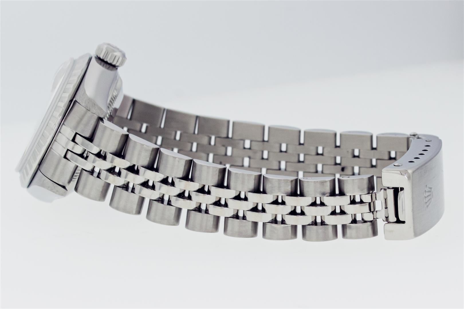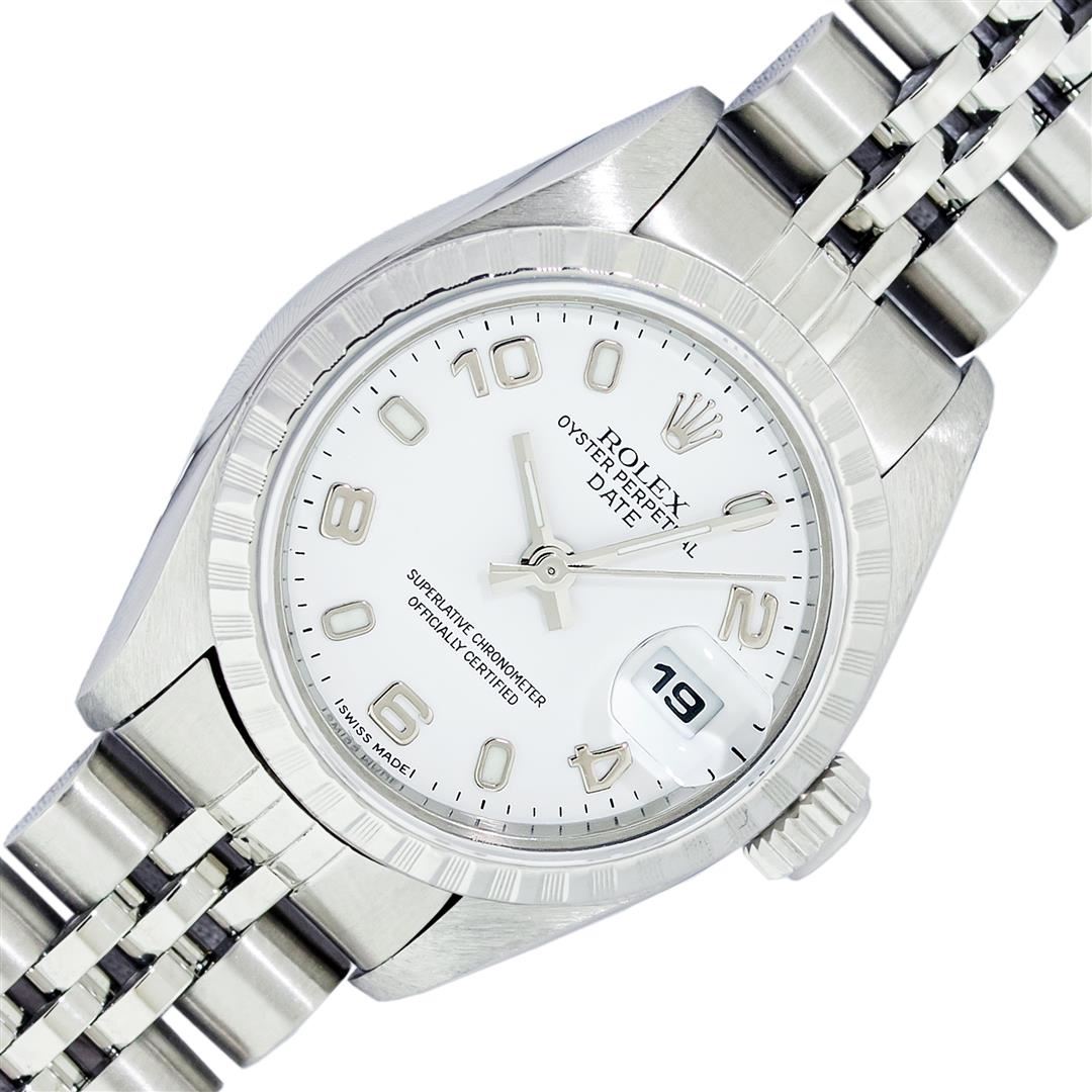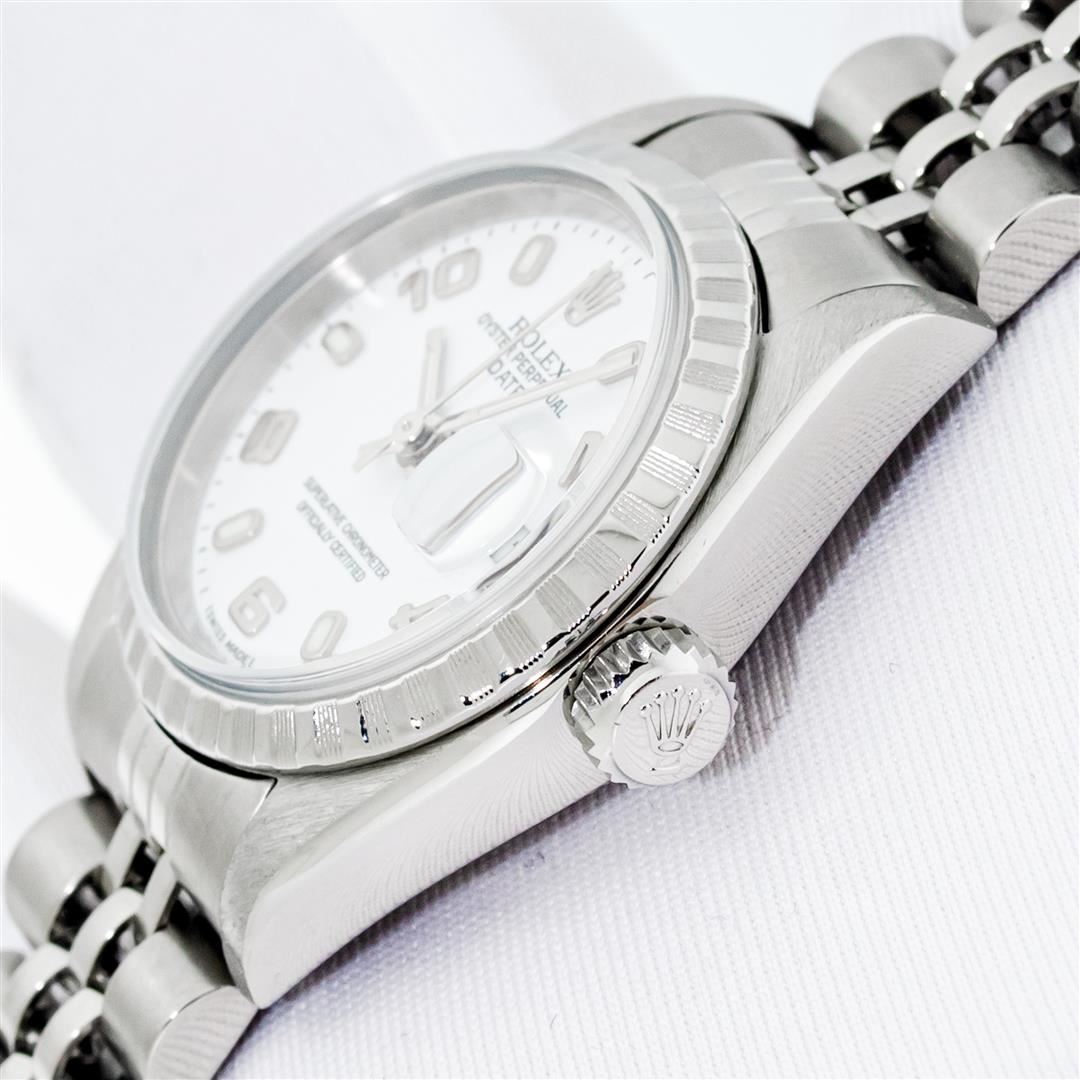 One Quickset Pre Owned Ladies Stainless Steel Rolex Date Polished Bright with Satin Finish, Serviced & Electronically Tested, Rolex Stainless Steel Case: 26mm, Rolex Stainless Steel Crown, Rolex Bezel: Stainless Steel Engine Turn Bezel, Crystal: Sapphire With Date Window. Hands: Luminescent Hands. Rolex Movement: Automatic Winding Movement 2235. Rolex Dial: White Arabic With Dash Track, Date Window: 3 O'Clock Position Date Display, Model: Quickset 2235 Datejust. Condition: G-6 Extra Fine. Rolex Bracelet: Stainless Steel Jubilee Band. Bright Polish & Satin Finish. 6.0 Inch Length, Adjustable. Standard Clasp, With Rolex Logo. This Watch Has Been Serviced Time Tested And Is In Excellent Condition It Is Free Of All Scratches And Dents.