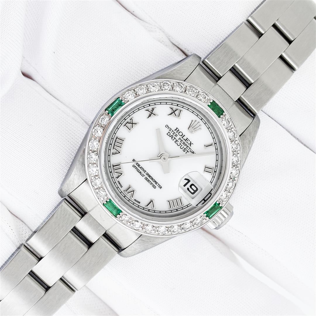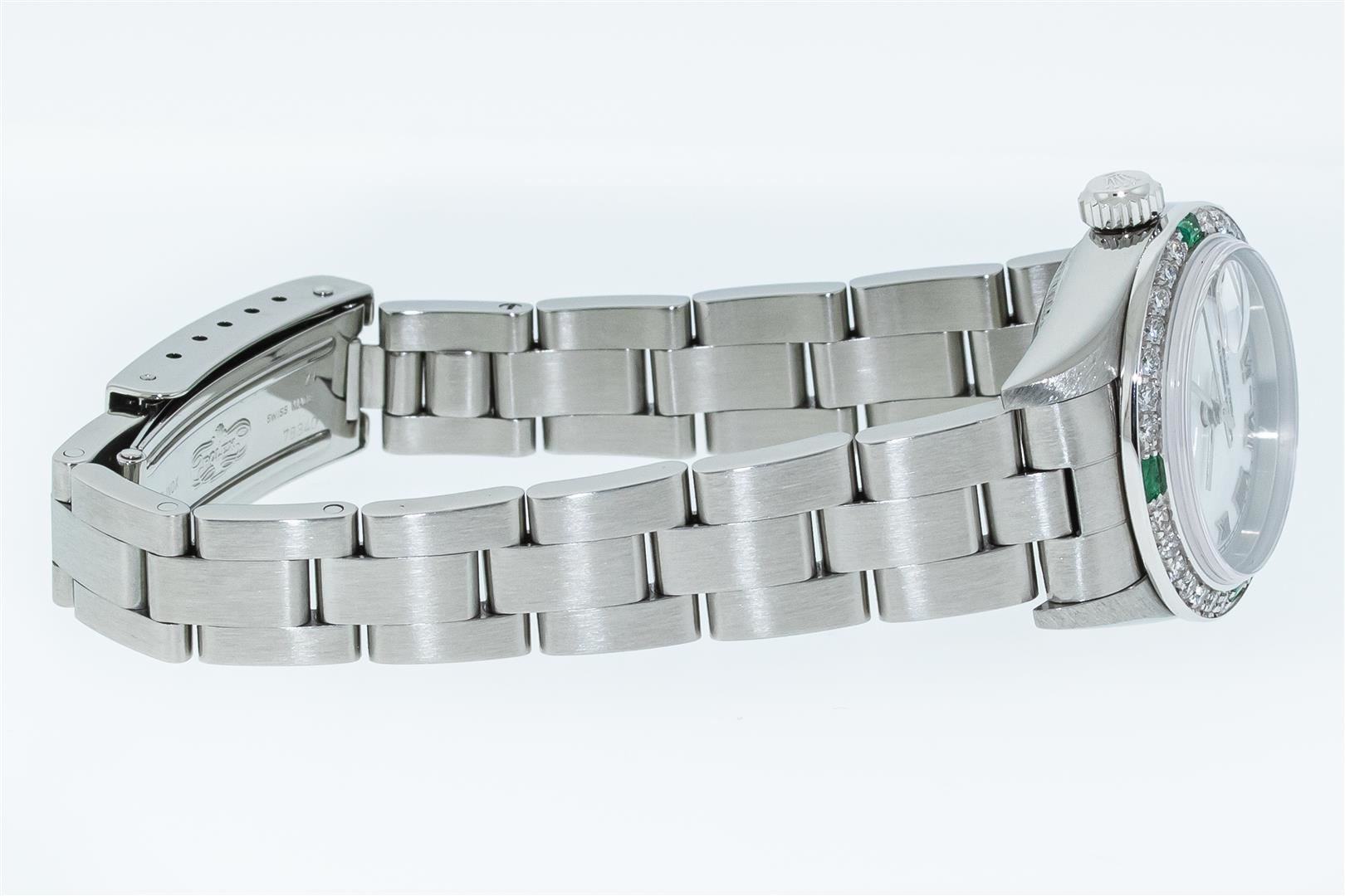 One Ladies Pre Owned Quickset Stainless Steel Rolex Datejust Polished Bright with Satin Finish, Serviced & Electronically Tested, Stainless Steel Case: 26mm, Rolex Stainless Steel Crown, Custom Bezel: New 18K White Gold Emerald Bead Set Diamond Bezel, Diamond + Gem Count: 28 Diamonds + 4 Emeralds, Clarity: SI-VS, Color: G to H. Custom Crystal: New Sapphire With Magnified Date Window. Custom Hands: New Hands. Rolex Movement: Automatic Winding Movement 2235. Rolex Dial: White With Roman Hour Markers & Square Track. Date Window: 3 O'Clock Position Date Display, Model: Quickset Datejust. Condition: G-6 Extra Fine. Rolex Bracelet: Stainless Steel Oyster Band. Bright Polish & Satin Finish. 6.0 Inch Length, Adjustable. Standard Clasp, With Rolex Logo. This Watch Has Been Serviced Time Tested And Is In Excellent Condition It Is Free Of All Scratches And Dents.