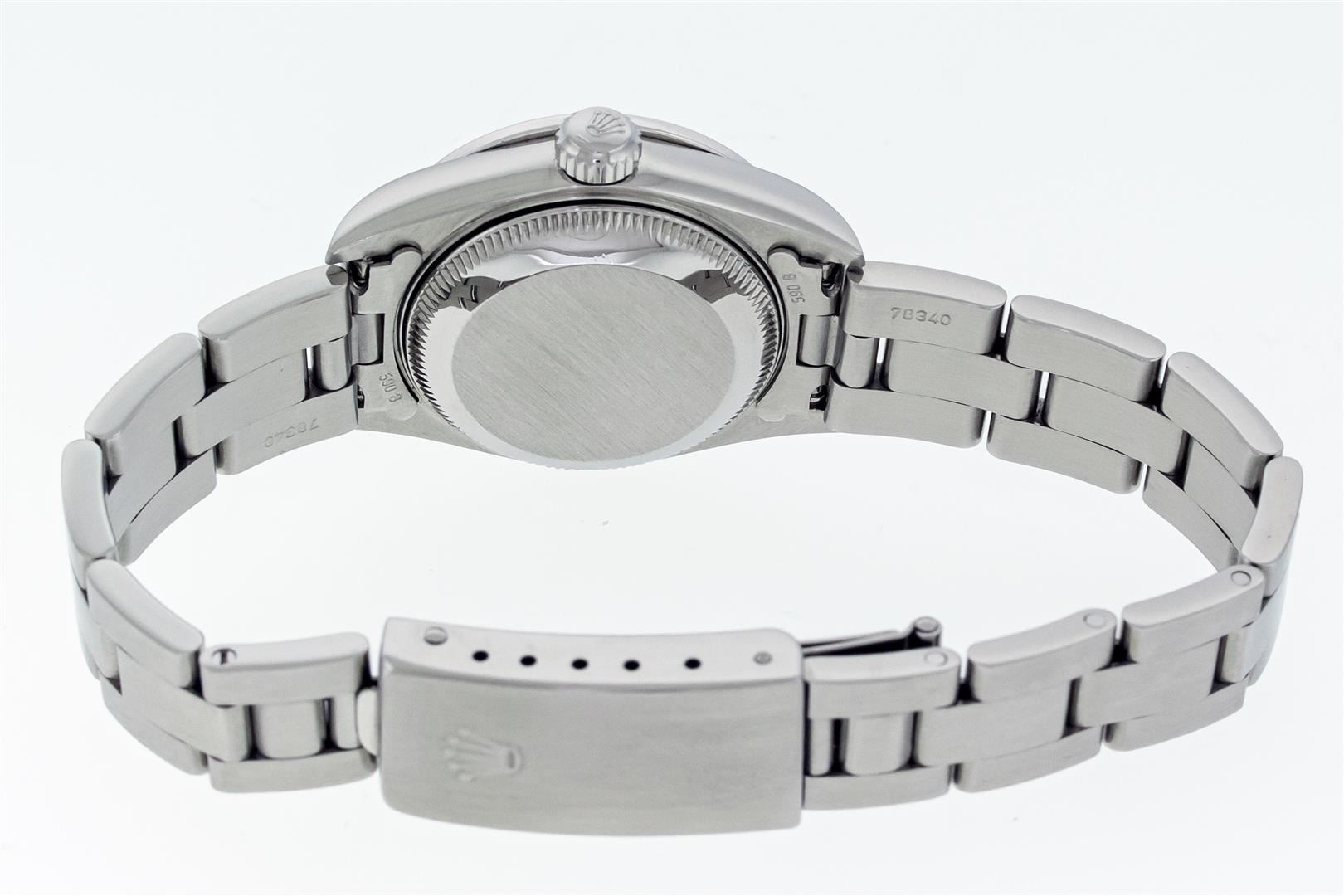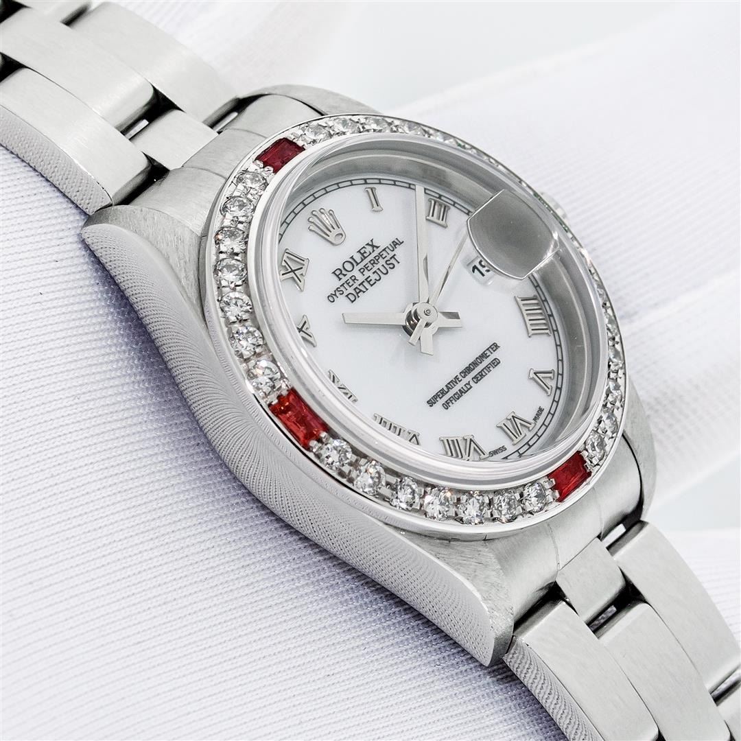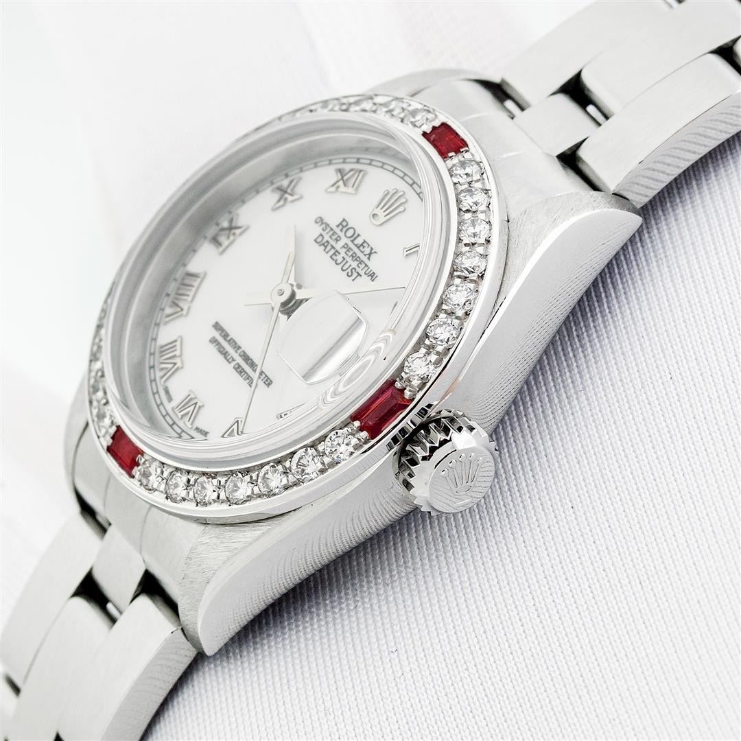 One Ladies Pre Owned Quickset Stainless Steel Rolex Datejust Polished Bright with Satin Finish, Serviced & Electronically Tested, Stainless Steel Case: 26mm, Rolex Stainless Steel Crown, Custom Bezel: New 18K White Gold Ruby Bead Set Diamond Bezel, Diamond + Gem Count: 28 Diamonds + 4 Rubies, Clarity: SI-VS, Color: G to H. Custom Crystal: New Sapphire With Magnified Date Window. Custom Hands: New Hands. Rolex Movement: Automatic Winding Movement 2235. Rolex Dial: White With Roman Hour Markers & Square Track. Date Window: 3 O'Clock Position Date Display, Model: Quickset Datejust. Condition: G-6 Extra Fine. Rolex Bracelet: Stainless Steel Oyster Band. Bright Polish & Satin Finish. 6.0 Inch Length, Adjustable. Standard Clasp, With Rolex Logo. This Watch Has Been Serviced Time Tested And Is In Excellent Condition It Is Free Of All Scratches And Dents.