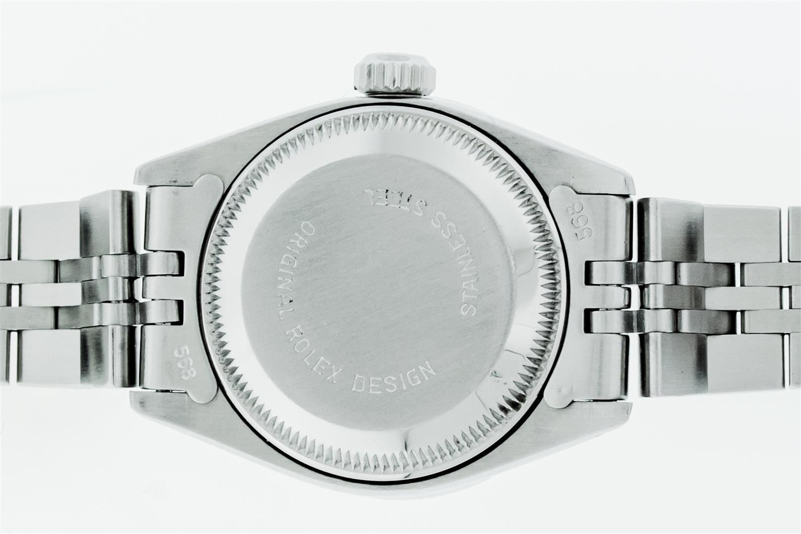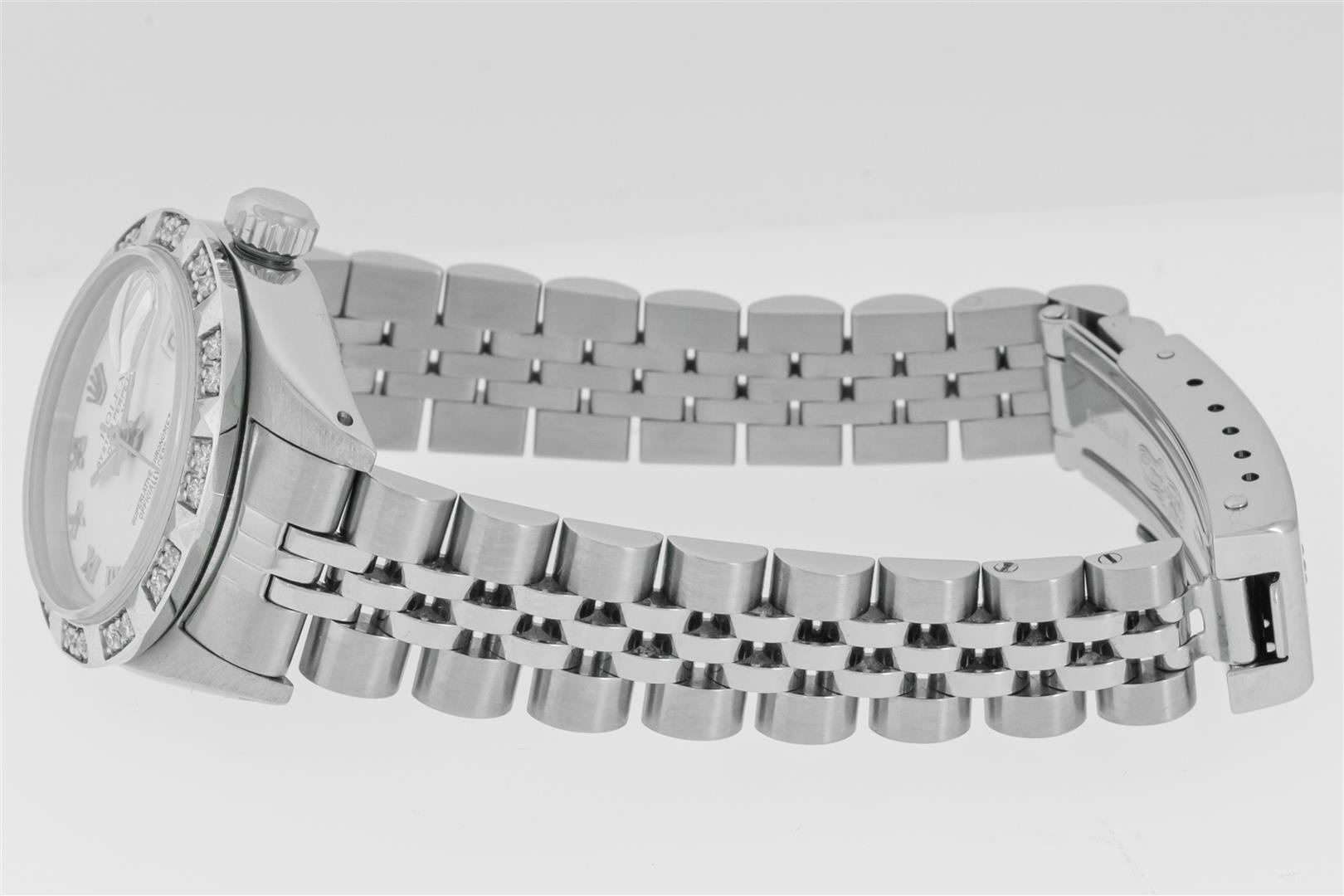 One Ladies Pre Owned Stainless Steel Quickset Rolex Datejust Polished Bright with Satin Finish, Serviced & Electronically Tested, Stainless Steel Case: 26mm, Stainless Steel Crown, Custom Bezel: New 18K White Gold Pyramid Diamond Bezel, Diamond Count: 24 Diamonds On Bezel. Total Weight .50 Carat, Clarity: SI-VS, Color: G to H. Custom Crystal: New Sapphire With Magnified Date Window. Custom Hands: New Luminescent Hands. Rolex Movement: Automatic Winding Movement. Rolex Dial: White Roman Dial. Date Window: 3 O'Clock Position Date Display, Model: Datejust. Condition: G-6 Extra Fine. Rolex Bracelet: Stainless Steel Jubilee Band With Rolex Crown On Buckle. Bright Polish & Satin Finish. Band Length: 6.0 Inch Length, Adjustable. Standard Clasp, With Rolex Logo. This Watch Has Been Serviced Time Tested And Is In Excellent Condition It Is Free Of All Scratches And Dents. This Watch Comes With A Rolex Box, Booklet And Wallet.