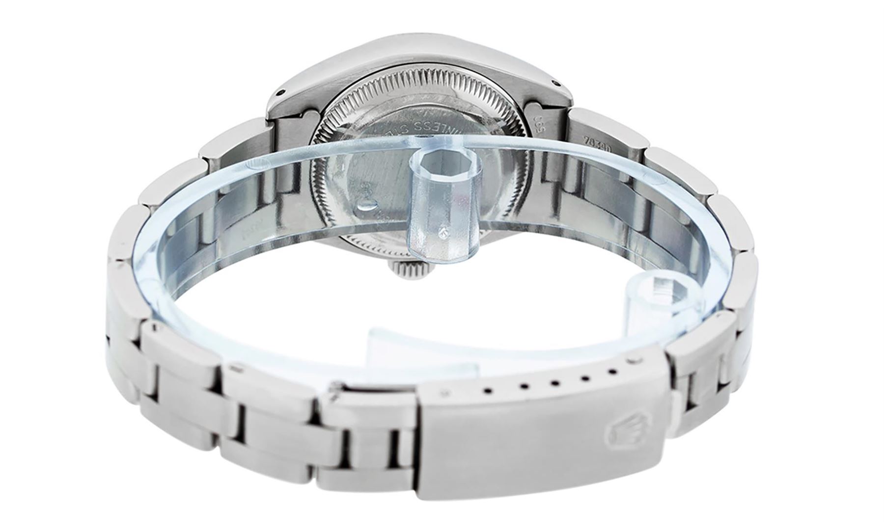 One Ladies Pre Owned Stainless Steel Rolex Datejust Polished Bright with Satin Finish, Serviced & Electronically Tested, Stainless Steel Case: 26mm, Stainless Steel Crown. Custom Bezel: New 18K White Gold Beadset & Sapphire Diamond Bezel, Diamond Count: 28 Diamonds + 4 Sapphires, Clarity: SI-VS, Color: G to H. Custom Crystal: New Sapphire With Date Window. Custom Hands: New Luminescent Hands. Rolex Movement: Automatic Winding Movement. Custom Dial: Blue Mother Of Pearl With Custom Added Diamonds, Stone Count: 43 Diamonds On Dial, G To H In Color, Clarity: SI-VS. Date Window: 3 O'Clock Position Date Display, Model: Datejust. Condition: G-6 Extra Fine. Rolex Bracelet: Stainless Steel Oyster Band. Bright Polish & Satin Finish. 6.0 Inch Length, Adjustable. Standard Clasp, With Rolex Logo. This Watch Has Been Serviced Time Tested And Is In Excellent Condition It Is Free Of All Scratches And Dents.