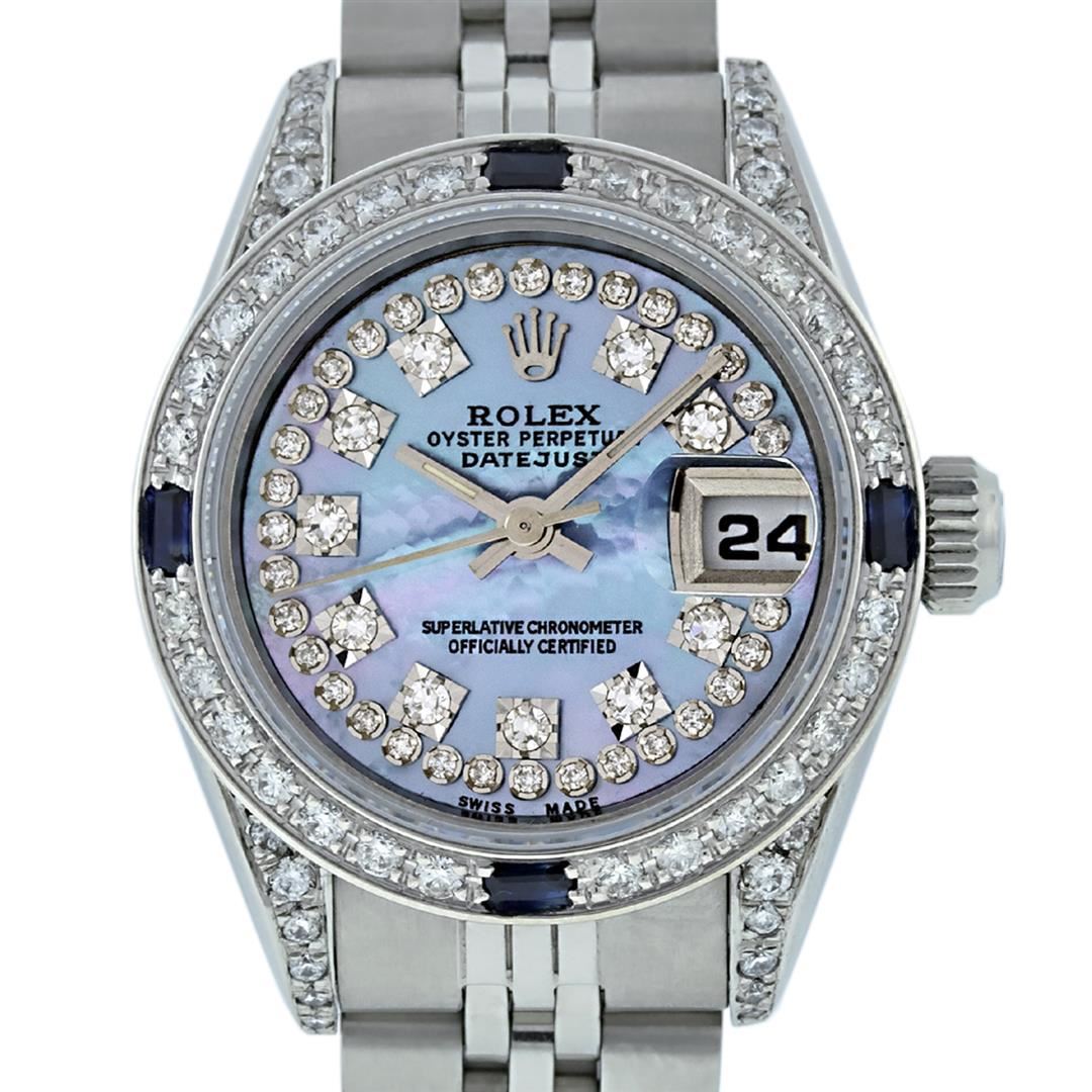 One Ladies Rolex Datejust Polished Bright with Satin Finish, Serviced & Electronically Tested, Stainless Steel Case:26mm, Stainless Steel Crown, Diamond Lugs: 16 Diamonds On Lugs, Clarity: SI-VS, Color: G to H. Custom Bezel: 18K White Gold Beadset Sapphire Bezel, Diamond Count: 28 Diamonds + 4 Sapphires, Total Weight 1.00 Carat, Clarity: SI-VS, Color: G to H. Custom Crystal: Synthetic Sapphire Cyclops Lens. Movement: Automatic Winding Movement Caliber 2235. Custom Dial: Refinished Blue Mother Of Pearl String Diamond Dial VS, 43 Diamonds in Dial G To H In Color, Clarity: VVS. Date Window: 3 O'Clock Position Date Display, Model: No Hole Datejust Quickset. Condition: G-6 Extra Fine. Bracelet: Stainless Steel Jubilee Band. Bright Polish & Satin Finish. 6.0 Inch Length, Adjustable. Standard Clasp, With Rolex Logo.
