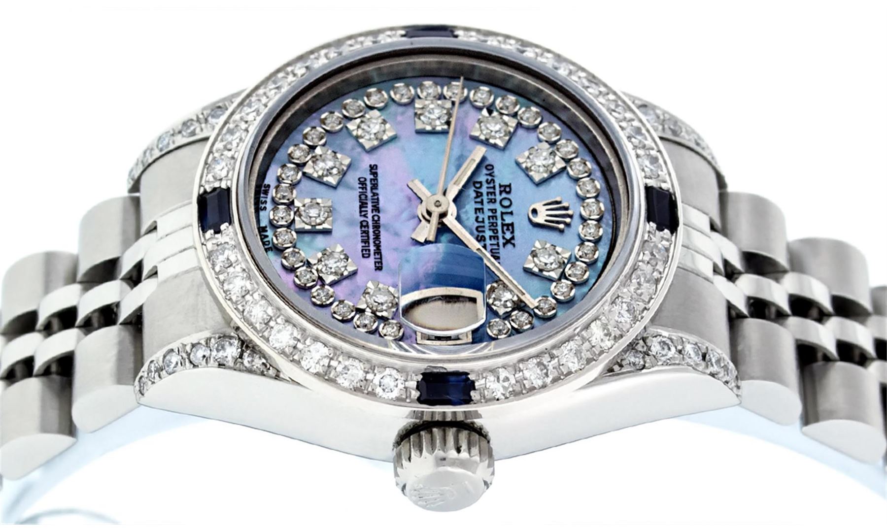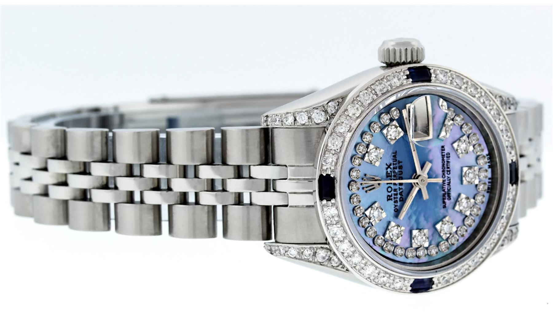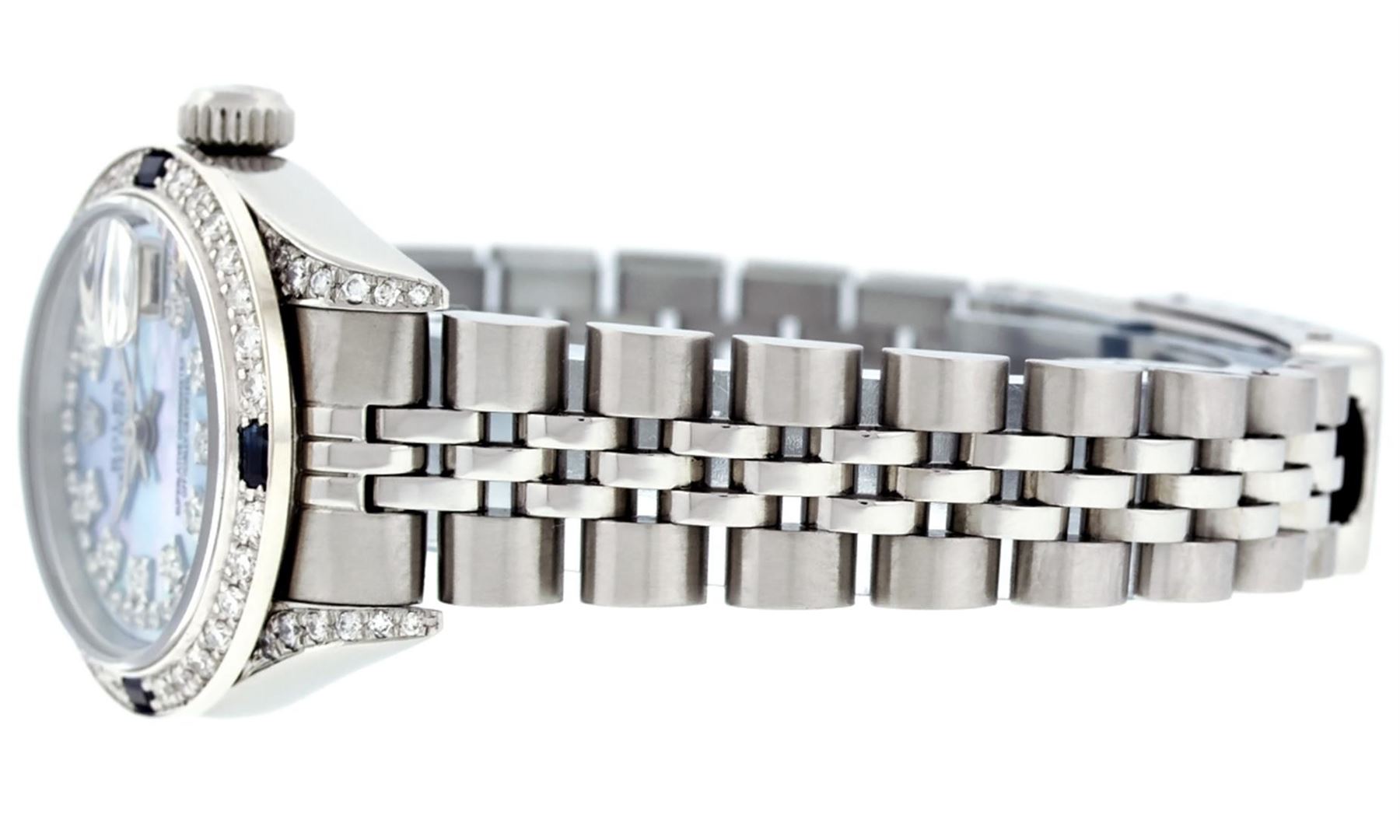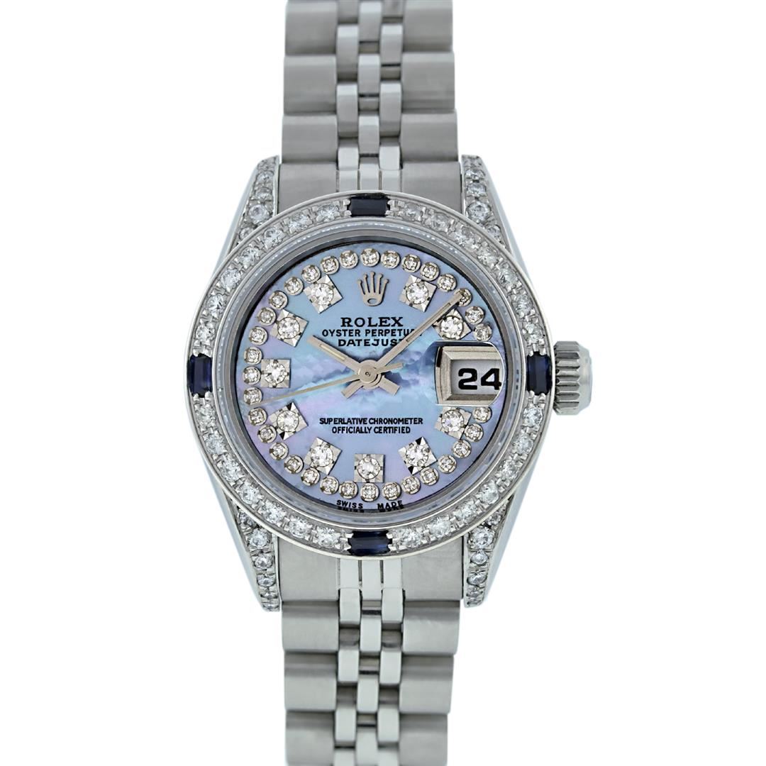 One Ladies Rolex Datejust Polished Bright with Satin Finish, Serviced & Electronically Tested, Stainless Steel Case:26mm, Stainless Steel Crown, Diamond Lugs: 16 Diamonds On Lugs, Clarity: SI-VS, Color: G to H. Custom Bezel: 18K White Gold Beadset Sapphire Bezel, Diamond Count: 28 Diamonds + 4 Sapphires, Total Weight 1.00 Carat, Clarity: SI-VS, Color: G to H. Custom Crystal: Synthetic Sapphire Cyclops Lens. Movement: Automatic Winding Movement Caliber 2235. Custom Dial: Refinished Blue Mother Of Pearl String Diamond Dial VS, 43 Diamonds in Dial G To H In Color, Clarity: VVS. Date Window: 3 O'Clock Position Date Display, Model: No Hole Datejust Quickset. Condition: G-6 Extra Fine. Bracelet: Stainless Steel Jubilee Band. Bright Polish & Satin Finish. 6.0 Inch Length, Adjustable. Standard Clasp, With Rolex Logo.