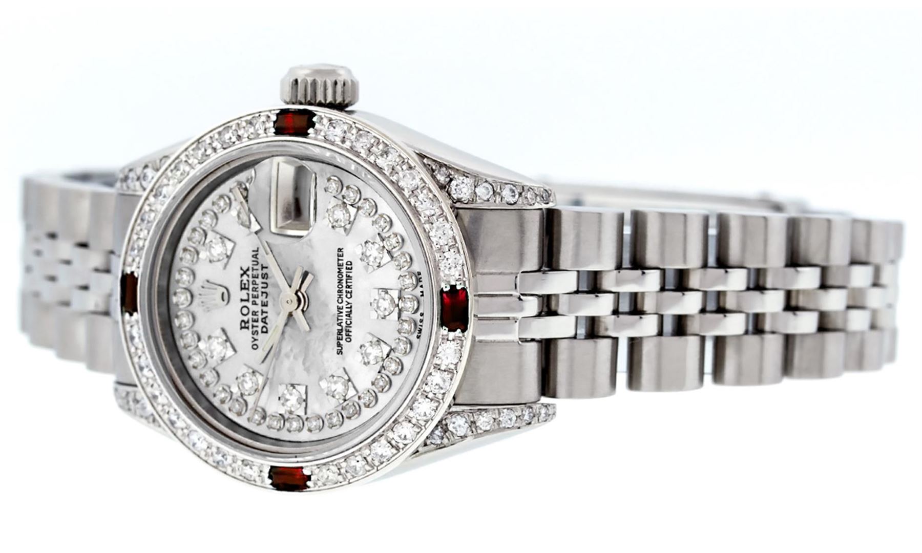 One Ladies Rolex Datejust Polished Bright with Satin Finish, Serviced & Electronically Tested, Stainless Steel Case:26mm, Stainless Steel Crown, Diamond Lugs: 16 Diamonds On Lugs, Clarity: SI-VS, Color: G to H. Custom Bezel: 18K White Gold Beadset Ruby Bezel, Diamond Count: 28 Diamonds + 4 Rubies, Total Weight 1.00 Carat, Clarity: SI-VS, Color: G to H. Custom Crystal: Synthetic Sapphire Cyclops Lens. Movement: Automatic Winding Movement Caliber 2235. Custom Dial: Refinished Mother Of Pearl String Diamond Dial VS, 43 Diamonds in Dial G To H In Color, Clarity: VS. Date Window: 3 O'Clock Position Date Display, Model: No Hole Datejust Quickset. Condition: G-6 Extra Fine. Bracelet: Stainless Steel Jubilee Band. Bright Polish & Satin Finish. 6.0 Inch Length, Adjustable. Standard Clasp, With Rolex Logo.