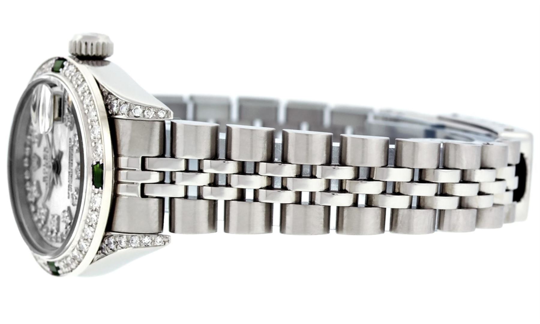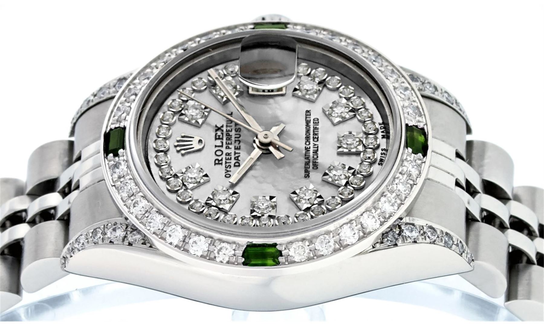 One Ladies Rolex Datejust Polished Bright with Satin Finish, Serviced & Electronically Tested, Stainless Steel Case:26mm, Stainless Steel Crown, Diamond Lugs: 16 Diamonds On Lugs, Clarity: SI-VS, Color: G to H. Custom Bezel: 18K White Gold Beadset Emerald Bezel, Diamond Count: 28 Diamonds + 4 Emeralds, Total Weight 1.00 Carat, Clarity: SI-VS, Color: G to H. Custom Crystal: Synthetic Sapphire Cyclops Lens. Movement: Automatic Winding Movement Caliber 2235. Custom Dial: Refinished Mother Of Pearl String Diamond Dial VS, 43 Diamonds in Dial G To H In Color, Clarity: VS. Date Window: 3 O'Clock Position Date Display, Model: No Hole Datejust Quickset. Condition: G-6 Extra Fine. Bracelet: Stainless Steel Jubilee Band. Bright Polish & Satin Finish. 6.0 Inch Length, Adjustable. Standard Clasp, With Rolex Logo.