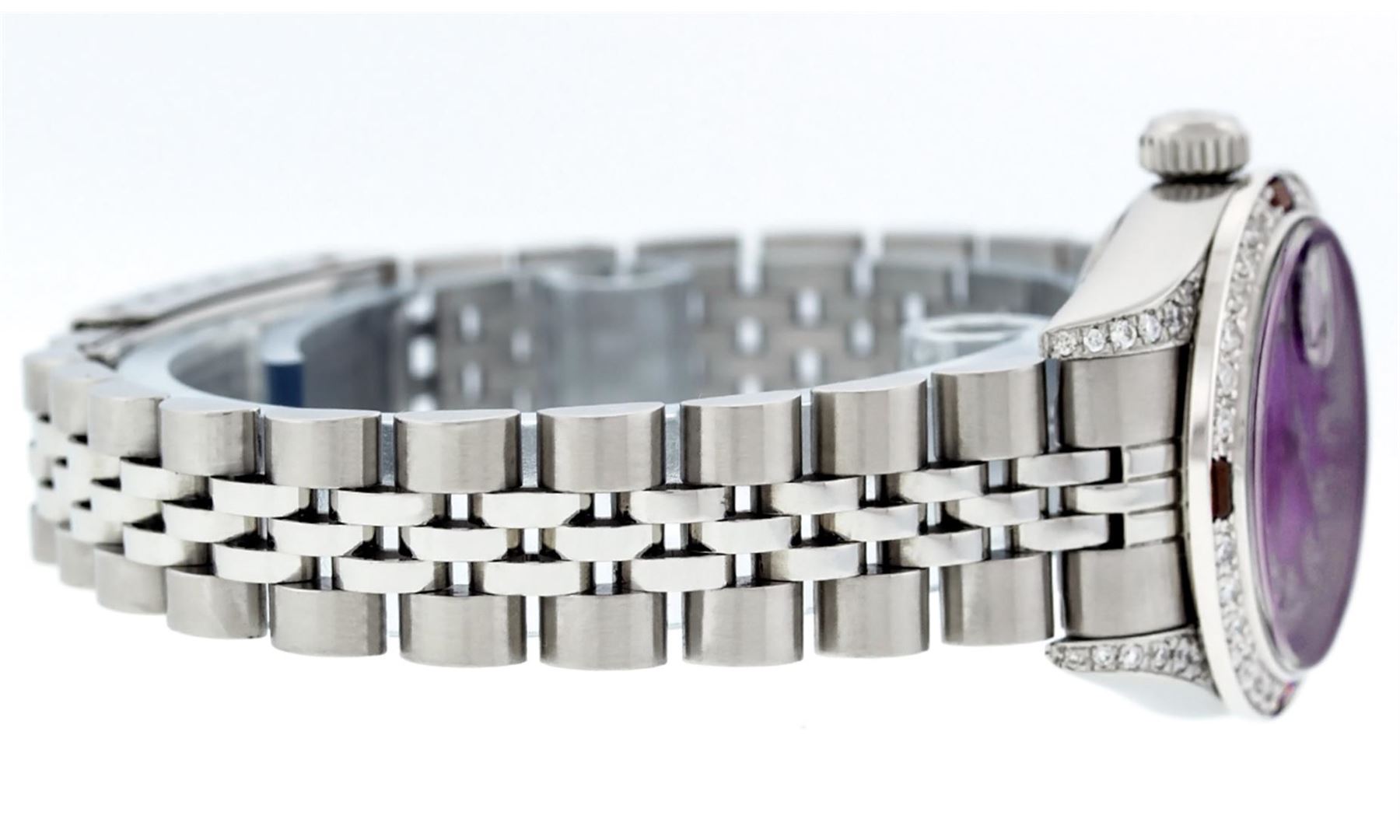 One Ladies Rolex Datejust Polished Bright with Satin Finish, Serviced & Electronically Tested, Stainless Steel Case:26mm, Stainless Steel Crown, Diamond Lugs: 16 Diamonds On Lugs, Clarity: SI-VS, Color: G to H. Custom Bezel: 18K White Gold Beadset Ruby Bezel, Diamond Count: 28 Diamonds + 4 Rubies, Total Weight 1.00 Carat, Clarity: SI-VS, Color: G to H. Custom Crystal: Synthetic Sapphire Cyclops Lens. Movement: Automatic Winding Movement Caliber 2235. Custom Dial: Refinished Purple Mother Of Pearl String Diamond Dial VS, 43 Diamonds in Dial G To H In Color, Clarity: VS. Date Window: 3 O'Clock Position Date Display, Model: No Hole Datejust Quickset. Condition: G-6 Extra Fine. Bracelet: Stainless Steel Jubilee Band. Bright Polish & Satin Finish. 6.0 Inch Length, Adjustable. Standard Clasp, With Rolex Logo.