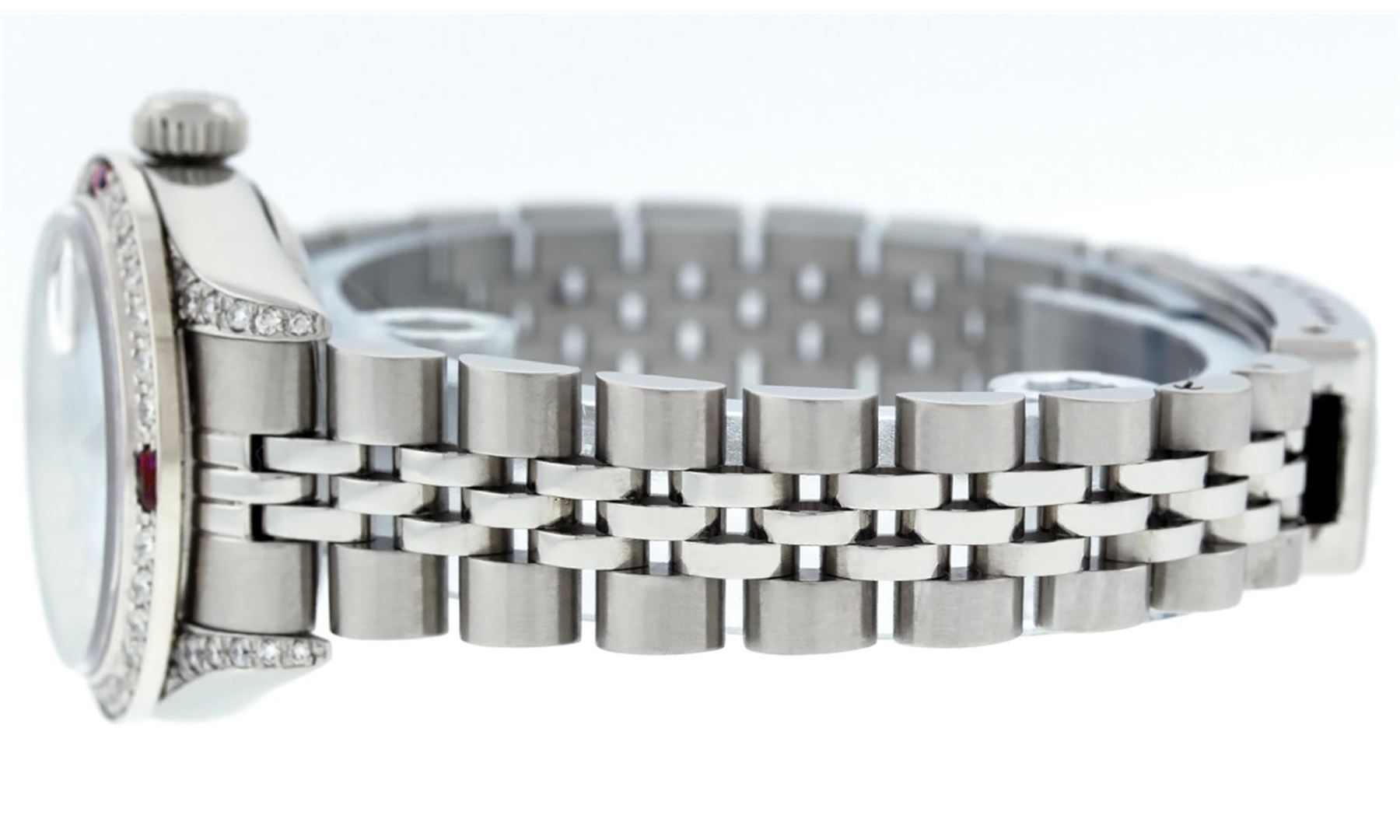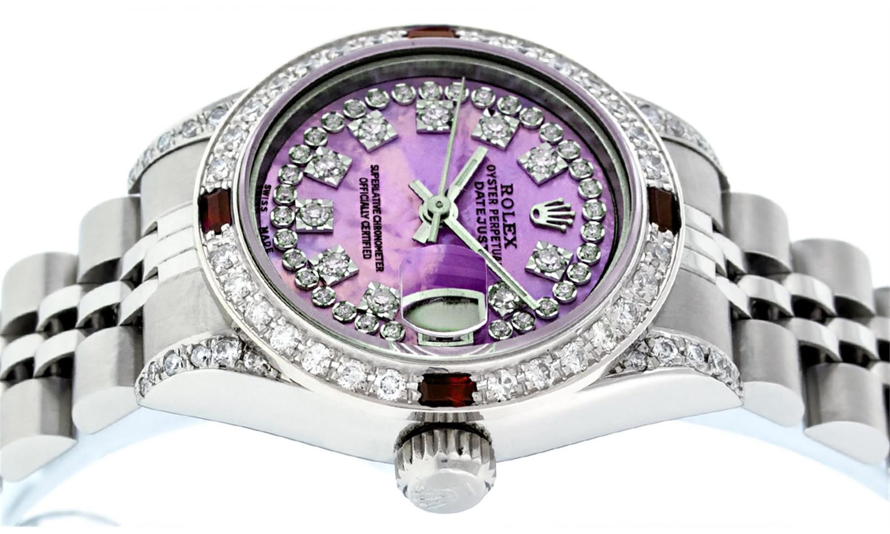 One Ladies Rolex Datejust Polished Bright with Satin Finish, Serviced & Electronically Tested, Stainless Steel Case:26mm, Stainless Steel Crown, Diamond Lugs: 16 Diamonds On Lugs, Clarity: SI-VS, Color: G to H. Custom Bezel: 18K White Gold Beadset Ruby Bezel, Diamond Count: 28 Diamonds + 4 Rubies, Total Weight 1.00 Carat, Clarity: SI-VS, Color: G to H. Custom Crystal: Synthetic Sapphire Cyclops Lens. Movement: Automatic Winding Movement Caliber 2235. Custom Dial: Refinished Purple Mother Of Pearl String Diamond Dial VS, 43 Diamonds in Dial G To H In Color, Clarity: VS. Date Window: 3 O'Clock Position Date Display, Model: No Hole Datejust Quickset. Condition: G-6 Extra Fine. Bracelet: Stainless Steel Jubilee Band. Bright Polish & Satin Finish. 6.0 Inch Length, Adjustable. Standard Clasp, With Rolex Logo.